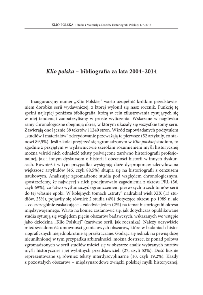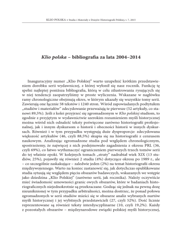 KLIO POLSKA • Studia i Materiały z Dziejów Historiografii Polskiej, t. 7, 2015 Klio polska – bibliografia za lata 2004–2014 Inauguracyjny numer „Klio Polskiej” warto uzupełnić krótkim przedstawieniem dorobku serii wydawniczej, z której wyłonił się nasz rocznik. Funkcję tę spełni najlepiej poniższa bibliografia, którą w celu zilustrowania rysujących się w niej tendencji zaopatrzyliśmy w proste wyliczenia. Wskazane w nagłówku ramy chronologiczne obejmują okres, w którym ukazały się wszystkie tomy serii. Zawierają one łącznie 58 tekstów i 1240 stron. Wśród zapowiadanych podtytułem „studiów i materiałów” zdecydowanie przeważają te pierwsze (52 artykuły, co stanowi 89,5%). Jeśli z kolei przyjrzeć się zgromadzonym w Klio polskiej studiom, to zgodnie z przyjętym w wydawnictwie szerokim rozumieniem myśli historycznej można wśród nich odnaleźć teksty poświęcone zarówno historiografii profesjonalnej, jak i innym dyskursom o historii i obecności historii w innych dyskursach. Również i w tym przypadku występują duże dysproporcje: zdecydowana większość artykułów (46, czyli 88,5%) skupia się na historiografii z cenzusem naukowym. Analizując zgromadzone studia pod względem chronologicznym, spostrzeżemy, że najwięcej z nich podejmowało zagadnienia z okresu PRL (36, czyli 69%), co łatwo wytłumaczyć ograniczeniem pierwszych trzech tomów serii do tej właśnie epoki. W kolejnych tomach „straty” nadrabiał wiek XIX (13 studiów, 25%), pojawiły się również 2 studia (4%) dotyczące okresu po 1989 r., ale – co szczególnie zaskakujące – zaledwie jeden (2%) na temat historiografii okresu międzywojennego. Warto na koniec zastanowić się, jak dotychczas opublikowane studia sytuują się względem pięciu obszarów badawczych, wskazanych we wstępie jako dziedzina „Klio Polskiej” (zarówno serii, jak rocznika). Należy oczywiście mieć świadomość umowności granic owych obszarów, które w badaniach historiograficznych niejednokrotnie są przekraczane. Godząc się jednak na pewną dozę nieuniknionej w tym przypadku arbitralności, można dostrzec, że ponad połowa zgromadzonych w serii studiów mieści się w obszarze analiz wybranych nurtów myśli historycznej i jej wybitnych przedstawicieli (27, czyli 52%). Dość licznie reprezentowane są również teksty interdyscyplinarne (10, czyli 19,2%). Każdy z pozostałych obszarów – międzynarodowe związki polskiej myśli historycznej, Klio polska – bibliografia za lata 2004–2014 12 jej teoretyczno-metodologiczne uwarunkowanie oraz aspekt instytucjonalno-organizacyjny – jest reprezentowany przez 5 tekstów (3 x 9,6%). Aby liczby te powiedziały więcej o stosunku „Klio Polskiej” do przemian polskiej historiografii, należałoby je porównać z innymi (np. danymi Bibliografii Historii Polski), co nie jest ambicją tego prowizorycznego podsumowania. Jednak nawet same przytoczone tu wyliczenia, zestawione z rozpoznaniem tendencji w najnowszej historiografii dokonanym przez jej wnikliwego komentatora1, pozwalają na wysunięcie kilku wniosków. Po pierwsze, jeśli trafna jest ocena Rafała Stobieckiego, że historia historiografii potrzebuje bardziej zauważalnej obecności w internecie, to warto, aby „Klio Polska” w większym stopniu łączyła tradycję badań historiograficznych ze współczesnymi sposobami wykorzystywania i opowiadania o historii. Wymagałoby to szerszego otwarcia na prace historyczne powstałe po 1989 r., historiografię bez cenzusu akademickiego oraz stosowanie ujęć interdyscyplinarnych. Po drugie, w trosce o wspomnianą przed chwilą tradycję należałoby więcej uwagi poświęcić badaniom historiografii dwudziestolecia międzywojennego. Czas pokaże, w jakim zakresie na te wyzwania odpowie nowy rocznik i jego autorzy. Poniższa bibliografia została uporządkowana alfabetycznie w dwóch działach, odpowiadających podtytułowi serii: studia i materiały. Liczby zamieszczone po artykułach oznaczają kolejny tom Klio polskiej (cyfra rzymska) oraz strony (cyfry arabskie). 1. Studia K. Błachowska, Rosja w historiografii polskiej pierwszych lat powojennych (1945–1956) [I, 147– –169] Taż, Romana Lutmana spojrzenie na metodę [II, 33–44] Taż, Państwo umarłego narodu – Józef Ignacy Kraszewski o Wielkim Księstwie Litewskim i Litwinach [III, 11–24] Taż, Feliks Koneczny jako historyk Rosji – podstawy koncepcji [VI, 169–197] K. Cebul, Historia i historycy polscy w publicystyce Zjednoczenia Patriotycznego „Grunwald” [IV, 193–217] A. Czyżewski, Historycy polscy wobec destalinizacji – próba typologii postaw [III, 187–211] M. Filipowicz, Mieczysław Żywczyński – dylematy historyka i kapłana w PRL [II, 45–65] M. Górny, Od Lelewela do Smoleńskiego. Spory historiograficzne lat pięćdziesiątych [II, 149–177] Tenże, „Polacy uwielbiają swoje kobiety”. Płeć narodu w refleksji charakterologicznej okresu I wojny światowej i jej polskie refleksy [V, 27–63] Tenże, Próby profesjonalizacji refleksji nad charakterem narodowym w XIX wieku [VI, 11–37] V. Julkowska, Debiut historyczny Karola Szajnochy w ocenie współczesnych. Problem recepcji dzieła historycznego [IV, 11–37] Por. np. R. Stobiecki, Jakiej historii historiografii nam potrzeba?, „Kultura i Historia” 2014, nr 25, http://www.kulturaihistoria.umcs.lublin.pl/archives/5239, 20 X 2015 r. 1 Klio polska – bibliografia za lata 2004–2014 13 Taż, Polski esej historyczny w XIX i XX wieku. Cz. I: Szkice historyczne Szajnochy i Kubali – narodziny polskiego eseju historycznego [V, 63–95] Taż, Polski esej historyczny w XIX i XX wieku. Cz. II: Funkcje dwudziestowiecznej eseistyki historycznej [VI, 197–219] B. Klassa, Obraz szlachty w Dziejach Polski w zarysie Michała Bobrzyńskiego [IV, 57–79] J. Kolbuszewska, Pozytywizm czy modernizacja? Teoretyczno-metodologiczne poglądy Tadeusza Korzona na łamach Wielkiej enc