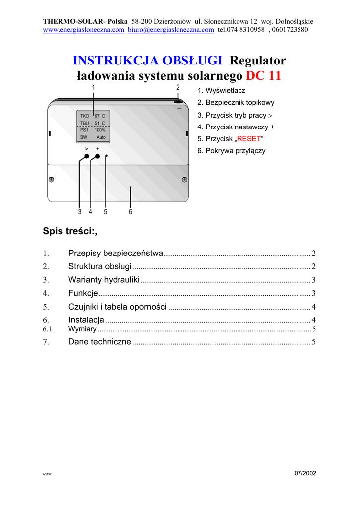 THERMO-SOLAR- Polska 58-200 Dzierżoniów ul. Słonecznikowa 12 woj. Dolnośląskie www.energiasloneczna.com [email protected] tel.074 8310958 , 0601723580 INSTRUKCJA OBSŁUGI Regulator ładowania systemu solarnego DC 11 1. Wyświetlacz 2. Bezpiecznik topikowy 3. Przycisk tryb pracy > 4. Przycisk nastawczy + 5. Przycisk „RESET“ 6. Pokrywa przyłączy Spis treści:, 1. Przepisy bezpieczeństwa...................................................................... 2 2. Struktura obsługi..................................................................................... 2 3. Warianty hydrauliki ................................................................................. 3 4. Funkcje..................................................................................................... 3 5. Czujniki i tabela oporności .................................................................... 4 6. Instalacja.................................................................................................. 4 6.1. Wymiary ...................................................................................................................... 5 7. Dane techniczne ..................................................................................... 5 A0137 07/2002 Instrukcja obsługi i eksploatacja mikroprocesorowego regulatora ładowania systemu solarnego z uzupełniającymi funkcjami DC 11 2/2 1. Przepisy bezpieczeństwa Użytkujemy urządzenie zgodnie z jego przeznaczeniem. Regulator jest urządzeniem elektronicznym przeznaczonym do użycia razem z hydraulicznym obwodem zgodnie z kompletną specyfikacją producenta. Inne sposoby użycia urządzenia są zabronione. Regulator wykonany jest zgodnie z wytycznymi EU: • 73/23/EWG „Wytyczne niskonapięciowe“ • 89/336/EWG „Wytyczne EMV“, łącznie ze zmianami 92/31/EWG Niebezpieczeństwo i zagrożenia. Regulator podłączony jest do prądu elektrycznego. Nierzetelna instalacja lub niefachowo prowadzone próby mogą zagrażać życiu przez porażenie prądem elektrycznym. Regulator może być instalowany i uruchamiany wyłącznie przez wykwalifikowany personel posiadający odpowiednie kwalifikacje. Naprawy dokonuje tylko i wyłącznie producent. Lewy przycisk: Wybór trybu regulacji. „Time out“2 min.: informuje wskazanie standartowe 2. A0137 Prawy przycisk: Nastawianie, zmiana trybu pracy Struktura obsługi 07/2002 Instrukcja obsługi i eksploatacja mikroprocesorowego regulatora ładowania systemu solarnego z uzupełniającymi funkcjami DC 11 3/3 Wariant hydrauliki 3. Objaśnienia skrótów i definicji: PS Pompa obiegowa (solarna) TBU Czujnik temperatury wody TKO Czujnik temperatury kolektora BW Rodzaj pracy Auto = automatyka EIN = Pompa włączona . (100 % obrotów) AUS = regulator wyłączony.(tylko informacja)j Tma 85° C Max. Temperatura zasobnika 20 - 90°C dTE 15K Przewyższenie 0-40 K (załączone) dTA 5K Przewyższenie 0-40 K (wyłączone) Ph Faza N Przewody zerowe Uziemienie Uziemienie X1 Listwa zacisków obwodów wyjściowych 5 4 3 2 1 L N N PS Ph N N N N Ω Ω N Ω Ω Ω Ω 2 1 Uziemienie X2 Listwa zacisków czujników 18 17 16 15 14 13 12 11 10 9 8 7 6 5 TBU 4. 4 3 TKO Funkcje Włączenie pompy solarnej (obiegowej) systemu solarnego następuje wówczas, jeżeli różnica temperatur pomiędzy czujnikiem kolektora TKO i czujnikiem zasobnika TBU jest wyższa niż ustawiona żądana wartość dTE. Pompa obiegowa wyłączy się, jeżeli różnica ta jest mniejsza od nastawionej żądanej wartości dTA. Przy pomocy sterowania zmianą obrotów pompy obiegowej następuje próba utrzymania ustawionej temperatury ładowania na czujniku kolektora TKO. Wartość żądana określona jest wzorem: TBU + ˝ x dTE + dTA lub TBU+1/2(x dTE+dTA) Jeżeli zostanie przekroczona maksymalna temperatura wody Tma w zasobniku, pompa obiegowa wyłączy się. Kiedy temperatura na kolektorze wzrośnie powyżej 130° C pompa również się wyłączy . A0137 07/2002 Instrukcja obsługi i eksploatacja mikroprocesorowego regulatora ładowania systemu solarnego z uzupełniającymi funkcjami DC 11 4/4 Czujniki i tabela oporności 5. Element czujnika NTC 5000 Ω przy 25 °C Czujnik Typ Długość kabla Czułość Zanurzony czujnik. TKO Zanurzony czujnik ZTF 223.1 1, 5 m 0-+70°C +/-0,5°C -50 - +180°C ZTF 222.2 2, 5 m 0-+70°C +/-0,8°C -50 - + 90°C Temperatura pracy Temperatura Oporność Temperatura Oporność Temperatura Oporność Temperatura Oporność °C -20 -18 -16 -14 -12 -10 -8 -6 -4 -2 0 6. Ω 48´536 43´247 38´592 34´489 30´866 27´663 24´827 22´313 20´079 18´094 16´325 °C 2 4 6 8 10 12 14 16 18 20 22 Ω 14´479 13´342 12´085 10´959 9´950 9´045 8´231 7´499 6´840 6´246 5´710 °C 24 26 30 35 40 45 50 55 60 65 70 Ω 5´225 4´787 4´029 3´266 2´263 2´184 1´801 1´493 1´244 1´042 876 °C 75 80 85 90 95 100 105 110 120 130 140 Ω 740 628 535 458 393 339 294 255 195 150 118 Instalacja Instalacja i zabezpieczenie regulatora muszą odpowiadać przepisom ii Polskiej Normie. Regulator solarny musi być podłączony na stałe do prądu, w celu stałego zapewnienia funkcji ładowania ciepła do zasobnika C.W.U. Przed uruchomieniem urządzenia należy upewnić się czy wszystkie elementy zostały prawidłowo podłączone elektrycznie. W przypadku silnych zakłóceń indukcyjnych i magnetycznych wywołanych przez urządzenia towarzyszące (bezpieczniki, inne pompy obiegowe, zawory elektromagnetyczne itp.) zaleca się zamontowanie elementów przeciwzakłóceniowych typu RC bezpośrednio na zaciskach elementów zakłócających. Zaleca się zastosowanie gotowych elementów 0,047 µF, 100 Ω na 250 VAC firmy (Bosch, RIFA, itď.) A0137 07/2002 Instrukcja obsługi i eksploatacja mikroprocesorowego regulatora ładowania systemu solarnego z uzupełniającymi funkcjami DC 11 5/5 Informacje o montażu 1. Po wywierceniu trzech otworów montażowych, górną śrubę „A” Wkręcamy na odpowiednią długość tak ażeby zawiesić na niej regulator.