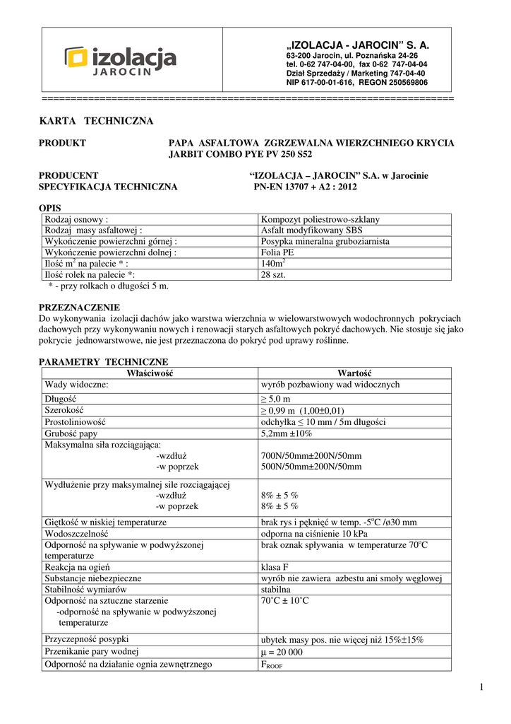 „IZOLACJA - JAROCIN” S. A. 63-200 Jarocin, ul. Poznańska 24-26 tel. 0-62 747-04-00, fax 0-62 747-04-04 Dział Sprzedaży / Marketing 747-04-40 NIP 617-00-01-616, REGON 250569806 ======================================================================= KARTA TECHNICZNA PRODUKT PAPA ASFALTOWA ZGRZEWALNA WIERZCHNIEGO KRYCIA JARBIT COMBO PYE PV 250 S52 PRODUCENT SPECYFIKACJA TECHNICZNA OPIS Rodzaj osnowy : Rodzaj masy asfaltowej : Wykończenie powierzchni górnej : Wykończenie powierzchni dolnej : Ilość m2 na palecie * : Ilość rolek na palecie *: * - przy rolkach o długości 5 m. “IZOLACJA – JAROCIN” S.A. w Jarocinie PN-EN 13707 + A2 : 2012 Kompozyt poliestrowo-szklany Asfalt modyfikowany SBS Posypka mineralna gruboziarnista Folia PE 140m2 28 szt. PRZEZNACZENIE Do wykonywania izolacji dachów jako warstwa wierzchnia w wielowarstwowych wodochronnych pokryciach dachowych przy wykonywaniu nowych i renowacji starych asfaltowych pokryć dachowych. Nie stosuje się jako pokrycie jednowarstwowe, nie jest przeznaczona do pokryć pod uprawy roślinne. PARAMETRY TECHNICZNE Właściwość Wady widoczne: Długość Szerokość Prostoliniowość Grubość papy Maksymalna siła rozciągająca: -wzdłuż -w poprzek Wydłużenie przy maksymalnej sile rozciągającej -wzdłuż -w poprzek Giętkość w niskiej temperaturze Wodoszczelność Odporność na spływanie w podwyższonej temperaturze Reakcja na ogień Substancje niebezpieczne Stabilność wymiarów Odporność na sztuczne starzenie -odporność na spływanie w podwyższonej temperaturze Przyczepność posypki Przenikanie pary wodnej Odporność na działanie ognia zewnętrznego Wartość wyrób pozbawiony wad widocznych ≥ 5,0 m ≥ 0,99 m (1,00±0,01) odchyłka ≤ 10 mm / 5m długości 5,2mm ±10% 700N/50mm±200N/50mm 500N/50mm±200N/50mm 8% ± 5 % 8% ± 5 % brak rys i pęknięć w temp. -5oC /ø30 mm odporna na ciśnienie 10 kPa brak oznak spływania w temperaturze 70oC klasa F wyrób nie zawiera azbestu ani smoły węglowej stabilna 70˚C ± 10˚C ubytek masy pos. nie więcej niż 15%±15% µ = 20 000 FROOF 1 INFORMACJE DLA UŻYTKOWNIKA Warunki układania: Prace dekarskie prowadzić w temperaturze powyżej +5oC (przygotowanie rolek +18oC /24 godz.) Nie należy układać papy w przypadku mokrej powierzchni dachu, jej oblodzenia, podczas opadów atmosferycznych oraz przy silnym wietrze. Warunki stosowania: Układać metodą zgrzewania po uprzednim zagruntowaniu podłoża roztworem asfaltowym wg wytycznych producenta. Nie mocować mechanicznie. Wykonanie izolacji wodochronnych z zastosowaniem papy powinno odbywać się według projektu technicznego opracowanego zgodnie z obowiązującymi przepisami budowlanymi, z uwzględnieniem szczegółowych wytycznych zawartych w instrukcjach producenta. PRZECHOWYWANIE Palety z rolkami należy przechowywać w pomieszczeniach krytych chroniących przed zawilgoceniem, w miejscu zabezpieczonym przed działaniem promieni słonecznych. Palety ustawiać w jednej warstwie. TRANSPORT Palety z rolkami należy przewozić krytymi środkami transportu, ładowane w jednej warstwie w pozycji stojącej obok siebie, zabezpieczone przed przemieszczeniem i uszkodzeniami. DOKUMENTACJA • Deklaracja zgodności • Informacja Techniczna Jarocin, dnia 30.01.2013r 2