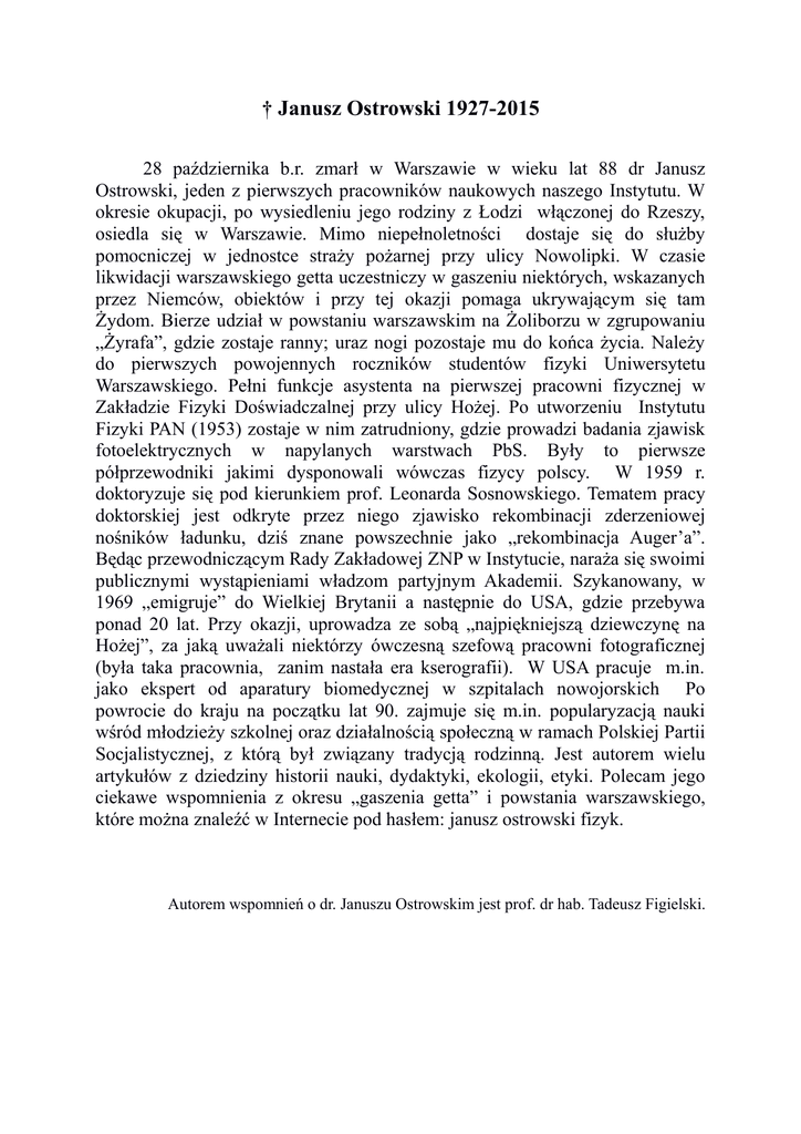 † Janusz Ostrowski 1927-2015 28 października b.r. zmarł w Warszawie w wieku lat 88 dr Janusz Ostrowski, jeden z pierwszych pracowników naukowych naszego Instytutu. W okresie okupacji, po wysiedleniu jego rodziny z Łodzi włączonej do Rzeszy, osiedla się w Warszawie. Mimo niepełnoletności dostaje się do służby pomocniczej w jednostce straży pożarnej przy ulicy Nowolipki. W czasie likwidacji warszawskiego getta uczestniczy w gaszeniu niektórych, wskazanych przez Niemców, obiektów i przy tej okazji pomaga ukrywającym się tam Żydom. Bierze udział w powstaniu warszawskim na Żoliborzu w zgrupowaniu „Żyrafa”, gdzie zostaje ranny; uraz nogi pozostaje mu do końca życia. Należy do pierwszych powojennych roczników studentów fizyki Uniwersytetu Warszawskiego. Pełni funkcje asystenta na pierwszej pracowni fizycznej w Zakładzie Fizyki Doświadczalnej przy ulicy Hożej. Po utworzeniu Instytutu Fizyki PAN (1953) zostaje w nim zatrudniony, gdzie prowadzi badania zjawisk fotoelektrycznych w napylanych warstwach PbS. Były to pierwsze półprzewodniki jakimi dysponowali wówczas fizycy polscy. W 1959 r. doktoryzuje się pod kierunkiem prof. Leonarda Sosnowskiego. Tematem pracy doktorskiej jest odkryte przez niego zjawisko rekombinacji zderzeniowej nośników ładunku, dziś znane powszechnie jako „rekombinacja Auger’a”. Będąc przewodniczącym Rady Zakładowej ZNP w Instytucie, naraża się swoimi publicznymi wystąpieniami władzom partyjnym Akademii. Szykanowany, w 1969 „emigruje” do Wielkiej Brytanii a następnie do USA, gdzie przebywa ponad 20 lat. Przy okazji, uprowadza ze sobą „najpiękniejszą dziewczynę na Hożej”, za jaką uważali niektórzy ówczesną szefową pracowni fotograficznej (była taka pracownia, zanim nastała era kserografii). W USA pracuje m.in. jako ekspert od aparatury biomedycznej w szpitalach nowojorskich Po powrocie do kraju na początku lat 90. zajmuje się m.in. popularyzacją nauki wśród młodzieży szkolnej oraz działalnością społeczną w ramach Polskiej Partii Socjalistycznej, z którą był związany tradycją rodzinną. Jest autorem wielu artykułów z dziedziny historii nauki, dydaktyki, ekologii, etyki. Polecam jego ciekawe wspomnienia z okresu „gaszenia getta” i powstania warszawskiego, które można znaleźć w Internecie pod hasłem: janusz ostrowski fizyk. Autorem wspomnień o dr. Januszu Ostrowskim jest prof. dr hab. Tadeusz Figielski.