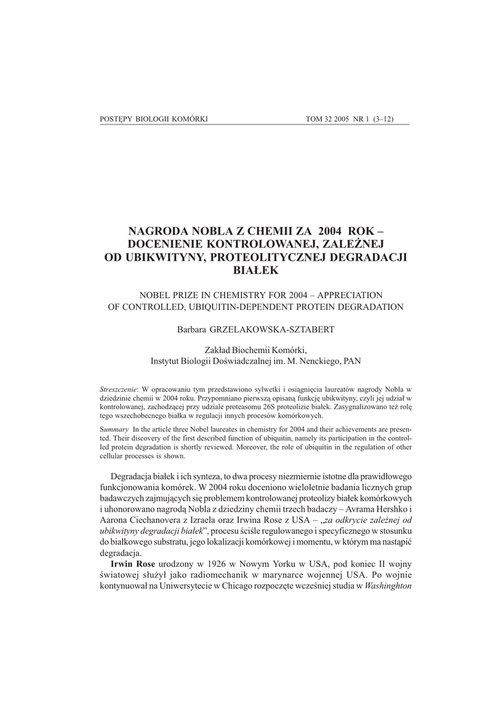NAGRODA NOBLA Z CHEMII ZA 2004 ROK POSTÊPY BIOLOGII KOMÓRKI 3 TOM 32 2005 NR 1 (312) NAGRODA NOBLA Z CHEMII ZA 2004 ROK DOCENIENIE KONTROLOWANEJ, ZALE¯NEJ OD UBIKWITYNY, PROTEOLITYCZNEJ DEGRADACJI BIA£EK NOBEL PRIZE IN CHEMISTRY FOR 2004 APPRECIATION OF CONTROLLED, UBIQUITIN-DEPENDENT PROTEIN DEGRADATION Barbara GRZELAKOWSKA-SZTABERT Zak³ad Biochemii Komórki, Instytut Biologii Dowiadczalnej im. M. Nenckiego, PAN Streszczenie: W opracowaniu tym przedstawiono sylwetki i osi¹gniêcia laureatów nagrody Nobla w dziedzinie chemii w 2004 roku. Przypomniano pierwsz¹ opisan¹ funkcjê ubikwityny, czyli jej udzia³ w kontrolowanej, zachodz¹cej przy udziale proteasomu 26S proteolizie bia³ek. Zasygnalizowano te¿ rolê tego wszechobecnego bia³ka w regulacji innych procesów komórkowych. Summary In the article three Nobel laureates in chemistry for 2004 and their achievements are presented. Their discovery of the first described function of ubiquitin, namely its participation in the controlled protein degradation is shortly reviewed. Moreover, the role of ubiquitin in the regulation of other cellular processes is shown. Degradacja bia³ek i ich synteza, to dwa procesy niezmiernie istotne dla prawid³owego funkcjonowania komórek. W 2004 roku doceniono wieloletnie badania licznych grup badawczych zajmuj¹cych siê problemem kontrolowanej proteolizy bia³ek komórkowych i uhonorowano nagrod¹ Nobla z dziedziny chemii trzech badaczy Avrama Hershko i Aarona Ciechanovera z Izraela oraz Irwina Rose z USA za odkrycie zale¿nej od ubikwityny degradacji bia³ek, procesu cile regulowanego i specyficznego w stosunku do bia³kowego substratu, jego lokalizacji komórkowej i momentu, w którym ma nast¹piæ degradacja. Irwin Rose urodzony w 1926 w Nowym Yorku w USA, pod koniec II wojny wiatowej s³u¿y³ jako radiomechanik w marynarce wojennej USA. Po wojnie kontynuowa³ na Uniwersytecie w Chicago rozpoczête wczeniej studia w Washinghton 4 B. GRZELAKOWSKA-SZTABERT State College. W 1952 roku uzyska³ stopieñ doktora w dziedzinie biochemii, a nastêpnie odby³ sta¿e podoktorskie w Zak³adzie Medycyny Case-Western Reserve University w Cleveland i w Zak³adzie Farmakologii Uniwersytetu w Nowym Yorku. W latach 1954 1963 pracowa³ w Zak³adzie Biochemii w Yale Medical School, a od 1963 roku a¿ do momentu przejcia na emeryturê w 1995 roku zwi¹zany by³ z Fox Chase Cancer Center w Filadelfii. Obecnie kontynuuje swoje badania, jako emerytowany profesor, w Zak³adzie Fizjologii i Biofizyki w Medical College na Uniwersytecie Kalifornijskim w Irvine. Od 1979 roku jest cz³onkiem National Academy of Sciences, USA. Avram Hershko urodzony w 1937 roku w Karcag na Wêgrzech, od 1950 roku obywatel Izraela, doktoryzowa³ siê w dziedzinie medycyny (1965) i biochemii (1969) w Hadassah Medical School na Uniwersytecie Hebrajskim w Jerozolimie. Sta¿ podoktorski odby³ pod kierunkiem G. Tomkinsa w Zak³adzie Biochemii i Biofizyki Uniwersytetu Kalifornijskiego w San Francisco, USA. Po powrocie do Izraela, od 1972 roku jest profesorem w Instytucie Badawczym Nauk Medycznych im. Rodziny Rappaportów w Izraelskim Instytucie Technologii (Technion) w Hajfie. W latach 19771978 pracowa³ w laboratorium Rose`a w Filadelfii. Jest laureatem nagrody Weizmana (1987) oraz nagrody Izraela (1994), najwy¿szego cywilnego odznaczenia tego pañstwa. Wraz z A. Ciechanoverem i A. Varshavskim zosta³ w 2000 roku laureatem nagrody im. Alberta Laskera za pionierskie badania prowadz¹ce do odkrycia zale¿nego od ubikwityny szlaku degradacji bia³ek. Od 2003 roku jest cz³onkiem National Academy of Sciences, USA. Aaron Ciechanover urodzony w 1947 roku w Hajfie, uzyska³ stopieñ doktora medycyny w 1981 roku pracuj¹c pod kierunkiem A. Hershko w Izraelskim Instytucie Technologii (Technion) w Hajfie. Sta¿ podoktorski odby³ w laboratorium H. Lodisha w Massachusetts Institute of Technology, USA, a od szeregu lat jest profesorem i dyrektorem Instytutu Badawczego Nauk Medycznych im. Rodziny Rappaportów w Izraelskim Instytucie Technologii w Hajfie. Od 1987 roku jest tak¿e wizytuj¹cym profesorem w Zak³adzie Pediatrii w Washington University w St. Louis, USA. Jest laureatem nagrody Izraela oraz wraz z A. Hershko i A. Varshavskim nagrody im. Alberta Laskera. Zas³ug¹ powy¿szych badaczy jest odkrycie i opisanie podstaw dzia³ania pozalizosomalnego proteolitycznego systemu degradacji bia³ek, w którym ulegaj¹ proteolizie, poza bia³kami uszkodzonymi b¹d o nieprawid³owej strukturze, bia³ka bior¹ce udzia³ w bardzo wielu procesach komórkowych, w tym w regulacji cyklu komórkowego, transkrypcji, reperacji DNA czy te¿ odpowiedzi immunologicznej. Elementem wspólnym ³¹cz¹cym prace tegorocznych Noblistów jest ubikwityna. Niemniej jednak badania ka¿dego z nich s¹ cile ukierunkowane, o czym najlepiej wiadcz¹ tytu³y wyk³adów noblowskich wyg³oszonych na uroczystej sesji 8 grudnia 2004 roku. ♦ Irwin Rose How ubiquitin chains are made and unmade, ♦ Avram Hershko The ubiquitin system for protein degradation and its roles in the control of cell division ♦ Aaron Ciechanover Intracellular proteolysis from a vaque idea into the patient bed W koñcu lat siedemdziesi¹tych i pocz¹tku osiemdziesi¹tych ubieg³ego wieku Hershko i Ciechanover, pracuj¹c w laboratorium kierowanym przez A. Rose w Fox Chase Cancer Center w Filadelfii wykazali, ¿e w lizatach z retikulocytów zachodzi zale¿na od ATP proteoliza bia³ek, w której uczestniczy termostabilne niewielkie bia³ko globularne, NAGRODA NOBLA Z CHEMII ZA 2004 ROK 5 nazwane pocz¹tkowo APF-1 (ATP-dependent proteolytic factor 1), które nastêpnie okaza³o siê identyczne z odkryt¹ kilka lat wczeniej ubikwityn¹. Ubikwityna, bia³ko zbudowane z 76 aminokwasów jest, jak obecnie wiadomo, jednym z najbardziej konserwatywnych bia³ek komórkowych i wystêpuje w formie wolnej lub zwi¹zanej z bia³kami we wszystkich organizmach eukariotycznych. W latach 19801983 Rose, Hershko i Ciechanover zaprop