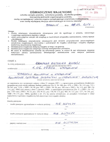 1. Osoba skladajqca oswiadczenie obowiqzana jest do zgodnego z prawd q, starannego i zupelnego wypelnienia kazdej z rubryk. 2, Jezeli poszczeg61ne rubryki nie znajdujq w konkretnym przypadku zastosowania, nalezy wpisac "nie dotyczy". 3. Osoba skladajqca oswiadczenie obowiqzana jest okreslic przynaleinosc poszczegolnych skladnikow majqtkowych, dochod6w i zobowiqzan do majqtku odr~bnego i majqtku obj~tego mali:ensk q wspolnosciq maj<jtkow<j . 4. Oswiadczenie maj<jtkowe dotyczy maj<jtku w kraju i za granic<j.
