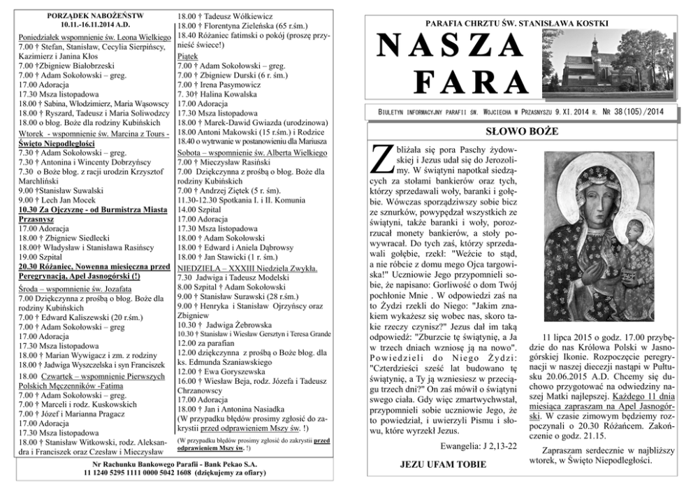 PORZĄDEK NABOŻEŃSTW 10.11.-16.11.2014 A.D. Poniedziałek wspomnienie św. Leona Wielkiego 7.00 † Stefan, Stanisław, Cecylia Sierpińscy, Kazimierz i Janina Kłos 7.00 †Zbigniew Białobrzeski 7.00 † Adam Sokołowski – greg. 17.00 Adoracja 17.30 Msza listopadowa 18.00 † Sabina, Włodzimierz, Maria Wąsowscy 18.00 † Ryszard, Tadeusz i Maria Soliwodzcy 18.00 o błog. Boże dla rodziny Kubińskich Wtorek - wspomnienie św. Marcina z Tours Święto Niepodległości 7.30 † Adam Sokołowski – greg. 7.30 † Antonina i Wincenty Dobrzyńscy 7.30 o Boże błog. z racji urodzin Krzysztof Marchliński 9.00 †Stanisław Suwalski 9.00 † Lech Jan Mocek 10.30 Za Ojczyznę - od Burmistrza Miasta Przasnysz 17.00 Adoracja 18.00 † Zbigniew Siedlecki 18.00† Władysław i Stanisława Rasińscy 19.00 Szpital 20.30 Różaniec, Nowenna miesięczna przed Peregrynacją, Apel Jasnogórski (!) Środa – wspomnienie św. Jozafata 7.00 Dziękczynna z prośbą o błog. Boże dla rodziny Kubińskich 7.00 † Edward Kaliszewski (20 r.śm.) 7.00 † Adam Sokołowski – greg 17.00 Adoracja 17.30 Msza listopadowa 18.00 † Marian Wywigacz i zm. z rodziny 18.00 † Jadwiga Wyszczelska i syn Franciszek 18.00 Czwartek – wspomnienie Pierwszych Polskich Męczenników -Fatima 7.00 † Adam Sokołowski – greg. 7.00 † Marceli i rodz. Kuskowskich 7.00 † Józef i Marianna Pragacz 17.00 Adoracja 17.30 Msza listopadowa 18.00 † Stanisław Witkowski, rodz. Aleksandra i Franciszek oraz Czesław i Mieczysław 18.00 † Tadeusz Wółkiewicz 18.00 † Florentyna Zieleńska (65 r.śm.) 18.40 Różaniec fatimski o pokój (proszę przynieść świece!) Piątek 7.00 † Adam Sokołowski – greg. 7.00 † Zbigniew Durski (6 r. śm.) 7.00 † Irena Pasymowicz 7. 30† Halina Kowalska 17.00 Adoracja 17.30 Msza listopadowa 18.00 † Marek-Dawid Gwiazda (urodzinowa) 18.00 Antoni Makowski (15 r.śm.) i Rodzice 18.40 o wytrwanie w postanowieniu dla Mariusza Sobota – wspomnienie św. Alberta Wielkiego 7.00 † Mieczysław Rasiński 7.00 Dziękczynna z prośbą o błog. Boże dla rodziny Kubińskich 7.00 † Andrzej Ziętek (5 r. śm). 11.30-12.30 Spotkania I. i II. Komunia 14.00 Szpital 17.00 Adoracja 17.30 Msza listopadowa 18.00 † Adam Sokołowski 18.00 † Edward i Aniela Dąbrowsy 18.00 † Jan Stawicki (1 r. śm.) NIEDZIELA – XXXIII Niedziela Zwykła. 7.30 Jadwiga i Tadeusz Modelski 8.00 Szpital † Adam Sokołowski 9.00 † Stanisław Surawski (28 r.śm.) 9.00 † Henryka i Stanisław Ojrzyńscy oraz Zbigniew 10.30 † Jadwiga Żebrowska 10.30 † Stanisław i Wiesław Gersztyn i Teresa Grande 12.00 za parafian 12.00 dziękczynna z prośbą o Boże błog. dla ks. Edmunda Szaniawskiego 12.00 † Ewa Goryszewska 16.00 † Wiesław Beja, rodz. Józefa i Tadeusz Chrzanowscy 17.00 Adoracja 18.00 † Jan i Antonina Nasiadka (W przypadku błędów prosimy zgłosić do zakrystii przed odprawieniem Mszy św. !) (W przypadku błędów prosimy zgłosić do zakrystii przed odprawieniem Mszy św. !) Nr Rachunku Bankowego Parafii - Bank Pekao S.A. 11 1240 5295 1111 0000 5042 1608 (dziękujemy za ofiary) PARAFIA CHRZTU ŚW. STANISŁAWA KOSTKI BIULETYN INFORMACYJNY PARAFII ŚW. WOJCIECHA W PRZASNYSZU 9.XI.2014 R. NR 38(105)/2014 Z SŁOWO BOŻE bliżała się pora Paschy żydowskiej i Jezus udał się do Jerozolimy. W świątyni napotkał siedzących za stołami bankierów oraz tych, którzy sprzedawali woły, baranki i gołębie. Wówczas sporządziwszy sobie bicz ze sznurków, powypędzał wszystkich ze świątyni, także baranki i woły, porozrzucał monety bankierów, a stoły powywracał. Do tych zaś, którzy sprzedawali gołębie, rzekł: "Weźcie to stąd, a nie róbcie z domu mego Ojca targowiska!" Uczniowie Jego przypomnieli sobie, że napisano: Gorliwość o dom Twój pochłonie Mnie . W odpowiedzi zaś na to Żydzi rzekli do Niego: "Jakim znakiem wykażesz się wobec nas, skoro takie rzeczy czynisz?" Jezus dał im taką odpowiedź: "Zburzcie tę świątynię, a Ja w trzech dniach wzniosę ją na nowo". Powiedzieli do Niego Żydzi: "Czterdzieści sześć lat budowano tę świątynię, a Ty ją wzniesiesz w przeciągu trzech dni?" On zaś mówił o świątyni swego ciała. Gdy więc zmartwychwstał, przypomnieli sobie uczniowie Jego, że to powiedział, i uwierzyli Pismu i słowu, które wyrzekł Jezus. Ewangelia: J 2,13-22 JEZU UFAM TOBIE 11 lipca 2015 o godz. 17.00 przybędzie do nas Królowa Polski w Jasnogórskiej Ikonie. Rozpoczęcie peregrynacji w naszej diecezji nastąpi w Pułtusku 20.06.2015 A.D. Chcemy się duchowo przygotować na odwiedziny naszej Matki najlepszej. Każdego 11 dnia miesiąca zapraszam na Apel Jasnogórski. W czasie zimowym będziemy rozpoczynali o 20.30 Różańcem. Zakończenie o godz. 21.15. Zapraszam serdecznie w najbliższy wtorek, w Święto Niepodległości. Z NAUCZANIA PAPIEŻA FRANCISZKA (Źródło: rv/dg | Data publikacji: 06.11.2014) Prawdziwy chrześcijanin nie obawia się pobrudzić sobie rąk z grzesznikami. Umie nawet wystawić na szwank swoją reputację, bo jest w nim serce Boga, który nie chce, by ktokolwiek się zagubił. Mówił o tym Papież podczas porannej Mszy w kaplicy Domu św. Marty. W homilii Franciszek komentował … Ewangelię, w której Jezus odpiera zarzuty faryzeuszy opowiadając przypowieści o zabłąkanej owcy i o zgubionej drachmie. Ojciec Święty zaznaczył, że przebywanie wśród celników i grzeszników było w owych czasach prawdziwym skandalem, który dziś z pewnością trafiłby na czołówki mediów. Jednak Jezus nie rezygnuje z poszukiwania tych, którzy oddalili się od Pana, nie zatrzymuje się wpół drogi. A tak czynili faryzeusze, czuli na bilans zysków i strat. Bóg jednak nie jest człowiekiem interesu, ale idzie aż do końca, dając zbawienie – zaznaczył Papież. Dlatego smutne jest widzieć pasterzy zawieszonych wpół drogi. Smutny jest widok pasterza, który otwiera drzwi Kościoła i pozostaje tam w oczekiwaniu – mó