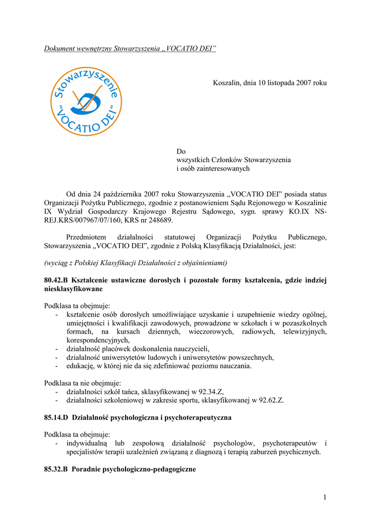 Dokument wewnętrzny Stowarzyszenia „VOCATIO DEI” Koszalin, dnia 10 listopada 2007 roku Do wszystkich Członków Stowarzyszenia i osób zainteresowanych Od dnia 24 października 2007 roku Stowarzyszenia „VOCATIO DEI” posiada status Organizacji PoŜytku Publicznego, zgodnie z postanowieniem Sądu Rejonowego w Koszalinie IX Wydział Gospodarczy Krajowego Rejestru Sądowego, sygn. sprawy KO.IX NSREJ.KRS/007967/07/160, KRS nr 248689. statutowej Organizacji PoŜytku Publicznego, Przedmiotem działalności Stowarzyszenia „VOCATIO DEI”, zgodnie z Polską Klasyfikacją Działalności, jest: (wyciąg z Polskiej Klasyfikacji Działalności z objaśnieniami) 80.42.B Kształcenie ustawiczne dorosłych i pozostałe formy kształcenia, gdzie indziej niesklasyfikowane Podklasa ta obejmuje: - kształcenie osób dorosłych umoŜliwiające uzyskanie i uzupełnienie wiedzy ogólnej, umiejętności i kwalifikacji zawodowych, prowadzone w szkołach i w pozaszkolnych formach, na kursach dziennych, wieczorowych, radiowych, telewizyjnych, korespondencyjnych, - działalność placówek doskonalenia nauczycieli, - działalność uniwersytetów ludowych i uniwersytetów powszechnych, - edukację, w której nie da się zdefiniować poziomu nauczania. Podklasa ta nie obejmuje: - działalności szkół tańca, sklasyfikowanej w 92.34.Z, - działalności szkoleniowej w zakresie sportu, sklasyfikowanej w 92.62.Z. 85.14.D Działalność psychologiczna i psychoterapeutyczna Podklasa ta obejmuje: - indywidualną lub zespołową działalność psychologów, psychoterapeutów i specjalistów terapii uzaleŜnień związaną z diagnozą i terapią zaburzeń psychicznych. 85.32.B Poradnie psychologiczno-pedagogiczne 1 Podklasa ta obejmuje: - działalność poradni psychologiczno-pedagogicznych i ich zespołów, których zadaniem jest zapewnienie szkołom i innym placówkom oświatowo-wychowawczym oraz rodzicom pomocy specjalistycznej we właściwym przygotowaniu dzieci i młodzieŜy do Ŝycia społecznego i wyboru zawodu. Podklasa ta nie obejmuje: - przystosowania zawodowego, gdzie dominuje czynnik edukacyjny, sklasyfikowanego w dziale 80. 85.32.C Pomoc społeczna pozostała, bez zakwaterowania Podklasa ta obejmuje: - pomoc społeczną dla dzieci: działalność związaną z adopcją, działalność mającą na celu zapewnienie bezpieczeństwa dzieciom, działalność wiejskich dziecińców, półkolonii, działalność prewencyjną oraz inną działalność tego rodzaju, - działalność polegającą na niesieniu pomocy osobom w trudnej sytuacji materialnej, pomoc materialną dla uczniów szkół ogólnokształcących, zawodowych oraz studentów, pomoc finansową w płaceniu świadczeń za mieszkania, wydawanie bonów Ŝywnościowych, - odwiedzanie osób starych i chorych, - konsultacje i doradztwo związane z prowadzeniem gospodarstwa domowego oraz budŜetami gospodarstw domowych, działalność poradni małŜeńskich i rodzinnych, - opiekę i doradztwo dla osób warunkowo zwolnionych z więzienia, - działalność społeczną lokalną i sąsiedzką, - działalność polegającą na niesieniu pomocy ofiarom klęsk Ŝywiołowych, katastrof, uchodźcom, imigrantom itp., włączając działalność tymczasowych i długotrwałych schronisk dla tych osób, - działalność związaną z przystosowaniem zawodowym osób upośledzonych umysłowo oraz osób bezrobotnych; w działalności tego typu czynnik edukacyjny powinien występować w ograniczonym zakresie, - działalność charytatywną polegającą na gromadzeniu funduszy lub inne formy wspierania finansowego w ramach opieki społecznej. 91.33.Z Działalność niesklasyfikowana pozostałych organizacji członkowskich, gdzie indziej Podklasa ta obejmuje: - działalność organizacji niezwiązanych bezpośrednio z partią polityczną, wspierających inicjatywy społeczne poprzez edukację, wpływy polityczne, gromadzenie funduszy itp.: • organizacje wspierające inicjatywy mieszkańców i ruchy protestacyjne, • organizacje ekologiczne i działające w celu ochrony środowiska, • organizacje wspierające działalność stowarzyszeń regionalnych i edukacyjnych, gdzie indziej niesklasyfikowane, • organizacje mające na celu poprawę sytuacji pewnych grup społecznych, np. etnicznych, grup mniejszościowych, 2 • - - stowarzyszenia patriotyczne, włączając stowarzyszenia kombatantów, działalność grup o specjalnych zainteresowaniach, takich jak: turystyczne, związki automobilowe, związki konsumentów, działalność związków kultywujących kontakty towarzyskie, jak. np. loŜe masońskie itp., działalność związków młodzieŜowych, organizacji studenckich, klubów, bractw itp., działalność stowarzyszeń agitujących do działalności kulturalnej, rekreacyjnej oraz hobbystycznej (innej niŜ sporty i gry), np. kluby poetyckie, literackie, kluby ksiąŜki, kluby historyczne, koła działkowców, kółka fotograficzne, muzyczne, artystyczne, kluby kolekcjonerów i nieprofesjonalnych artystów, kluby środowiskowe itp., działalność stowarzyszeń ochrony zwierząt. Podklasa ta nie obejmuje: - działalności organizacji profesjonalnych, sklasyfikowanej w 91.12.Z, - zespołów wykonujących i wspierających działalność artystyczną, sklasyfikowanych w 92.31. 92.62.Z Działalność związana ze sportem, pozostała Podklasa ta obejmuje: - organizowanie i przeprowadzanie imprez sportowych na powietrzu i w halach dla sportowców zawodowych lub amatorów, z wykorzystaniem obiektów sportowych własnych lub niebędących własnością organizatora imprezy przez kluby: piłkarskie, kręglarskie, pływackie, kajakarskie, wioślarskie, szermiercze, bokserskie, zapaśnicze, baseballowe, kulturystyczne, sportów zimowych, szachowe, brydŜowe, wędkarskie, strzeleckie, warcabowe, domino, lekkoatletyczne, sportów motorowych, sportów obronnych i inne, - działalność związaną z promocją i organizacją imprez sportowych, - działalność prowadzoną na włas