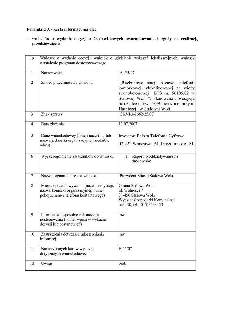 Formularz A - karta informacyjna dla: - wniosków o wydanie decyzji o środowiskowych uwarunkowaniach zgody na realizację przedsięwzięcia Lp. Wniosek o wydanie decyzji, wniosek o udzielenie wskazań lokalizacyjnych, wniosek o ustalenie programu dostosowawczego 1 Numer wpisu A -25/07 2 Zakres przedmiotowy wniosku „Rozbudowa stacji bazowej telefonii komórkowej, zlokalizowanej na wieŜy strunobetonowej BTS nr. 56185,02 w Stalowej Woli ”. Planowana inwestycja na działce nr ew.: 26/9, połoŜonej przy ul Hutniczej , w Stalowej Woli. 3 Znak sprawy GKVI/3-7662/25/07 4 Data złoŜenia 13.07.2007 5 Dane wnioskodawcy (imię i nazwisko lub nazwa jednostki organizacyjnej, siedziba, adres) Inwestor: Polska Telefonia Cyfrowa 02-222 Warszawa, Al. Jerozolimskie 181 6 Wyszczególnienie załączników do wniosku 1. Raport o oddziaływaniu na środowisko 7 Nazwa organu - adresata wniosku Prezydent Miasta Stalowa Wola 8 Miejsce przechowywania (nazwa instytucji, nazwa komórki organizacyjnej, numer pokoju, numer telefonu kontaktowego) Gmina Stalowa Wola ul. Wolności 7 37-450 Stalowa Wola Wydział Gospodarki Komunalnej pok. 30, tel. (015)6433453 9 Informacja o sposobie zakończenia postępowania (numer wpisu w wykazie decyzji lub postanowień) nw 10 ZastrzeŜenia dotyczące udostępniania informacji nw 11 Numery innych kart w wykazie, dotyczących wnioskodawcy E-25/07 12 Uwagi brak