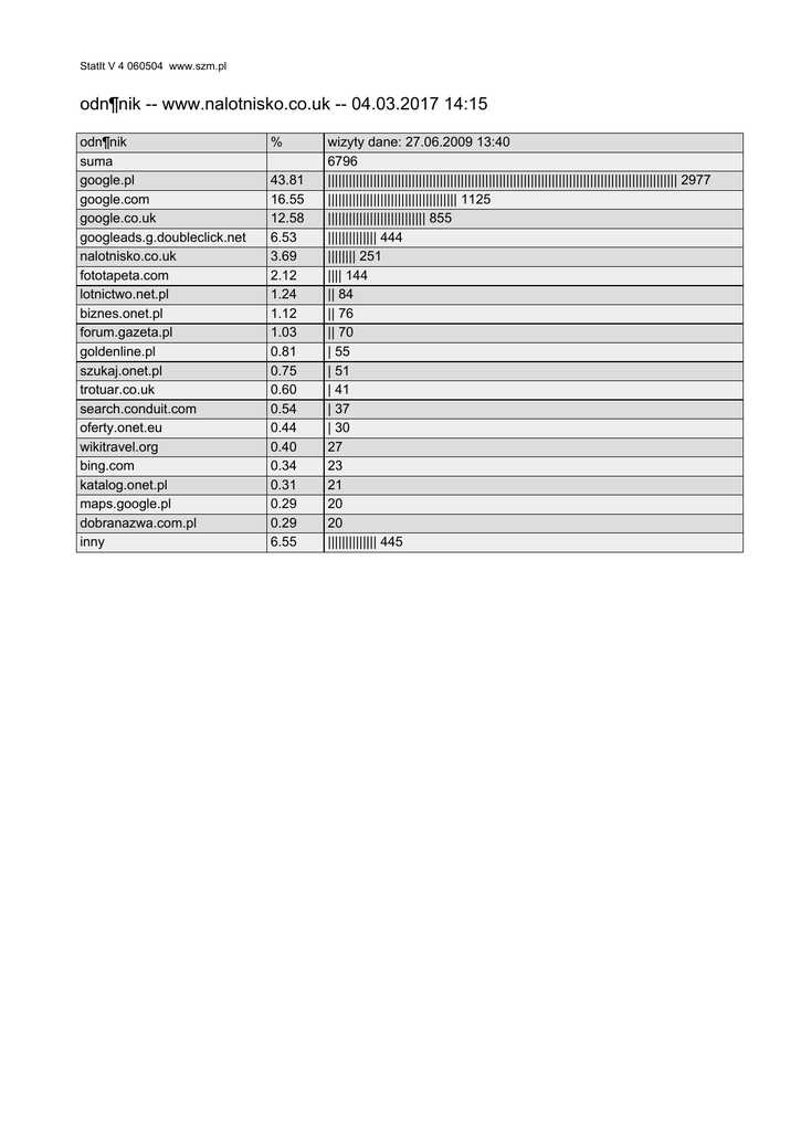 StatIt V 4 060504 www.szm.pl odn¶nik -- www.nalotnisko.co.uk -- 04.03.2017 14:15 odn¶nik suma google.pl google.com google.co.uk googleads.g.doubleclick.net nalotnisko.co.uk fototapeta.com lotnictwo.net.pl biznes.onet.pl forum.gazeta.pl goldenline.pl szukaj.onet.pl trotuar.co.uk search.conduit.com oferty.onet.eu wikitravel.org bing.com katalog.onet.pl maps.google.pl dobranazwa.com.pl inny % 43.81 16.55 12.58 6.53 3.69 2.12 1.24 1.12 1.03 0.81 0.75 0.60 0.54 0.44 0.40 0.34 0.31 0.29 0.29 6.55 wizyty dane: 27.06.2009 13:40 6796 |||||||||||||||||||||||||||||||||||||||||||||||||||||||||||||||||||||||||||||||||||||||||||||||||||| 2977 ||||||||||||||||||||||||||||||||||||| 1125 |||||||||||||||||||||||||||| 855 |||||||||||||| 444 |||||||| 251 |||| 144 || 84 || 76 || 70 | 55 | 51 | 41 | 37 | 30 27 23 21 20 20 |||||||||||||| 445