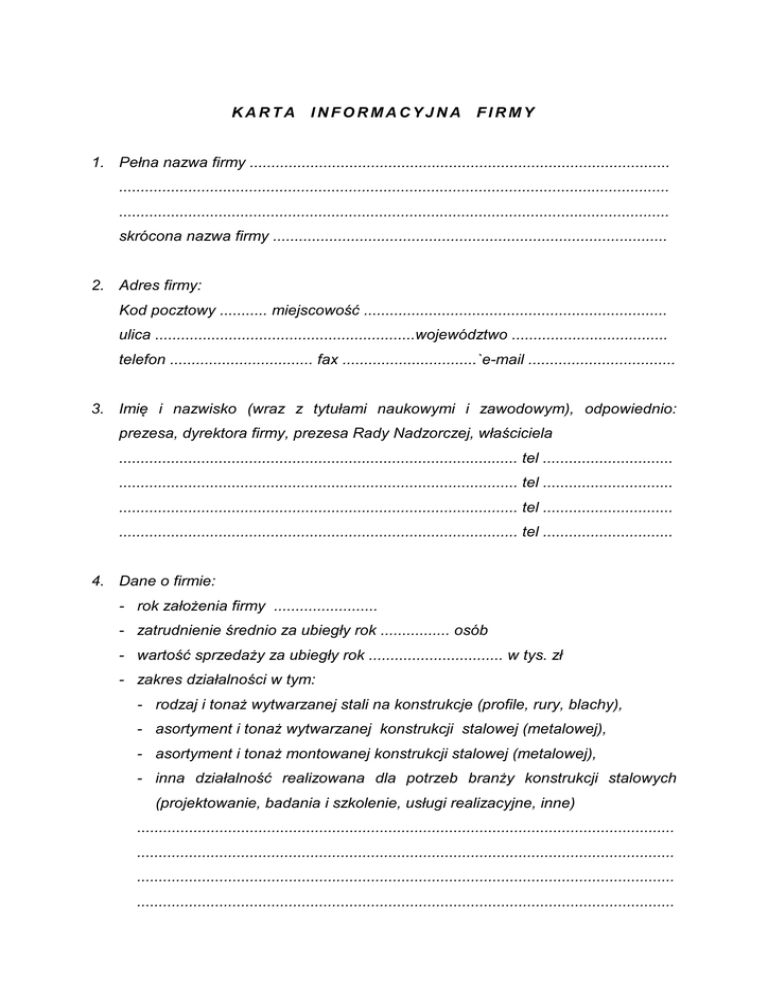 KARTA INFORMACYJNA FIRMY 1. Pełna nazwa firmy ................................................................................................. ............................................................................................................................... ............................................................................................................................... skrócona nazwa firmy ........................................................................................... 2. Adres firmy: Kod pocztowy ........... miejscowość ...................................................................... ulica ............................................................województwo .................................... telefon ................................. fax ...............................`e-mail .................................. 3. Imię i nazwisko (wraz z tytułami naukowymi i zawodowym), odpowiednio: prezesa, dyrektora firmy, prezesa Rady Nadzorczej, właściciela ............................................................................................ tel .............................. ............................................................................................ tel .............................. ............................................................................................ tel .............................. ............................................................................................ tel .............................. 4. Dane o firmie: - rok założenia firmy ........................ - zatrudnienie średnio za ubiegły rok ................ osób - wartość sprzedaży za ubiegły rok ............................... w tys. zł - zakres działalności w tym: - rodzaj i tonaż wytwarzanej stali na konstrukcje (profile, rury, blachy), - asortyment i tonaż wytwarzanej konstrukcji stalowej (metalowej), - asortyment i tonaż montowanej konstrukcji stalowej (metalowej), - inna działalność realizowana dla potrzeb branży konstrukcji stalowych (projektowanie, badania i szkolenie, usługi realizacyjne, inne) ............................................................................................................................ ............................................................................................................................ ............................................................................................................................ ............................................................................................................................ 2 ............................................................................................................................ ............................................................................................................................ ............................................................................................................................ ............................................................................................................................ ............................................................................................................................ ............................................................................................................................ ............................................................................................................................ ............................................................................................................................ 5. Informacja o posiadaniu lub wdrażaniu systemów jakości według: ISO 9000 (9001, 9002, 9003); ISO 14000. ................................................................................................................................ ................................................................................................................................ ................................................................................................................................ ................................................................................................................................ ................................................................................................................................ ................................................................................................................................ 6. Podać posiadane certyfikaty (np. uprawnienia spawalnicze, diagnostyczne, specjalistyczne) ................................................................................................................................ ................................................................................................................................ ................................................................................................................................ ................................................................................................................................ ................................................................................................................................ ................................................................................................................................ 7. Referencje od wprowadzających członków PIKS (wymienionych w deklaracji) ................................................................................................................................ ................................................................................................................................ ................................................................................................................................ ................................................................................................................................ ............................