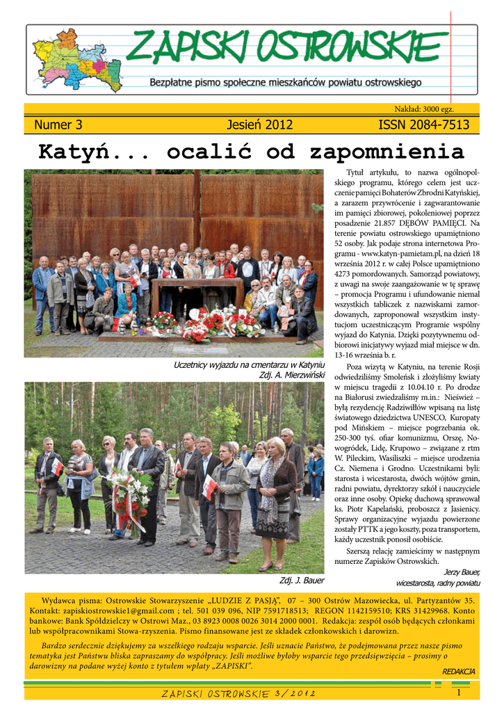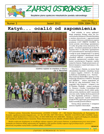 Nakład: 3000 egz. Numer 3 Jesień 2012 ISSN 2084-7513 Katyń... ocalić od zapomnienia Uczetnicy wyjazdu na cmentarzu w Katyniu Zdj. A. Mierzwiński Zdj. J. Bauer Tytuł artykułu, to nazwa ogólnopolskiego programu, którego celem jest uczczenie pamięci Bohaterów Zbrodni Katyńskiej, a zarazem przywrócenie i zagwarantowanie im pamięci zbiorowej, pokoleniowej poprzez posadzenie 21.857 DĘBÓW PAMIĘCI. Na terenie powiatu ostrowskiego upamiętniono 52 osoby. Jak podaje strona internetowa Programu - www.katyn-pamietam.pl, na dzień 18 września 2012 r. w całej Polsce upamiętniono 4273 pomordowanych. Samorząd powiatowy, z uwagi na swoje zaangażowanie w tę sprawę – promocja Programu i ufundowanie niemal wszystkich tabliczek z nazwiskami zamordowanych, zaproponował wszystkim instytucjom uczestniczącym Programie wspólny wyjazd do Katynia. Dzięki pozytywnemu odbiorowi inicjatywy wyjazd miał miejsce w dn. 13-16 września b. r. Poza wizytą w Katyniu, na terenie Rosji odwiedziliśmy Smoleńsk i złożyliśmy kwiaty w miejscu tragedii z 10.04.10 r. Po drodze na Białorusi zwiedzaliśmy m.in.: Nieśwież – byłą rezydencję Radziwiłłów wpisaną na listę światowego dziedzictwa UNESCO, Kuropaty pod Mińskiem – miejsce pogrzebania ok. 250-300 tyś. ofiar komunizmu, Orszę, Nowogródek, Lidę, Krupowo – związane z rtm W. Pileckim, Wasiliszki – miejsce urodzenia Cz. Niemena i Grodno. Uczestnikami byli: starosta i wicestarosta, dwóch wójtów gmin, radni powiatu, dyrektorzy szkół i nauczyciele oraz inne osoby. Opiekę duchową sprawował ks. Piotr Kapelański, proboszcz z Jasienicy. Sprawy organizacyjne wyjazdu powierzone zostały PTTK a jego koszty, poza transportem, każdy uczestnik ponosił osobiście. Szerszą relację zamieścimy w następnym numerze Zapisków Ostrowskich. Jerzy Bauer, wicestarosta, radny powiatu Wydawca pisma: Ostrowskie Stowarzyszenie „LUDZIE Z PASJĄ”, 07 – 300 Ostrów Mazowiecka, ul. Partyzantów 35. Kontakt: [email protected] ; tel. 501 039 096, NIP 7591718513; REGON 1142159510; KRS 31429968. Konto bankowe: Bank Spółdzielczy w Ostrowi Maz., 03 8923 0008 0026 3014 2000 0001. Redakcja: zespół osób będących członkami lub współpracownikami Stowa-rzyszenia. Pismo finansowane jest ze składek członkowskich i darowizn. Bardzo serdecznie dziękujemy za wszelkiego rodzaju wsparcie. Jeśli uznacie Państwo, że podejmowana przez nasze pismo tematyka jest Państwu bliska zapraszamy do współpracy. Jeśli możliwe byłoby wsparcie tego przedsięwzięcia – prosimy o darowizny na podane wyżej konto z tytułem wpłaty „ZAPISKI”. REDAKCJA ZAPISKI OSTROWSKIE 3/2012 1 Do Sadownego na spotkanie z posłem Macierewiczem Poseł i przewodniczący słynnej ‘komisji smoleńskiej’ przybył do Sadownego 12 czerwca 2012 r. Grupa osób z ostrowskiego klubu Gazety Polskiej, z panią Beatą Herman, kierującą tym klubem wykorzystała okazję do spotkania z byłym ministrem. Zasadniczym celem spotkania było jak można Na zdj. uczestnict spotkania z Ostrowi Maz.; od lewej: się domyślać Beata Herman, Dorota Subda, Grażyna Dębek, p r z y b l i ż e n i e Arkadiusz Parzych, Zbigniew Krych Otwarta droga do rewitalizacji budynków Na XXV sesji Rady Miasta radni zmienili obowiązującą uchwałę w sprawie Lokalnego Programu Rewitalizacji Miasta Ostrów Mazowiecka na lata 2007-2013. Dzięki tym zmianom urząd miasta, spółdzielnie mieszkaniowe, wspólnoty mieszkaniowe i starostwo powiatowe mogą ubiegać się o dotacje unijne na zaplanowane modernizacje. Spółdzielnia mieszkaniowa „MEBLE” przedstawiła 5 zadań modernizacyjnych: termomodernizacja, remont dachu, wymiana okien, modernizacja parkingu i wymiana hydrauliki na łączna kwotę 500 000 zł. Środki własne to 125 000zł. Dofinansowanie ze środków UE 375 000 zł. SMLW „Dom Młodych” przedstawiła jedno zadanie – Rewitalizacja zasobów mieszkaniowych – na łączna kwotę 1 385 221 zł. Środki własne to 348 305zł. Dofinansowanie ze środków UE 1 038 916zł. SMLW „Słoneczny Dom” przedstawiła osiem zadań – na łączna kwotę 752 270 zł. Środki własne to 112 841zł. Dofinansowanie ze środków UE 639 Sytuacja w oświacie Jak wynika z odpowiedzi na moje interpelacje złożone do burmistrza podczas obrad rady miasta w czerwcu i lipcu, na przestrzeni ostatnich pięciu lat w ostrowskich szkołach ubyło 561 uczniów, zmalała liczba oddziałów ze 125 w 2008/09 do 100 w 2012/13. W związku z powyższym od września planowana była redukcja 8 etatów nauczycielskich a 38 nauczycieli miało pracować w niepełnym wymiarze godzin. Niestety spadek liczebności dzieci w szkołach niewystarczająco przełożył się na zmniejszenie ilości uczniów w poszczególnych klasach. Nadal są one bardzo liczne (oczywiście z wyjątkiem oddziałów integracyjnych, gdzie wymóg małej liczebności gwarantuje ustawa). Taki Wieści z rady Rada Miasta w ostatnim okresie spotykała się bardzo często. W czerwcu było pięc posiedzeń, w lipcu – dwa, w sierpniu -trzy i we wrześniu – dwa ( stan w dn. 17 września). Większości radnym nie podoba się tryb zwoływania sesji zgodnie z art. 20 ust. 3 ustawy z dn. 8 marca 1990 r. o samorządzie gminnym. Był on w poprzednich kadencjach stosowany do zwoływania tzw. „sesji nadzwyczajnych”. Taki tryb poważnie ogranicza suwerenność rady, gdyż porządek obrad ustala wtedy wnioskodawca, czyli burmistrz i to on musi wyrazić zgodę na wszelkie zmiany w procesie procedowania zaproponowane przez radnych. Jak można się było przekonać podczas 12 (!) ostatnich sesji nadzwyczajnych większość wniosków radnych do porządku obrad została przez W. Krzyżanowskiego odrzucona. Taka sytuacja nie poprawia relacji burmistrza z większością członków rady, w której już dawno utracił większość, powoduje silne emocje, których konsekwencją są kłótnie podczas obrad. W konfliktowej atmosferze trudno jest pracować i osiągać saty