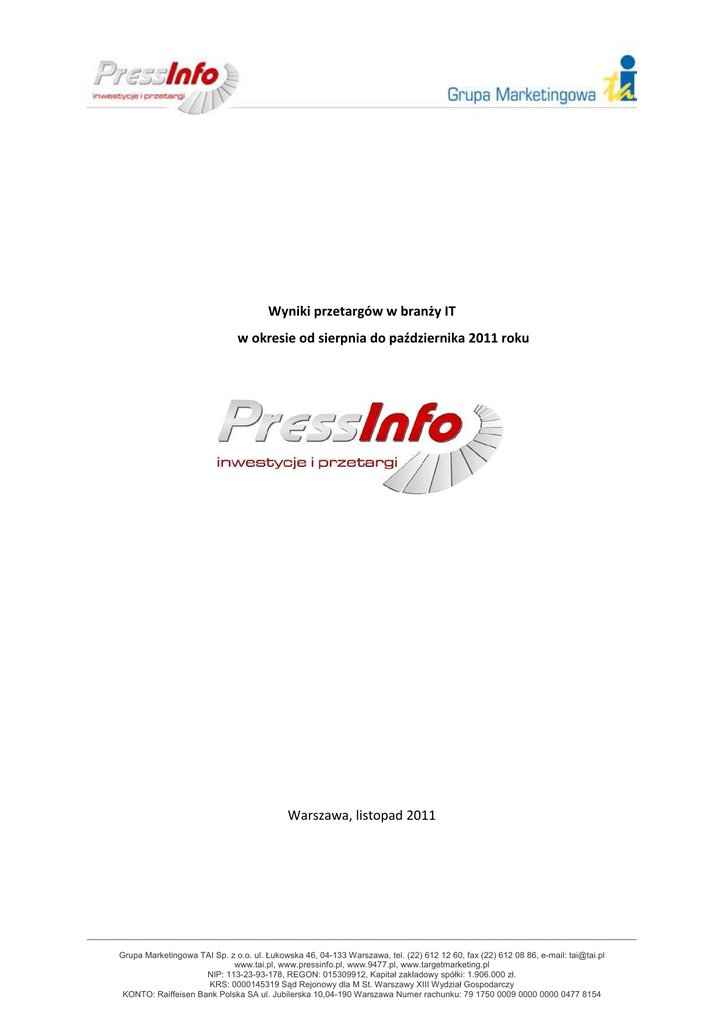 Wyniki przetargów w branży IT w okresie od sierpnia do października 2011 roku Warszawa, listopad 2011 ____________________________________________________________________________________________________________________ Grupa Marketingowa TAI Sp. z o.o. ul. Łukowska 46, 04-133 Warszawa, tel. (22) 612 12 60, fax (22) 612 08 86, e-mail: [email protected] www.tai.pl, www.pressinfo.pl, www.9477.pl, www.targetmarketing.pl NIP: 113-23-93-178, REGON: 015309912, Kapitał zakładowy spółki: 1.906.000 zł. KRS: 0000145319 Sąd Rejonowy dla M St. Warszawy XIII Wydział Gospodarczy KONTO: Raiffeisen Bank Polska SA ul. Jubilerska 10,04-190 Warszawa Numer rachunku: 79 1750 0009 0000 0000 0477 8154 Instytut Inwestycyjno-Przetargowy www.pressinfo.pl razem z Grupą Marketingową TAI przygotował raport, który podsumowuje rozstrzygnięcia przetargów w branży IT opublikowane w okresie od sierpnia do października 2011 roku. Przeanalizowanych zostało 3 372 wyniki postępowań przetargowych na takie usługi jak: dostawa sprzętu, części komputerowych, Internetu, montaż sieci komputerowej i oprogramowania oraz serwis i naprawa. Poniższy raport jest wynikiem szczegółowej analizy wyników przetargów publikowanych w Biuletynie Zamówień Publicznych, Biuletynie Unijnych Zamówień Publicznych. Raport zawiera również zestawienia tabelaryczne dostarczające wiele interesujących aspektów wyników przetargów. Kiedy i gdzie rozstrzygano najwięcej postępowań? Największa ilość wyników postępowań ogłoszona została we wrześniu, aż 1265. W sierpniu ilość wyników wyniosła 930, z kolei październik obfitował w 1777 wyniki. Tendencję tą przedstawia poniższy wykres: ____________________________________________________________________________________________________________________ Grupa Marketingowa TAI Sp. z o.o. ul. Łukowska 46, 04-133 Warszawa, tel. (22) 612 12 60, fax (22) 612 08 86, e-mail: [email protected] www.tai.pl, www.pressinfo.pl, www.9477.pl, www.targetmarketing.pl NIP: 113-23-93-178, REGON: 015309912, Kapitał zakładowy spółki: 1.906.000 zł. KRS: 0000145319 Sąd Rejonowy dla M St. Warszawy XIII Wydział Gospodarczy KONTO: Raiffeisen Bank Polska SA ul. Jubilerska 10,04-190 Warszawa Numer rachunku: 79 1750 0009 0000 0000 0477 8154 Według analizy ilościowej jasno wynika, że największa ilość przetargów rozstrzygnięta została na terenie województwa mazowieckiego – 1003 wyniki, które stanowią aż 30% całości. Kolejne miejsca to: małopolskie – 341 przetargów (10%) i śląskie z ilością 300 wyników (9%). Najmniejsza ilość wyników postępowań w branży IT odnotowana została w województwach: opolskim, podlaskim i lubuskim. Poniższa tabela obrazuje liczbę rozstrzygniętych przetargów dla poszczególnych województw: Województwo inwestora Ilość wyników przetargów w województwie mazowieckie małopolskie śląskie lubelskie wielkopolskie dolnośląskie łódzkie pomorskie podkarpackie zachodniopomorskie warmińsko-mazurskie kujawsko-pomorskie świętokrzyskie opolskie podlaskie lubuskie 1003 341 300 214 210 194 175 163 138 132 130 128 94 56 55 39 Suma całkowita 3372 ____________________________________________________________________________________________________________________ Grupa Marketingowa TAI Sp. z o.o. ul. Łukowska 46, 04-133 Warszawa, tel. (22) 612 12 60, fax (22) 612 08 86, e-mail: [email protected] www.tai.pl, www.pressinfo.pl, www.9477.pl, www.targetmarketing.pl NIP: 113-23-93-178, REGON: 015309912, Kapitał zakładowy spółki: 1.906.000 zł. KRS: 0000145319 Sąd Rejonowy dla M St. Warszawy XIII Wydział Gospodarczy KONTO: Raiffeisen Bank Polska SA ul. Jubilerska 10,04-190 Warszawa Numer rachunku: 79 1750 0009 0000 0000 0477 8154 Najwyższa średnia wartość przetargów Wyniki raportu wykazują, że najwyższa średnia wartość wygranych przetargów w ostatnich trzech miesiącach przypadła województwu mazowieckiemu. Przeciętna wartość przetargu wyniosła tu 953 439 zł. Kolejne dwa miejsca zajęły województwa: wielkopolskie z kwotą 801 624 zł oraz kujawsko - pomorskie z wartością 501 599 zł . Poniższe podsumowanie zawiera dane posortowane według średniej wartości wygranych przetargów w poszczególnych województwach : Województwo inwestora mazowieckie wielkopolskie kujawsko-pomorskie lubuskie pomorskie łódzkie dolnośląskie podlaskie Śląskie Świętokrzyskie Podkarpackie Lubelskie warmińsko-mazurskie Zachodniopomorskie Małopolskie Opolskie Średnia wartość wygranego przetargu 953 439 zł 801 624 zł 501 599 zł 293 048 zł 273 579 zł 252 729 zł 252 386 zł 223 339 zł 207 629 zł 204 945 zł 197 371 zł 196 710 zł 196 376 zł 188 983 zł 165 017 zł 121 142 zł Największa w sumie wartość przetargów w poszczególnych województwach Przeanalizowane zostały również przetargi po najwyższej w sumie wartości. Na pierwszym miejscu uplasowało się województwo mazowieckie z kwotą 956 299 027zł. Kolejne miejsca zajmują: wielkopolskie i kujawsko - pomorskie. Najniższą wartość ____________________________________________________________________________________________________________________ Grupa Marketingowa TAI Sp. z o.o. ul. Łukowska 46, 04-133 Warszawa, tel. (22) 612 12 60, fax (22) 612 08 86, e-mail: [email protected] www.tai.pl, www.pressinfo.pl, www.9477.pl, www.targetmarketing.pl NIP: 113-23-93-178, REGON: 015309912, Kapitał zakładowy spółki: 1.906.000 zł. KRS: 0000145319 Sąd Rejonowy dla M St. Warszawy XIII Wydział Gospodarczy KONTO: Raiffeisen Bank Polska SA ul. Jubilerska 10,04-190 Warszawa Numer rachunku: 79 1750 0009 0000 0000 0477 8154 miały wyniki przetargów ogłoszone w województwie opolskim, ich suma to 6 662 803zł. Poniższa tabela prezentuje całościowe podsumowanie wyników przetargów pod względem ich wartości: Województwo inwestora Wartość rozstrzygnietych przetargów mazowieckie wielkopolskie kujawsko-pomorskie śląskie małopolskie dolnośląs