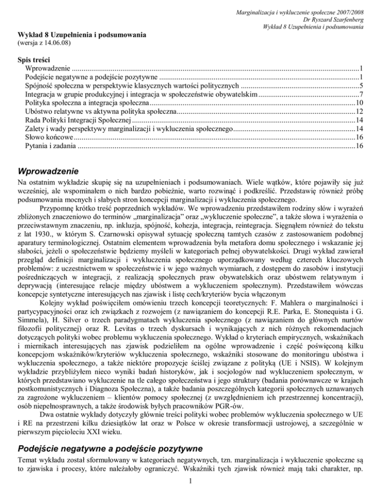 Marginalizacja i wykluczenie społeczne 2007/2008 Dr Ryszard Szarfenberg Wykład 8 Uzupełnienia i podsumowania Wykład 8 Uzupełnienia i podsumowania (wersja z 14.06.08) Spis treści Wprowadzenie ....................................................................................................................................................1 Podejście negatywne a podejście pozytywne .......................................................................................................1 Spójność społeczna w perspektywie klasycznych wartości politycznych .............................................................5 Integracja w grupie produkcyjnej i integracja w społeczeństwie obywatelskim ....................................................7 Polityka społeczna a integracja społeczna .......................................................................................................... 10 Ubóstwo relatywne vs aktywna polityka społeczna............................................................................................ 12 Rada Polityki Integracji Społecznej ................................................................................................................... 14 Zalety i wady perspektywy marginalizacji i wykluczenia społecznego............................................................... 14 Słowo końcowe ................................................................................................................................................. 16 Pytania i zadania ............................................................................................................................................... 16 Wprowadzenie Na ostatnim wykładzie skupię się na uzupełnieniach i podsumowaniach. Wiele wątków, które pojawiły się już wcześniej, ale wspominałem o nich bardzo pobieżnie, warto rozwinąć i podkreślić. Przedstawię również próbę podsumowania mocnych i słabych stron koncepcji marginalizacji i wykluczenia społecznego. Przypomnę krótko treść poprzednich wykładów. We wprowadzeniu przedstawiłem rodziny słów i wyrażeń zbliżonych znaczeniowo do terminów „marginalizacja” oraz „wykluczenie społeczne”, a także słowa i wyrażenia o przeciwstawnym znaczeniu, np. inkluzja, spójność, kohezja, integracja, reintegracja. Sięgnąłem również do tekstu z lat 1930., w którym S. Czarnowski opisywał sytuację społeczną tamtych czasów z zastosowaniem podobnej aparatury terminologicznej. Ostatnim elementem wprowadzenia była metafora domu społecznego i wskazanie jej słabości, jeżeli o społeczeństwie będziemy myśleli w kategoriach pełnej obywatelskości. Drugi wykład zawierał przegląd definicji marginalizacji i wykluczenia społecznego uporządkowany według czterech kluczowych problemów: z uczestnictwem w społeczeństwie i w jego ważnych wymiarach, z dostępem do zasobów i instytucji pośredniczących w integracji, z realizacją społecznych praw obywatelskich oraz ubóstwem relatywnym i deprywacją (interesujące relacje między ubóstwem a wykluczeniem społecznym). Przedstawiłem wówczas koncepcje syntetyczne interesujących nas zjawisk i listę cech/kryteriów bycia włączonym Kolejny wykład poświęciłem omówieniu trzech koncepcji teoretycznych: F. Mahlera o marginalności i partycypacyjności oraz ich związkach z rozwojem (z nawiązaniem do koncepcji R.E. Parka, E. Stonequista i G. Simmela), H. Silver o trzech paradygmatach wykluczenia społecznego (z nawiązaniem do głównych nurtów filozofii politycznej) oraz R. Levitas o trzech dyskursach i wynikających z nich różnych rekomendacjach dotyczących polityki wobec problemu wykluczenia społecznego. Wykład o kryteriach empirycznych, wskaźnikach i miernikach interesujących nas zjawisk podzieliłem na ogólne wprowadzenie i część poświęconą kilku koncepcjom wskaźników/kryteriów wykluczenia społecznego, wskaźniki stosowane do monitoringu ubóstwa i wykluczenia społecznego, a także niektóre propozycje ściślej związane z polityką (UE i NSIS). W kolejnym wykładzie przybliżyłem nieco wyniki badań historyków, jak i socjologów nad wykluczeniem społecznym, w których przedstawiano wykluczenie na tle całego społeczeństwa i jego struktury (badania porównawcze w krajach postkomunistycznych i Diagnoza Społeczna), a także badania poszczególnych kategorii społecznych uznawanych za zagrożone wykluczeniem – klientów pomocy społecznej (z uwzględnieniem ich przestrzennej koncentracji), osób niepełnosprawnych, a także środowisk byłych pracowników PGR-ów. Dwa ostatnie wykłady dotyczyły głównie treści polityki wobec problemów wykluczenia społecznego w UE i RE na przestrzeni kilku dziesiątków lat oraz w Polsce w okresie transformacji ustrojowej, a szczególnie w pierwszym pięcioleciu XXI wieku. Podejście negatywne a podejście pozytywne Temat wykładu został sformułowany w kategoriach negatywnych, tzn. marginalizacja i wykluczenie społeczne są to zjawiska i procesy, które należałoby ograniczyć. Wskaźniki tych zjawisk również mają taki charakter, np. 1 Marginalizacja i wykluczenie społeczne 2007/2008 Dr Ryszard Szarfenberg Wykład 8 Uzupełnienia i podsumowania bezrobocie i ubóstwo, stygmatyzacja i poczucie niższości, samotność i izolacja. Jest to typowe podejście dla nauki o polityce społecznej skoncentrowanej na szczególnie dolegliwych (dla społeczeństwa i dla tych, którzy są nimi dotknięci) kwestiach i problemach społecznych. Stosując w tym przypadku analogię do zdrowia i choroby, można powiedzieć, że podejście tego rodzaju jest czułe na widoczne i wyraźne przejawy choroby, które nazywa się „wskaźnikami alarmowymi”. We współczesnych społeczeństwach przemysłowych większość ludzi żyje w miastach, gdzie podstawą utrzymania jest zatrudnienie i dlatego bezrobocie i ubóstwo oraz ich szczególnie niepokojące rodzaje (np. bezrobocie i ubóstwo