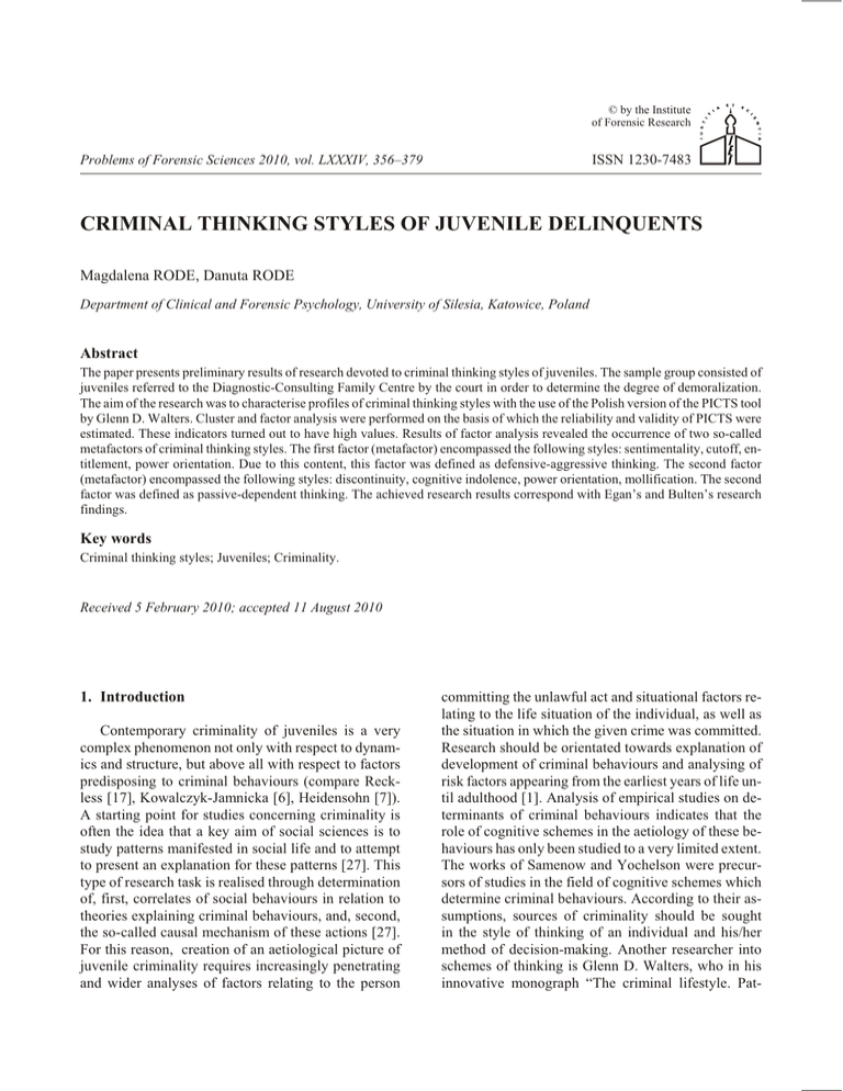 © by the Institute of Forensic Research ISSN 1230-7483 Problems of Forensic Sciences 2010, vol. LXXXIV, 356–379 CRIMINAL THINKING STYLES OF JUVENILE DELINQUENTS Magdalena RODE, Danuta RODE Department of Clinical and Forensic Psychology, University of Silesia, Katowice, Poland Abstract The paper presents preliminary results of research devoted to criminal thinking styles of juveniles. The sample group consisted of juveniles referred to the Diagnostic-Consulting Family Centre by the court in order to determine the degree of demoralization. The aim of the research was to characterise profiles of criminal thinking styles with the use of the Polish version of the PICTS tool by Glenn D. Walters. Cluster and factor analysis were performed on the basis of which the reliability and validity of PICTS were estimated. These indicators turned out to have high values. Results of factor analysis revealed the occurrence of two so-called metafactors of criminal thinking styles. The first factor (metafactor) encompassed the following styles: sentimentality, cutoff, entitlement, power orientation. Due to this content, this factor was defined as defensive-aggressive thinking. The second factor (metafactor) encompassed the following styles: discontinuity, cognitive indolence, power orientation, mollification. The second factor was defined as passive-dependent thinking. The achieved research results correspond with Egan’s and Bulten’s research findings. Key words Criminal thinking styles; Juveniles; Criminality. Received 5 February 2010; accepted 11 August 2010 1. Introduction Contemporary criminality of juveniles is a very complex phenomenon not only with respect to dynamics and structure, but above all with respect to factors predisposing to criminal behaviours (compare Reckless [17], Kowalczyk-Jamnicka [6], Heidensohn [7]). A starting point for studies concerning criminality is often the idea that a key aim of social sciences is to study patterns manifested in social life and to attempt to present an explanation for these patterns [27]. This type of research task is realised through determination of, first, correlates of social behaviours in relation to theories explaining criminal behaviours, and, second, the so-called causal mechanism of these actions [27]. For this reason, creation of an aetiological picture of juvenile criminality requires increasingly penetrating and wider analyses of factors relating to the person committing the unlawful act and situational factors relating to the life situation of the individual, as well as the situation in which the given crime was committed. Research should be orientated towards explanation of development of criminal behaviours and analysing of risk factors appearing from the earliest years of life until adulthood [1]. Analysis of empirical studies on determinants of criminal behaviours indicates that the role of cognitive schemes in the aetiology of these behaviours has only been studied to a very limited extent. The works of Samenow and Yochelson were precursors of studies in the field of cognitive schemes which determine criminal behaviours. According to their assumptions, sources of criminality should be sought in the style of thinking of an individual and his/her method of decision-making. Another researcher into schemes of thinking is Glenn D. Walters, who in his innovative monograph “The criminal lifestyle. Pat- 357 Criminal thinking styles of juvenile delinquents terns of serious criminal conduct” [19] presented theses on the criminal style of thinking. This author assumes that criminal behaviours are determined by three groups of factors: external conditions (environmental), decision-making processes and styles of criminal thinking. 2. Theoretical assumptions As was indicated earlier, present research tendencies devoted to the aetiology of criminality are moving away from a traditional one-dimensional static model determining isolated variables acting on the basis of cause – effect (so-called short range theories). It is noticeable that contemporary studies are conducted in a dynamic model convention. An example of a theoretical research model of the aetiology of criminality which accepts the dialectical-synergetic approach to explaining and explained variables is a conception by Glenn D. Walters. He postulates that criminality is a consequence of the influence of three groups of variables: conditions, selection and cognitive system. The first two groups, co-influencing each other, form the third group, namely the human cognitive system. In relating these influences to criminality, Glenn D. Walters emphasises that a certain style of criminal thinking, which is a result of the interaction of the two groups mentioned above, develops to support and reinforce decisions concerning commission of crime [19]. It plays a key role in criminal initiation and in maintaining criminal behaviours. The cognitive system of an individual (namely criminal thinking) has been formed in such a way as to consolidate and justify irresponsible behaviour, interpersonal intrusiveness, self-indulgence and decision-making. It fulfils protective functions towards the self. The specific way of thinking of persons breaking the law manifests itself in eight basic, separate, but interdependent patterns of thinking. Glenn D. Walters states that an unlawful act is a result of decisions undertaken by an individual in the context of certain situational circumstances. He assumes that selection is made via a cognitive channel, and so the decision of an individual is moderated through his/her cognitive system and the environmental conditions in which s/he exists. One may say that the conditions constitute the basis for the choice, and the choice paves the way for the forming of the cognitive system. The relation between these planes may be presented in the following sequence: conditions – choice – cognitive system. This means that the system of thinking develops because of expos
