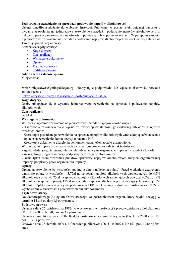 Jednorazowe zezwolenie na sprzedaż i podawanie napojów alkoholowych Usługa umożliwia złożenie do wybranej Instytucji Publicznej w postaci elektronicznej wniosku o wydanie zezwolenia na jednorazową zezwolenie sprzedaż i podawanie napojów alkoholowych, w trakcie imprez organizowanych na otwartym powietrzu lub w pomieszczeniach. W przypdku wniosku o jednorazowe zezwolenie na sprzedaż i podawanie napojów alkoholowych wniosek należy składać na 1 miesiąc przed datą imprezy. Zobacz szczegóły sprawy:  Kogo dotyczy  Czas realizacji  Wymagane dokumenty  Opłaty  Tryb odwoławczy  Podstawa prawna Gdzie chcesz załatwić sprawę Miejscowość wpisz miejscowość/gminę/delegaturę i skorzystaj z podpowiedzi lub wpisz miejscowość, powiat i gminę ręcznie Pokaż wszystkie urzędy lub instytucje udostępniające tę usługę Kogo dotyczy Osoby ubiegające się o wydanie jednorazowego zezwolenia na sprzedaż i podawanie napojów alkoholowych Czas realizacji do 14 dni Wymagane dokumenty Wniosek o wydanie zezwolenia na jednorazową sprzedaż napojów alkoholowych - Kserokopia zaświadczenia o wpisie do ewidencji działalności gospodarczej lub odpis z rejestru przedsiębiorców, - Kserokopia posiadanego zezwolenia na sprzedaż napojów alkoholowych wraz z kopią zaświadczenia o opłacie za zezwolenie, kopia decyzji o nadaniu NIP, - Kserokopia dokumentu udzielenia pełnomocnictwa, jeżeli zostało ustanowione, W przypadku imprez organizowanych na otwartym powietrzu należy także dołączyć: - zgoda władającego terenem, właściciela lub zarządcy na organizację imprezy i sprzedaż alkoholu, - szczegółowy program imprezy podpisany przez organizatora imprez, - szkic (plan rozmieszczenia) punktów sprzedaży napojów alkoholowych miejscu organizowanej imprezy, podpisany przez organizatora imprezy Opłaty Opłata za zezwolenie (w wysokości zgodnej z aktem naliczenia opłaty). Przed wydaniem zezwolenia wnosi się opłatę w wysokości: 43,75zł na sprzedaż napojów alkoholowych zawierających do 4,5% alkoholu oraz piwa, 43,75 zł na sprzedaż napojów alkoholowych zawierających powyżej 4,5% do 18% alkoholu (z wyjątkiem piwa), 175 zł na sprzedaż napojów alkoholowych zawierających powyżej 18% alkoholu. Opłaty pobierane są na podstawie art.18¹ ust.3 ustawy z dnia 26 października 1982r. o wychowaniu w trzeźwości i przeciwdziałaniu alkoholizmowi. Tryb odwoławczy Do Samorządowego Kolegium Odwoławczego za pośrednictwem organu, który wydał decyzję w terminie 14 dni od daty jej otrzymania, Podstawa prawna Ustawa z dnia 26 października 1982r. o wychowaniu w trzeźwości i przeciwdziałaniu alkoholizmowi (Dz. U. z 2007 r. Nr 70, poz. 473 z późn. zm.) Ustawa z dnia 14 czerwca 1960r. Kodeks postępowania administracyjnego (Dz. U. z 2000 r. Nr 98, poz. 1071 z późn. zm.) Ustawa z dnia 27 sierpnia 2009 r. o finansach publicznych (Dz. U. z 2009 r. Nr 157, poz. 1240 z późn. zm.) Ustawa z dnia 2 lipca 2004 r. o swobodzie działalności gospodarczej (Dz. U. z 2010 r. Nr 220, poz. 1447 z późn. zm.) Ustawa z dnia 20 marca 2009 r. o bezpieczeństwie imprez masowych (Dz. U. z 2009 r. Nr 62, poz. 504 z późn. zm.) Ustawa z dnia 16 listopada 2006 r. o opłacie skarbowej (Dz. U. z 2006 r. Nr 225, poz. 1635 z późn. zm.) Urząd udostępniający usługę: Urząd Gminy Trzydnik Duży Trzydnik Duży 59A 23-230 Trzydnik Duży Wniosek: Opłaty Bank Spółdzielczy Ziemi Kraśnickiej Oddział w Trzydniku Dużym 42 8717 1080 2006 6000 0723 0001