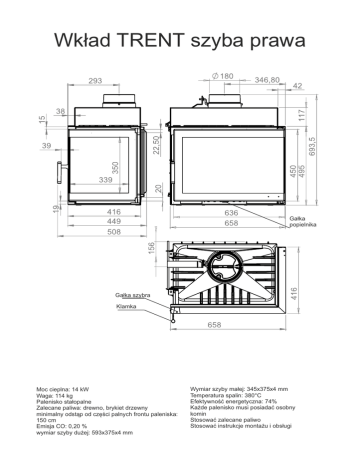 Wkład TRENT szyba prawa Gałka popielnika Gałka szybra Klamka Moc cieplna: 14 kW Waga: 114 kg Palenisko stałopalne Zalecane paliwa: drewno, brykiet drzewny minimalny odstąp od części palnych frontu paleniska: 150 cm Emisja CO: 0,20 % wymiar szyby dużej: 593x375x4 mm Wymiar szyby małej: 345x375x4 mm Temperatura spalin: 380°C Efektywność energetyczna: 74% Każde palenisko musi posiadać osobny komin Stosować zalecane paliwo Stosować instrukcje montażu i obsługi Wkład TRENT szyba lewa Gałka popielnika Gałka szybra Klamka Moc cieplna: 14 kW Waga: 114 kg Palenisko stałopalne Zalecane paliwa: drewno, brykiet drzewny minimalny odstąp od części palnych frontu paleniska: 150 cm Emisja CO: 0,20 % wymiar szyby dużej: 593x375x4 mm Wymiar szyby małej: 345x375x4 mm Temperatura spalin: 380°C Efektywność energetyczna: 74% Każde palenisko musi posiadać osobny komin Stosować zalecane paliwo Stosować instrukcje montażu i obsługi Trent to stałopalny, stalowo-żeliwny wkład kominkowy. Zbudowany z żeliwnego korpusu do którego przykręcono nowoczesną stalową ramę. Prawidłowy proces spalania paliwa uzyskamy poprzez regulacje dopływu powietrza pierwotnego i szybra , stosując suche drewno (wilgotność<20%). Przekrój komory spalania wkładu trent: 1. Regulowany wlot powietrza pierwotnego. 2. Paliwo (drewno, brykiety drzewne). 3. Wlot powietrza wtórnego (nieregulowany, zapewniony poprzez rozszczelnienie pomiędzy szybą i ramą drzwi). 4. Wylot spalin. 5. Szyber. Montaż deflektora Deflektor Wylot spalin. b Podpora deflektora Fasada a Deflektor widok z góry Deflektor z wermikulitu znajduję się w specjalnej ramce mocującej. Należy ją ułożyć swobodnie na żeliwnych nadlewkach na tylniej ścianie i wesprzeć na fasadzie. Regulacja dopływu powietrza do paleniska A – pierwotnego – regulacja za pomocą klucza Rama drzwi Otwarte Zamknięte A Klucz Zestawienie elementów wkładu TRENT prawa szyba 12 1 2 6 3 7 4 27 5 14 21 16 22 15 23 24 25 20 18 28 29 19 30 8 9 31 17 26 10 32 33 11 13 1. Oś szybra 2. Klapka szybra 3. Dźwignia szybra 4. Stopka szybra 5. Czopuch 6. Tylna ściana 7. Tylna ściana ozdobna 8. Ruszt 9. Podstawa 10. Blacha popielnika 11. Zasuwka 12. Króciec 13. Gałka popielnika 14. Deflektor 15. Ściana boczna 16. Grzebień I-21 Ep-40 Ep-39 Ep-44 Ep-42 Ep-37 I-20 Ep-38 17. Szyba 593 mm x 375 mm x 4 mm 18. Fasada 19. Rama drzwi 20. Klamka 21. Gałka szybra 22. Ramka mocująca deflektor 23. Stopka szybra typ 2 24. Tulejki walcowe szt.2 25. Blok zamka 26. Wypełnienie drzwi długie typ.2 27. Wsuwka zawiasu 28. Wypełnienie drzwi pionowe typ.1 29. Wypełnienie drzwi długie typ.1 30. Wypełnienie drzwi krótkie typ.1 31. Wypełnienie drzwi pionowe typ.2 32. Wypełnienie drzwi krótkie typ.2 33. Szyba 345 mm x 375 mm x 4 mm Zestawienie elementów wkładu TRENT lewa szyba 12 1 6 2 7 3 4 27 5 14 21 16 22 15 23 24 25 20 18 31 29 19 30 8 9 28 17 26 10 32 33 11 13 1. Oś szybra 2. Klapka szybra 3. Dźwignia szybra 4. Stopka szybra 5. Czopuch 6. Tylna ściana 7. Tylna ściana ozdobna 8. Ruszt 9. Podstawa 10. Blacha popielnika 11. Zasuwka 12. Króciec 13. Gałka popielnika 14. Deflektor 15. Ściana boczna 16. Grzebień I-21 Ep-40 Ep-39 Ep-44 Ep-42 Ep-37 I-20 Ep-38 17. Szyba 593 mm x 375 mm x 4 mm 18. Fasada 19. Rama drzwi 20. Klamka 21. Gałka szybra 22. Ramka mocująca deflektor 23. Stopka szybra typ 2 24. Tulejki walcowe szt.2 25. Blok zamka 26. Wypełnienie drzwi długie typ.2 27. Wsuwka zawiasu 28. Wypełnienie drzwi pionowe typ.1 29. Wypełnienie drzwi długie typ.1 30. Wypełnienie drzwi krótkie typ.1 31. Wypełnienie drzwi pionowe typ.2 32. Wypełnienie drzwi krótkie typ.2 33. Szyba 345 mm x 375 mm x 4 mm Przykładowy sposób instalacji wkładów kominkowych Rysunek nr 1 Mur-podłoga-sufit niepalne Czopuch z materiałów niepalnych Sufit Kratka wylotu ciepłego powietrza Kratka dekompresyjna Półka dekompresyjna z materiałów niepalnych Ściana zewnętrzna Izolacja z materiałów niepalnych Rura stalowa do odprowadzenia spalin do komina Izolacja z materiałów niepalnych (ochrona belki) Rysunek nr 2 Izolacja z materiałów niepalnych Podłoga Powietrze „pokojowe” z pomieszczenia Belka z materiałów niepalnych Belka ozdobna Fasada paleniska Odstęp 2 do 3 cm !!!UWAGA!!! Wokół wkładu kominkowego a izolacją, należy zapewnić odstęp minimum 5 cm (mierząc od użebrowania wkładu do izolacji) (patrz rysunek nr 3). Pomiędzy górną częścią fasady a elementami obudowy kominkowej, należy zapewnić odstęp 2 do 3 cm (patrz rysunek nr 2). Brak dylatacji (w/w odstępów) może być przyczyną uszkodzeń urządzenia, co wiąże się z utratą uprawnień z tytułu gwarancji. Rysunek nr 3 Ściana minimum Izolacja wewnątrz obudowy z materiałów niepalnych 6 cm Obudowa minimum minimum 6 cm 6 cm 0,4 cm 0,4 cm Fasada wkładu kominkowego Kominek – widok z góry Rysunek nr 4 Komora dekompresyjna Sufit Kratka dekompresyjna Izolacja z materiałów niepalnych 30–50 cm Kratka wylotu ciepłego powietrza Ściana Wkładka ścienna Belka ozdobna 6 cm Powietrze „pokojowe” z pomieszczenia Powietrze „zewnętrzne” Kominek – widok z boku INSTRUKCJA MONTAŻU I OBSŁUGI WKŁADU KOMINKOWEGO Oddajemy Państwu w użytkowanie wkład kominkowy marki NORDFlam. Przed przystąpieniem do jego użytkowania prosimy o zapoznanie się z instrukcją montażu i obsługi. Montaż kominka musi być zgodny z polskimi przepisami prawa budowlanego. Nasza odpowiedzialność ogranicza się jedynie do dostawy paleniska. Jego montaż musi być wykonany, zgodnie z zaleceniami zawartymi w niniejszej instrukcji oraz zasadami sztuki budowlanej (przez wykwalifikowany personel firmy ponoszącej całkowitą odpowiedzialność za całość instalacji). Przepisy prawne dotyczące budowy kominków: I. Prawo budowlane Dz. U. Nr 89 poz. 414 z 1994 r. – Ustawa z dn. 07.07.1994r. z późniejszymi zmianami. II. Rozporządzenie Ministra Infrastruktury z dn. 12.04.2002 r. w sprawie warunków 