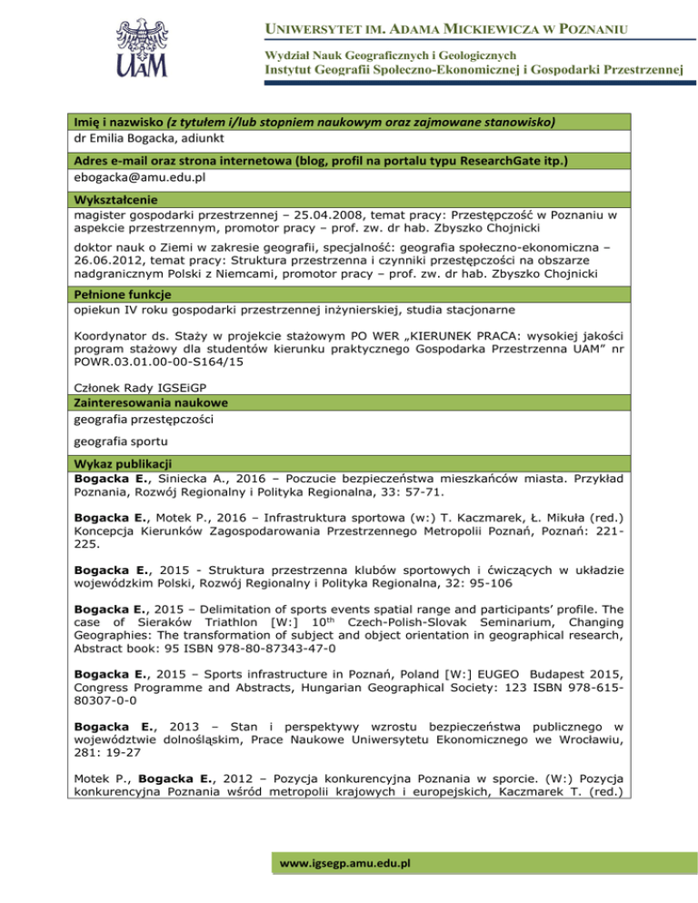 UNIWERSYTET IM. ADAMA MICKIEWICZA W POZNANIU Wydział Nauk Geograficznych i Geologicznych Instytut Geografii Społeczno-Ekonomicznej i Gospodarki Przestrzennej Imię i nazwisko (z tytułem i/lub stopniem naukowym oraz zajmowane stanowisko) dr Emilia Bogacka, adiunkt Adres e-mail oraz strona internetowa (blog, profil na portalu typu ResearchGate itp.) [email protected] Wykształcenie magister gospodarki przestrzennej – 25.04.2008, temat pracy: Przestępczość w Poznaniu w aspekcie przestrzennym, promotor pracy – prof. zw. dr hab. Zbyszko Chojnicki doktor nauk o Ziemi w zakresie geografii, specjalność: geografia społeczno-ekonomiczna – 26.06.2012, temat pracy: Struktura przestrzenna i czynniki przestępczości na obszarze nadgranicznym Polski z Niemcami, promotor pracy – prof. zw. dr hab. Zbyszko Chojnicki Pełnione funkcje opiekun IV roku gospodarki przestrzennej inżynierskiej, studia stacjonarne Koordynator ds. Staży w projekcie stażowym PO WER „KIERUNEK PRACA: wysokiej jakości program stażowy dla studentów kierunku praktycznego Gospodarka Przestrzenna UAM” nr POWR.03.01.00-00-S164/15 Członek Rady IGSEiGP Zainteresowania naukowe geografia przestępczości geografia sportu Wykaz publikacji Bogacka E., Siniecka A., 2016 – Poczucie bezpieczeństwa mieszkańców miasta. Przykład Poznania, Rozwój Regionalny i Polityka Regionalna, 33: 57-71. Bogacka E., Motek P., 2016 – Infrastruktura sportowa (w:) T. Kaczmarek, Ł. Mikuła (red.) Koncepcja Kierunków Zagospodarowania Przestrzennego Metropolii Poznań, Poznań: 221225. Bogacka E., 2015 - Struktura przestrzenna klubów sportowych i ćwiczących w układzie wojewódzkim Polski, Rozwój Regionalny i Polityka Regionalna, 32: 95-106 Bogacka E., 2015 – Delimitation of sports events spatial range and participants’ profile. The case of Sieraków Triathlon [W:] 10th Czech-Polish-Slovak Seminarium, Changing Geographies: The transformation of subject and object orientation in geographical research, Abstract book: 95 ISBN 978-80-87343-47-0 Bogacka E., 2015 – Sports infrastructure in Poznań, Poland [W:] EUGEO Budapest 2015, Congress Programme and Abstracts, Hungarian Geographical Society: 123 ISBN 978-61580307-0-0 Bogacka E., 2013 – Stan i perspektywy wzrostu bezpieczeństwa publicznego w województwie dolnośląskim, Prace Naukowe Uniwersytetu Ekonomicznego we Wrocławiu, 281: 19-27 Motek P., Bogacka E., 2012 – Pozycja konkurencyjna Poznania w sporcie. (W:) Pozycja konkurencyjna Poznania wśród metropolii krajowych i europejskich, Kaczmarek T. (red.) www.igsegp.amu.edu.pl UNIWERSYTET IM. ADAMA MICKIEWICZA W POZNANIU Wydział Nauk Geograficznych i Geologicznych Instytut Geografii Społeczno-Ekonomicznej i Gospodarki Przestrzennej Biblioteka Aglomeracji Poznańskiej, 22, Bogucki Wydawnictwo Naukowe, Poznań: 145-161 Bogacka E., 2012 – Współpraca w zakresie bezpieczeństwa publicznego na obszarze nadgranicznym Polski z Niemcami, Prace Naukowe Uniwersytetu Ekonomicznego we Wrocławiu, 244: 312-320 Bogacka E., 2012 – Struktura przestrzenna i czynniki przestępczości na obszarze nadgranicznym Polski z Niemcami, Bogucki Wydawnictwo Naukowe, Poznań Bogacka E., 2012 – Zastosowanie teorii społecznej dezorganizacji do badania zróżnicowania przestrzennego przestępczości, Wiadomości Statystyczne, 1: 43-51 Bogacka E., 2012 – Przestępczość w Poznaniu na tle innych miast wojewódzkich w Polsce w latach 2000-2006. (W:) Obraz współczesnej metropolii a metropolie przyszłości – między przełomem a kontynuacją, Kwiatkowski J. (red.) Wydawnictwo Uniwersytetu Warszawskiego, Warszawa: 145-157, ISBN 978-83-235-0875-5 Bogacka E., 2011 – Human security in the town at the border, Badania Fizjograficzne: 2130 Bogacka E., 2011 – Współczesny dorobek światowych i polskich badań przestrzennych aspektów przestępczości. (W:) Gospodarka przestrzenna XXI wieku – nowe wyzwania, Prace Naukowe Uniwersytetu Ekonomicznego we Wrocławiu, nr 152, Korenik S., Przybyła Z. (red.), Wydawnictwo Uniwersytetu Ekonomicznego we Wrocławiu, Wrocław: 13-24 Bogacka E., 2011 – Rola bezpieczeństwa publicznego w funkcjonowaniu i rozwoju Poznania. (W:) Gospodarka lokalna w teorii i praktyce, Prace Naukowe Uniwersytetu Ekonomicznego we Wrocławiu, nr 179, Brol R., Sztando A. (red.), Wydawnictwo Uniwersytetu Ekonomicznego we Wrocławiu, Wrocław: 196-205 Bogacka E., 2010 – Porównywalność danych statystycznych o przestępczości między krajami europejskimi. Wiadomości Statystyczne, 11: 68-78 Bogacka E., 2010 – Cross-Border Cooperation on Security in Europe. Quaestiones Geographicae, 29 (4): 41-51 Motek P., Kossowski T., Bogacka E., 2010 – Sport w aglomeracji poznańskiej. Biblioteka Aglomeracji Poznańskiej, 7, Bogucki Wydawnictwo Naukowe, Poznań:106, ISBN 978-8362662-32-6 Bogacka E., 2010 – Kradzież w przestrzeni miejskiej – hipotezy a rzeczywistość (W:) Gospodarka przestrzenna społeczeństwu, Tom 1, Ratajczak W., Stachowiak K. (red.), Bogucki Wydawnictwo Naukowe, Poznań: 219-230, ISBN 978-83-62662-21-0 Bogacka E., 2010 - Human security in the town at the border, 1st International Conference on Cities and their Growth: sustainability and fractality, 5-6 August 2010, Poznań, Ideas and abstracts: 20 Bogacka E., 2009 – Bezpieczeństwo obszaru nadgranicznego Polski. [W:] Badania podstawowe i aplikacyjne w naukach geograficznych, Kasprzak L. (red). Wydział Nauk Geograficznych i Geologicznych, Instytut Geoekologii i Geoinformacji UAM, Zakład Graficzny UAM, Poznań: 129-134, ISBN 987-83-926256-0-5 www.igsegp.amu.edu.pl UNIWERSYTET IM. ADAMA MICKIEWICZA W POZNANIU Wydział Nauk Geograficznych i Geologicznych Instytut Geografii Społeczno-Ekonomicznej i Gospodarki Przestrzennej Bogacka E., 2009 - Przestępczość w Poznaniu. Biuletyn Instytutu Geografii SpołecznoEkonomicznej i Gospodarki Przestrzennej UAM, Seria Rozwój Regionalny i Polityka Regionalna, 6: 87-100 Bogacka E., 2009 – Poziom i czynniki przestępc