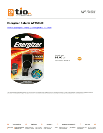 e-mail: [email protected] tel. : 17 770 04 76, Energizer Bateria AP750MC www.tio.pl/energizer-bateria-ap750mc-produkt-4610.html Cena brutto: 99.00 zł Cena netto: 80.49 zł *Ceny obowiązują wyłącznie przy składaniu zamówień przez sklep internetowy. Ceny w salonie TiO media mogą nieznacznie różnić się od cen prezentowanych na stronach sklepu internetowego. Przedstawiona oferta w sklepie internetowym nie stanowi oferty w rozumieniu Kodeksu Cywilnego, i jest jedynie zaproszeniem do rozpoczęcia rokowań (zgodnie z art. 71 k.c.). Zastrzegamy sobie prawo do niezrealizowania zamówień z ważnych przyczyn ekonomicznych.