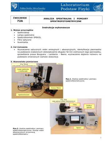 ĆWICZENIE 72A ANALIZA SPEKTRALNA I POMIARY SPEKTROFOTOMETRYCZNE Instrukcja wykonawcza 1. Wykaz przyrządów Spektroskop Lampy spektralne Spektrofotometr SPEKOL Filtry optyczne Suwmiarka 2. Cel ćwiczenia Wyznaczenie optycznych widm emisyjnych i absorpcyjnych, identyfikacja pierwiastka na podstawie znalezionych doświadczalnie długości fal linii widmowych tego pierwiastka, sprawdzenie prawa Bouguera - Lamberta – Beera, wyznaczenie stężenia roztworu na podstawie zmierzonych wartości ekstynkcji. 3. Stanowisko pomiarowe Lampy spektralne z zasilaczami Rys.1. Analiza spektralna i pomiary spektrofotometryczne. Zestaw filtrów Spektrofotometr Filtry Rys.2. Analiza spektralna i pomiary spektrofotometryczne. Pomiar widm absorpcyjnych za pomocą spektrofotometru. Zasilacz spekola Spekol 1 3. Przebieg pomiarów A. Analiza spektralna z wykorzystaniem spektroskopu a) Lunetę spektroskopu ustawić na nieskończoność, tzn. na ostre widzenie bardzo odległych przedmiotów. W tym celu należy najpierw ustawić okular tak, by krzyż był ostro widoczny, potem wykręcić lunetkę i nastawić obiektyw na ostre widzenie odległych przedmiotów. W tym położeniu zablokować przesuw i wkręcić lunetę na poprzednie miejsce. b) Oświetlić szczelinę kolimatora światłem spektralnej lampy helowej i regulując szerokość szczeliny oraz położenie soczewki kolimatora względem szczeliny doprowadzić do uzyskania w polu widzenia lunetki ostrych i cienkich prążków. c) Kolimator z oświetloną skalą ustawić tak, aby w polu widzenia lunetki otrzymać ostry obraz skali obejmujący całe widmo światła lampy spektralnej. d) Odczytać na skali położenie każdej linii widma helu ustawiając kolejno każdą linię na przecięciu krzyża. e) Posługując się tabelą długości fal przypisać każdej linii obserwowanego widma odpowiednią długość fali. f) Zaobserwować widma innych pierwiastków i wyznaczyć położenie ich linii spektralnych na tle skali. g) Oświetlić szczelinę kolimatora światłem białym i zaobserwować widmo ciągłe emitowane przez włókno wolframowe. h) Na oprawę źródła światła nałożyć filtr i odczytać na skali położenia granic obszarów, w których światło jest przepuszczane. Pomiary powtórzyć dla innych filtrów interferencyjnych i absorpcyjnych. UWAGA: Przy wymianie źródeł światła nie zmieniać położenia kolimatora ze szczeliną, pryzmatu, ani kolimatora ze skalą, aby nie rozregulować układu. B. Pomiar widm absorpcyjnych za pomocą spektrofotometru SPEKOL a) Zapoznać się z instrukcją obsługi spekola. b) Przygotować filtry barwne oraz próbkę porównawczą (nie absorbującą światła) do pomiarów: dokładnie wymyć powierzchnie filtrów denaturatem i wypolerować flanelką. c) Wykonać pomiary współczynnika transmisji i ekstynkcji w zakresie długości fal od 400 nm do 700 nm co 20 nm. W obszarach silnych zmian przepuszczalności zagęścić punkty pomiarowe. d) Zmierzyć suwmiarką grubość badanych filtrów. C. Sprawdzenie prawa Bouguera – Lamberta pochłaniania światła, wyznaczenie współczynnika pochłaniania oraz grubości warstwy absorbującej a) Przygotować do pomiarów zestawy filtrów barwnych o różnych grubościach: niebieskich N (wykonanych ze szkła zawierającego kobalt) i różowych R (wykonanych ze szkła zawierającego mangan). Zmierzyć grubość filtrów za pomocą suwmiarki. Następnie powierzchnie filtrów dokładnie wymyć denaturatem i wypolerować flanelką. b) Dla jednego z filtrów N i jednego z filtrów R wykonać pomiary współczynnika transmisji i ekstynkcji w zakresie długości fal od 400 nm do 700 nm, co 20 nm. W obszarach silnych zmian przepuszczalności zagęścić punkty pomiarowe. c) Dla długości fali odpowiadającej minimum transmisji, a maksimum absorpcji wykonać pomiary współczynnika transmisji i ekstynkcji dla wszystkich próbek R oraz N, tych o znanej grubości i nieznanej (obudowanych). 2 D. Sprawdzenie prawa Bouguera – Lamberta – Beera i wyznaczenie koncentracji roztworu a) Przygotować do pomiarów kuwety z roztworami wodnymi siarczanu miedzi i kuwetę wypełnioną wodą destylowaną, która stanowi próbką porównawczą. Powierzchnie kuwet wymyć dokładnie denaturatem i wypolerować flanelką. b) Dla jednego z roztworów o znanym stężeniu wykonać pomiary współczynnika transmisji i ekstynkcji w zakresie długości fal od 400 nm do 700 nm co 20 nm. W obszarach silnych zmian przepuszczalności zagęścić punkty pomiarowe. c) Dla długości fali, przy której występuje maksimum absorpcji zmierzyć ekstynkcję wszystkich roztworów o znanych i nieznanych stężeniach. 5. Opracowanie wyników A. Analiza spektralna z wykorzystaniem spektroskopu a) Wykreślić krzywą skalowania spektroskopu przez odkładanie na osi odciętych położenia na skali poszczególnych linii widmowych światła wzorcowego (He), a na osi rzędnych odpowiadających im długości fal. b) Korzystając z krzywej skalowania przypisać długości fal poszczególnym prążkom widm liniowych innych pierwiastków i zidentyfikować te pierwiastki . c) Na podstawie krzywej skalowania spektroskopu określić przepuszczalności filtrów interferencyjnych i absorpcyjnych B. spektralne przedziały Analiza spektralna z wykorzystaniem spektroskopu a) Przedstawić na wykresach zależność współczynnika transmisji i ekstynkcji od długości fali. b) Korzystając ze wzoru E = 0,4343 k l (1) w którym E oznacza ekstynkcję, a l grubość filtru wyznaczyć wartości współczynnika k dla różnych długości fali z badanego obszaru spektralnego. c) Wykreślić krzywą zależności k (). C. Sprawdzenie prawa Bouguera – Lamberta pochłanianie światła, wyznaczenie współczynnika pochłaniania oraz grubości warstwy absorbującej a) Sporządzić wykresy przedstawiające zależność współczynnika transmisji i ekstynkcji od długości fali. b) Korzystając z definicji ekstynkcji E = log(Io/I) oraz zależności 