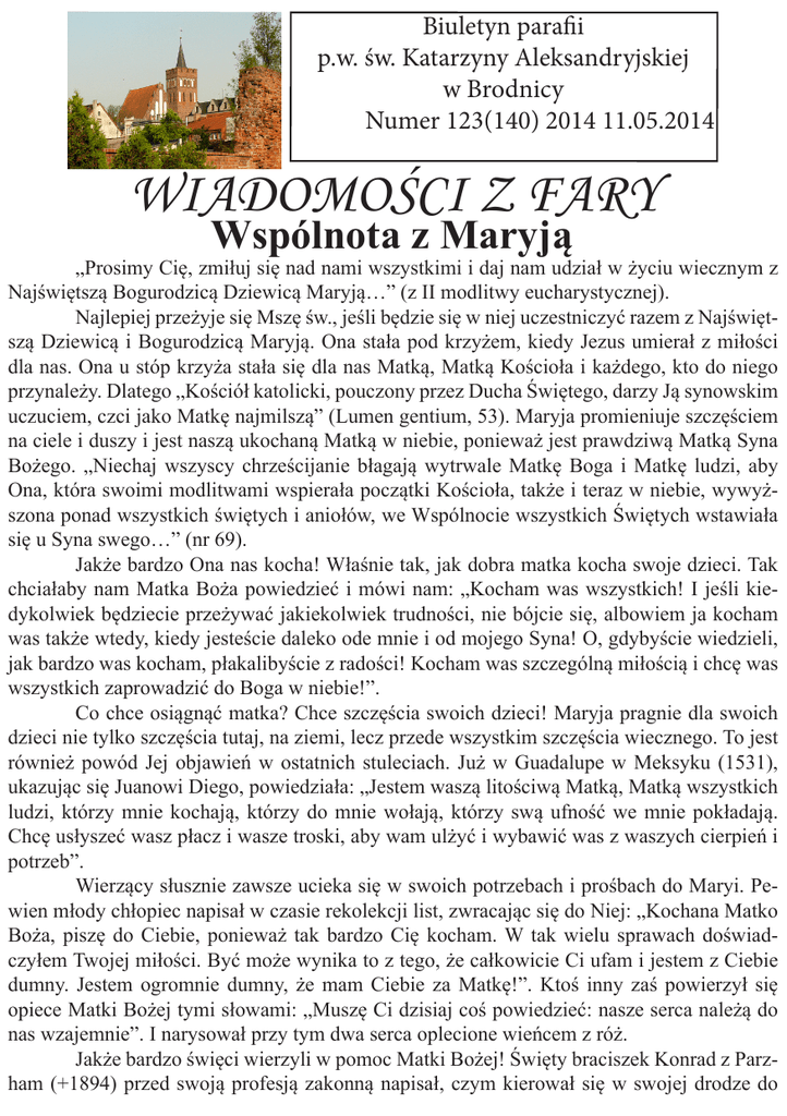 Biuletyn parafii p.w. św. Katarzyny Aleksandryjskiej w Brodnicy Numer 123(140) 2014 11.05.2014 WIADOMOŚCI Z FARY Wspólnota z Maryją „Prosimy Cię, zmiłuj się nad nami wszystkimi i daj nam udział w życiu wiecznym z Najświętszą Bogurodzicą Dziewicą Maryją…” (z II modlitwy eucharystycznej). Najlepiej przeżyje się Mszę św., jeśli będzie się w niej uczestniczyć razem z Najświętszą Dziewicą i Bogurodzicą Maryją. Ona stała pod krzyżem, kiedy Jezus umierał z miłości dla nas. Ona u stóp krzyża stała się dla nas Matką, Matką Kościoła i każdego, kto do niego przynależy. Dlatego „Kościół katolicki, pouczony przez Ducha Świętego, darzy Ją synowskim uczuciem, czci jako Matkę najmilszą” (Lumen gentium, 53). Maryja promieniuje szczęściem na ciele i duszy i jest naszą ukochaną Matką w niebie, ponieważ jest prawdziwą Matką Syna Bożego. „Niechaj wszyscy chrześcijanie błagają wytrwale Matkę Boga i Matkę ludzi, aby Ona, która swoimi modlitwami wspierała początki Kościoła, także i teraz w niebie, wywyższona ponad wszystkich świętych i aniołów, we Wspólnocie wszystkich Świętych wstawiała się u Syna swego…” (nr 69). Jakże bardzo Ona nas kocha! Właśnie tak, jak dobra matka kocha swoje dzieci. Tak chciałaby nam Matka Boża powiedzieć i mówi nam: „Kocham was wszystkich! I jeśli kiedykolwiek będziecie przeżywać jakiekolwiek trudności, nie bójcie się, albowiem ja kocham was także wtedy, kiedy jesteście daleko ode mnie i od mojego Syna! O, gdybyście wiedzieli, jak bardzo was kocham, płakalibyście z radości! Kocham was szczególną miłością i chcę was wszystkich zaprowadzić do Boga w niebie!”. Co chce osiągnąć matka? Chce szczęścia swoich dzieci! Maryja pragnie dla swoich dzieci nie tylko szczęścia tutaj, na ziemi, lecz przede wszystkim szczęścia wiecznego. To jest również powód Jej objawień w ostatnich stuleciach. Już w Guadalupe w Meksyku (1531), ukazując się Juanowi Diego, powiedziała: „Jestem waszą litościwą Matką, Matką wszystkich ludzi, którzy mnie kochają, którzy do mnie wołają, którzy swą ufność we mnie pokładają. Chcę usłyszeć wasz płacz i wasze troski, aby wam ulżyć i wybawić was z waszych cierpień i potrzeb”. Wierzący słusznie zawsze ucieka się w swoich potrzebach i prośbach do Maryi. Pewien młody chłopiec napisał w czasie rekolekcji list, zwracając się do Niej: „Kochana Matko Boża, piszę do Ciebie, ponieważ tak bardzo Cię kocham. W tak wielu sprawach doświadczyłem Twojej miłości. Być może wynika to z tego, że całkowicie Ci ufam i jestem z Ciebie dumny. Jestem ogromnie dumny, że mam Ciebie za Matkę!”. Ktoś inny zaś powierzył się opiece Matki Bożej tymi słowami: „Muszę Ci dzisiaj coś powiedzieć: nasze serca należą do nas wzajemnie”. I narysował przy tym dwa serca oplecione wieńcem z róż. Jakże bardzo święci wierzyli w pomoc Matki Bożej! Święty braciszek Konrad z Parzham (+1894) przed swoją profesją zakonną napisał, czym kierował się w swojej drodze do świętości. „Będę się starał, by zawsze odprawiać wewnętrzne nabożeństwo ku czci Matki Bożej, Dziewicy, i będę także się starał naśladować Jej cnoty”. Święty Klemens Maria Hofbauer (+1820) mawiał: „Różaniec jest moją biblioteką”. Pełnym żaru czcicielem Matki Bożej był św. Bernard z Clairvaux (+1153). Od niego pochodzi właśnie dodatek do Salve Regina: O clemens, o pia, o dulcis virgo Maria! „O łaskawa, o litościwa, o słodka, Panno Maryjo!”. On uczy nas wielkiego zaufania do Maryi: „Kiedy zauważysz, że to ziemskie życie jest raczej ucieczką przed falami, wiatrem i niepogodą niż kroczeniem po stałym lądzie, nie odwracaj twoich oczu od światła tej gwiazdy (tzn. Maryi), abyś nie utonął w nawałnicach sztormu! Wpatruj się w Gwiazdę, wołaj do Maryi. Kiedy miotają tobą spiętrzone fale dumy, ambicji, oszczerstw, zazdrości, wpatruj się w Gwiazdę, wołaj do Maryi! Kiedy przytłacza cię ciężar grzechu, kiedy wydaje ci się, że zostaniesz wchłonięty przez niezmiernie głęboki smutek i rozpacz, zwróć swoje myśli ku Maryi! Naśladuj Ją, a nie zgubisz drogi! Proś Ją, a nigdy nie pozostaniesz bez nadziei! Myśl o Niej, a nie pomylisz się! Trzymaj się Jej mocno, a nie upadniesz!”. Święty Jan Bosko (+1888), sam będący wielkim czcicielem Maryi, który za Jej przyczyną zdziałał wiele cudów, wlewał młodym ludziom w serca szczególną miłość do Matki Bożej. Tak samo św. Dominik Savio (+1857), który cały poświęcił się Maryi, mówiąc: „Maryjo, oddaję Ci moje serce. Pozwól, by ono odtąd już zawsze należało do Ciebie. Panie Jezu i Maryjo, bądźcie moimi przyjaciółmi! Proszę Was jednak, pozwólcie mi raczej umrzeć, niż gdybym miał to nieszczęście popełnić, choćby tylko jeden grzech!”. Dominik Savio w jednej z sennych wizji ukazał się swojemu nauczycielowi don Bosco w promieniującej piękności, pośród wielkiej gromady młodzieńców. Jego oblicze jaśniało tak bardzo, że don Bosco prawie nie mógł na niego patrzeć. Zapytał więc swojego byłego podopiecznego, co w chwili śmierci było dla niego największym pocieszeniem. Jak powiedział Savio: „Największym pocieszeniem w chwili śmierci, było dla mnie wsparcie potężnej i łaskawej Matki Bożej. Powiedz to także twoim synom, że nigdy nie powinni zapominać o modlitwie do Niej, jak długo będą żyć!”. poświęćmy się Matce Bożej! Ponieważ Maryja zna Chrystusa najlepiej, najbardziej Go kocha. Ich serca tworzą jedno, właśnie Ona może nam pomóc lepiej poznać Chrystusa, bardziej Go kochać i wierniej Mu służyć. Poświęćmy się Matce Bożej! Ona będzie nas uczyć i pomagać nam myśleć, mówić, postępować, kochać, milczeć, modlić się, nieść krzyż jak Jezus i jak Ona sama. OGŁOSZENIA PARAFIALNE IV Niedziela Wielkanocna 11. maja 2014 1. IV Nie