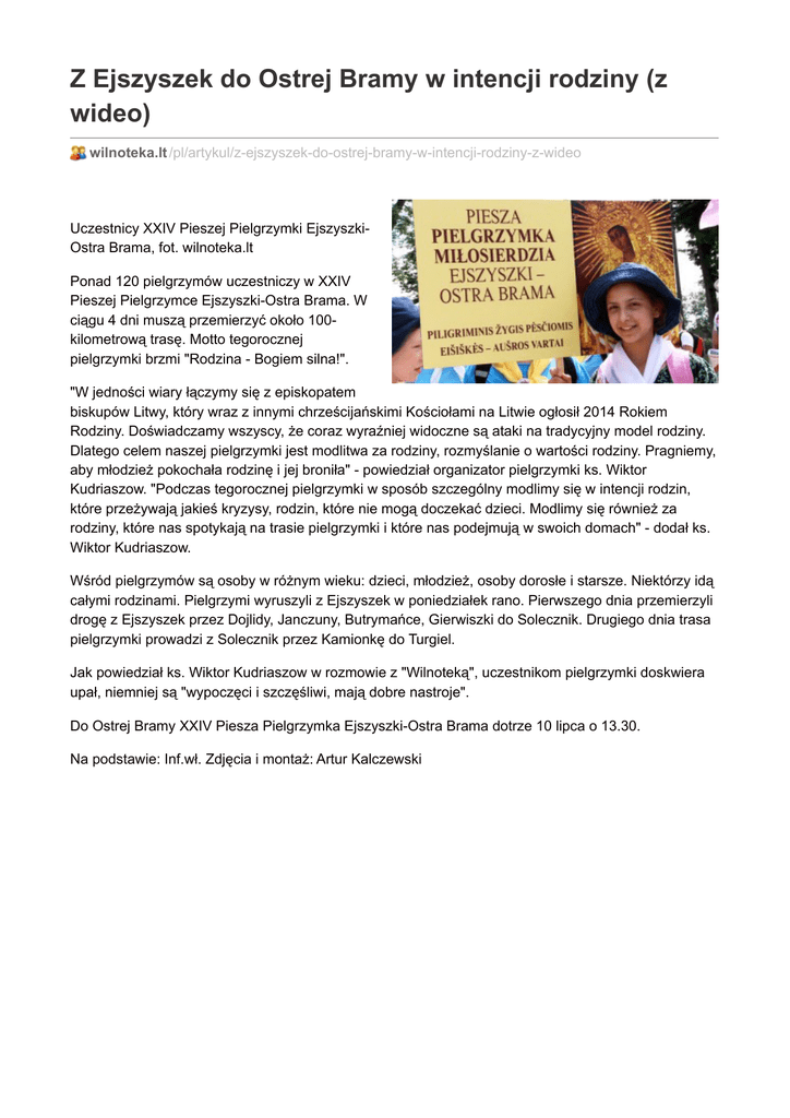 Z Ejszyszek do Ostrej Bramy w intencji rodziny (z wideo) wilnoteka.lt /pl/artykul/z-ejszyszek-do-ostrej-bramy-w-intencji-rodziny-z-wideo Uczestnicy XXIV Pieszej Pielgrzymki EjszyszkiOstra Brama, fot. wilnoteka.lt Ponad 120 pielgrzymów uczestniczy w XXIV Pieszej Pielgrzymce Ejszyszki-Ostra Brama. W ciągu 4 dni muszą przemierzyć około 100kilometrową trasę. Motto tegorocznej pielgrzymki brzmi "Rodzina - Bogiem silna!". "W jedności wiary łączymy się z episkopatem biskupów Litwy, który wraz z innymi chrześcijańskimi Kościołami na Litwie ogłosił 2014 Rokiem Rodziny. Doświadczamy wszyscy, że coraz wyraźniej widoczne są ataki na tradycyjny model rodziny. Dlatego celem naszej pielgrzymki jest modlitwa za rodziny, rozmyślanie o wartości rodziny. Pragniemy, aby młodzież pokochała rodzinę i jej broniła" - powiedział organizator pielgrzymki ks. Wiktor Kudriaszow. "Podczas tegorocznej pielgrzymki w sposób szczególny modlimy się w intencji rodzin, które przeżywają jakieś kryzysy, rodzin, które nie mogą doczekać dzieci. Modlimy się również za rodziny, które nas spotykają na trasie pielgrzymki i które nas podejmują w swoich domach" - dodał ks. Wiktor Kudriaszow. Wśród pielgrzymów są osoby w różnym wieku: dzieci, młodzież, osoby dorosłe i starsze. Niektórzy idą całymi rodzinami. Pielgrzymi wyruszyli z Ejszyszek w poniedziałek rano. Pierwszego dnia przemierzyli drogę z Ejszyszek przez Dojlidy, Janczuny, Butrymańce, Gierwiszki do Solecznik. Drugiego dnia trasa pielgrzymki prowadzi z Solecznik przez Kamionkę do Turgiel. Jak powiedział ks. Wiktor Kudriaszow w rozmowie z "Wilnoteką", uczestnikom pielgrzymki doskwiera upał, niemniej są "wypoczęci i szczęśliwi, mają dobre nastroje". Do Ostrej Bramy XXIV Piesza Pielgrzymka Ejszyszki-Ostra Brama dotrze 10 lipca o 13.30. Na podstawie: Inf.wł. Zdjęcia i montaż: Artur Kalczewski