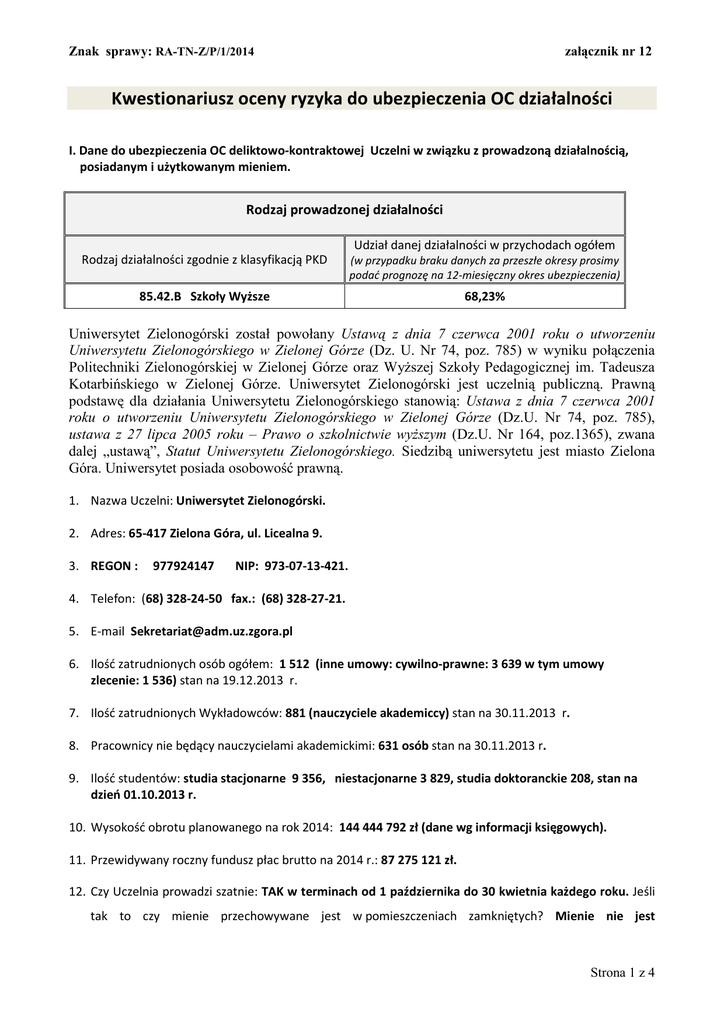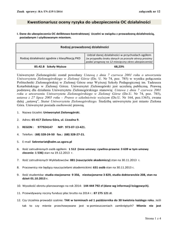 Znak sprawy: RA-TN-Z/P/1/2014 załącznik nr 12 Kwestionariusz oceny ryzyka do ubezpieczenia OC działalności I. Dane do ubezpieczenia OC deliktowo-kontraktowej Uczelni w związku z prowadzoną działalnością, posiadanym i użytkowanym mieniem. Rodzaj prowadzonej działalności Udział danej działalności w przychodach ogółem Rodzaj działalności zgodnie z klasyfikacją PKD (w przypadku braku danych za przeszłe okresy prosimy podać prognozę na 12-miesięczny okres ubezpieczenia) 85.42.B Szkoły Wyższe 68,23% Uniwersytet Zielonogórski został powołany Ustawą z dnia 7 czerwca 2001 roku o utworzeniu Uniwersytetu Zielonogórskiego w Zielonej Górze (Dz. U. Nr 74, poz. 785) w wyniku połączenia Politechniki Zielonogórskiej w Zielonej Górze oraz WyŜszej Szkoły Pedagogicznej im. Tadeusza Kotarbińskiego w Zielonej Górze. Uniwersytet Zielonogórski jest uczelnią publiczną. Prawną podstawę dla działania Uniwersytetu Zielonogórskiego stanowią: Ustawa z dnia 7 czerwca 2001 roku o utworzeniu Uniwersytetu Zielonogórskiego w Zielonej Górze (Dz.U. Nr 74, poz. 785), ustawa z 27 lipca 2005 roku – Prawo o szkolnictwie wyŜszym (Dz.U. Nr 164, poz.1365), zwana dalej „ustawą”, Statut Uniwersytetu Zielonogórskiego. Siedzibą uniwersytetu jest miasto Zielona Góra. Uniwersytet posiada osobowość prawną. 1. Nazwa Uczelni: Uniwersytet Zielonogórski. 2. Adres: 65-417 Zielona Góra, ul. Licealna 9. 3. REGON : 977924147 NIP: 973-07-13-421. 4. Telefon: (68) 328-24-50 fax.: (68) 328-27-21. 5. E-mail [email protected] 6. Ilość zatrudnionych osób ogółem: 1 512 (inne umowy: cywilno-prawne: 3 639 w tym umowy zlecenie: 1 536) stan na 19.12.2013 r. 7. Ilość zatrudnionych Wykładowców: 881 (nauczyciele akademiccy) stan na 30.11.2013 r. 8. Pracownicy nie będący nauczycielami akademickimi: 631 osób stan na 30.11.2013 r. 9. Ilość studentów: studia stacjonarne 9 356, niestacjonarne 3 829, studia doktoranckie 208, stan na dzień 01.10.2013 r. 10. Wysokość obrotu planowanego na rok 2014: 144 444 792 zł (dane wg informacji księgowych). 11. Przewidywany roczny fundusz płac brutto na 2014 r.: 87 275 121 zł. 12. Czy Uczelnia prowadzi szatnie: TAK w terminach od 1 października do 30 kwietnia każdego roku. Jeśli tak to czy mienie przechowywane jest w pomieszczeniach zamkniętych? Mienie nie jest Strona 1 z 4 Znak sprawy: RA-TN-Z/P/1/2014 załącznik nr 12 przechowywane w pomieszczeniach zamkniętych. W budynkach wydzielone są specjalne stanowiska jako szatnie przedzielone ladą. Studenci powierzając okrycie (kurtki, płaszcze, itp.) otrzymują od szatniarza żeton. Szatnie (łącznie 10 szatni) są czynne w godzinach od 7:00 do 19:00, od poniedziałku do niedzieli. W godzinach 7:00 do 15:00 szatnie obsługiwane są przez pracowników zatrudnionych na umowę o pracę w Uczelni, w godzinach od 15:00 do 19:00 pracę na szatni przejmują pracownicy firmy zewnętrznej. 13. Czy Uczelnia prowadzi stołówkę: nie. 14. Czy na terenie Uczelni są parkingi strzeżone ? nie. 15. Czy uczelnia wynajmuje nieruchomości i /lub ruchomości od osób trzecich? TAK: 1) lokale użytkowe o łącznej pow. 309,4 m2 zlokalizowane w budynku przy al. Wojska Polskiego 86 w Zielonej Górze. 2) Lokal użytkowy o łącznej pow. 97,97 m2 położony w budynku przy ul. Ogrodowej 52 i 52a w Zielonej Górze. 16. Czy Uczelnia zatrudnia osoby na umowę zlecenie, inne umowy cywilno-prawne? Tak Nie 17. Czy Uczelnia dysponuje maszynami typu wózki widłowe, dźwigi, sztaplarki, wciągarki, windy zewnętrzne itp.? Tak Nie Jeśli tak, to jakimi (rodzaj, ilość): – 73 sztuki. Ciągnik ogrodniczy, wózki widłowe, platformy, wózki podnośnikowe, podnośniki hydrauliczne, wózki paletowe, wózki magazynowe, wózki transportowe, wózki stołowe, winda zewnętrzna dla niepełnosprawnych. 18. Czy Uczelnia posiada hotele, ośrodki wypoczynkowe Tak Nie Adres: 1) OSW w Lubiatowie ul. Sławska 17, 67-410 Sława, woj. lubuskie. 2) OSW w Łagowie, ul. Szkolna 1, 66-220 Łagów, woj. lubuskie. 3) OSW w Karłowie, Karłów 5A, 57-353 Karłów, gmina Radków, woj. dolnośląskie. 4) OSW w Lubrzy, Oś. Zacisze, 66-218 Lubrza, woj. lubuskie. 19. Czy Uczelnia prowadzi placówki służby zdrowia (sanatoria, ośrodki rehabilitacji, przychodnie zakładowe)? Tak 20. Czy Uczelnia prowadzi badania lub świadczy usługi laboratoryjne? Nie Tak Nie W przypadku odpowiedzi „Tak” prosimy o podanie szczegółowych informacji: Centralne Laboratorium Instytutu Inżynierii Środowiska prowadzi badania i świadczy usługi laboratoryjne podmiotom zewnętrznym. Instytut Budownictwa świadczy usługi laboratoryjne, ekspertyzy, opinie naukowe podmiotom zewnętrznym w zakresie uprawnień tzn. są to opinie naukowe zgodne ze specjalnością naukową pracowników, badania laboratoryjne na zgodność z normą (nie wydawane są atesty czy certyfikaty gdyż Instytut nie posiada takich uprawnień), ekspertyzy wykonywane przez pracowników posiadających uprawnienia zawodowe np. rzeczoznawcy budowlanego, mykologicznego, biegłego sądowego w dziedzinie materiałoznawstwa budowlanego czy uprawnienia budowlane projektowe i wykonawcze. Strona 2 z 4 Znak sprawy: RA-TN-Z/P/1/2014 załącznik nr 12 21. Czy Uczelnia przetwarza dane osobowe osób trzecich zgodnie z Ustawą z dnia 29.08.1997r. o ochronie danych osobowych? Tak Nie W przypadku odpowiedzi „Tak” prosimy o podanie szczegółowych informacji: Dane osobowe wykorzystywane są wyłącznie dla celów Uczelni (np. wystawianie dyplomów). 22. Czy Uczelnia dysponuje statkami powietrznymi (samoloty, helikoptery, awionetki, inne urządzenia Tak Nie latające)? W przypadku odpowiedzi „Tak” prosimy o podanie szczegółowych informacji: .............................................................................................................................. 23. Czy Uczelnia świadczy usługi projektowe Tak Nie W przypadku odpowiedzi „Tak” prosimy o podanie szczegółowych informacji: ...........