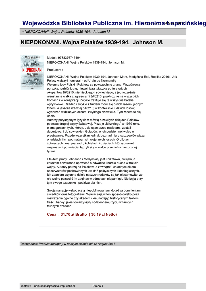 Utworzono : 04Łopacińskieg March 2017 Wojewódzka Biblioteka Publiczna im. Hieronima > NIEPOKONANI. Wojna Polaków 1939-194, Johnson M. NIEPOKONANI. Wojna Polaków 1939-194, Johnson M. Model : 9788376745404 NIEPOKONANI. Wojna Polaków 1939-194, Johnson M. Producent : NIEPOKONANI. Wojna Polaków 1939-194, Johnson Mark, Medyńska Esti, Replika 2016�Jak Polacy walczyli i umierali - od Uralu po Normandię Wojenne losy Polski i Polaków są powszechnie znane. Wrześniowa porażka, rozbiór kraju, niewolnicza tułaczka po terytoriach okupantów ‒ niemieckiego i sowieckiego, a jednocześnie nieustanna walka z agresorami ‒ praktycznie na wszystkich frontach i w konspiracji. Zwykle traktuje się te wszystkie batalie wyrywkowo. Rzadko i zwykle z trudem mówi się o nich razem, jednym tchem, a jeszcze rzadziej ‒ w kontekście ludzkich losów; wydarzeń widzianych oczami zwykłego człowieka. Tym razem to się udało. Autorzy przystępnym językiem mówią o zawiłych dziejach Polaków podczas drugiej wojny światowej. Piszą o „Blitzkriegu” w 1939 roku, o zmaganiach tych, którzy, uciekając przed nazistami, zostali deportowani do sowieckich Gułagów; o ich podziemnej walce o przetrwanie. Przede wszystkim jednak bez nadmiaru szczegółów piszą o ludziach i ich pogmatwanych wojennych losach. O pilotach, żołnierzach i marynarzach, kobietach i dzieciach, którzy, nawet rozproszeni po świecie, łączyli siły w walce przeciwko narzuconej tyranii. Efektem pracy Johnsona i Medyńskiej jest unikatowa, zwięzła, a zarazem bezstronna opowieść o odwadze i harcie ducha w trakcie wojny. Autorzy patrzą na Polaków „z zewnątrz”, chłodnym okiem obserwatorów pozbawionych uwikłań politycznych i ideologicznych. Ich zdaniem wojenne dzieje naszych rodaków są tak niesamowite, że nie wolno pozwolić im zaginąć w odmętach niepamięci. Nie kryją przy tym swego szacunku i podziwu dla nich. Swoją narrację wzbogacają niepublikowanymi dotąd wspomnieniami świadków oraz fotografiami. Wykraczają w ten sposób daleko poza rozważania ogólne czy akademickie, nadając historycznym faktom treść i barwy, jakie towarzyszyły codziennemu życiu w tamtych trudnych czasach. Cena : 31,70 zł Brutto ( 30,19 zł Netto) Dostępność: Produkt dostępny w naszym sklepie od 12 August 2016 kontakt : - [email protected] Strona 1