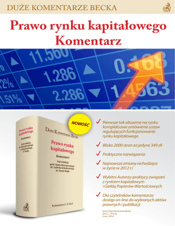 DUŻE KOMENTARZE BECKA Prawo rynku kapitałowego Komentarz NOWOŚ Ć Pierwsze tak obszerne na rynku kompleksowe omówienie ustaw regulujących funkcjonowanie rynku kapitałowego Blisko 2000 stron za jedyne 349 zł! Praktyczne rozwiązania Najnowsze zmiany wchodzące w życie w 2012 r.! Wybitni Autorzy-praktycy związani z rynkiem kapitałowym i Giełdą Papierów Wartościowych Dla czytelników komentarza dostęp on-line do wybranych aktów prawnych i publikacji Seria: Duże Komentarze Becka 2012 r., 1916 str. Cena: 349 zł Prawo rynku kapitałowego Obejmuje wyczerpujące omówienie czterech ustaw regulujących funkcjonowanie rynku kapitałowego w Polsce 1. Publikacja zawiera wyczerpujące omówienie: ustawy z 29.7.2005 r. o ofercie publicznej i warunkach wprowadzania instrumentów finansowych do zorganizowanego systemu obrotu oraz o spółkach publicznych, 2. 3. 4. ustawy z 29.7.2005 r. o obrocie instrumentami finansowymi, ustawy z 21.7.2006 r. o nadzorze nad rynkiem finansowym oraz ustawy z 29.7.2005 r. o nadzorze nad rynkiem kapitałowym. Wymienione ustawy stanowią zorganizowaną całość i są ze sobą ściśle powiązane, stanowiąc sui generis konstytucję rynku kapitałowego. Obecnie widoczne jest zjawisko ogniskujące się w stale wzrastającym znaczeniu gospodarczym rynku kapitałowego jako platformy obrotu instrumentami finansowymi, która oferuje inwestorom szanse wypracowania ponadprzeciętnych zysków, zaś emitentom papierów wartościowych możliwość efektywnego ekonomicznie pozyskania kapitału finansowego. Komentarz omawia m.in. takie zagadnienia jak: zasady, tryb i warunki podejmowania i prowadzenia działalności w zakresie obrotu papierami wartościowymi i innymi instrumentami finansowymi; prawa i obowiązki podmiotów uczestniczących w obrocie papierami wartościowymi i innymi instrumentami finansowymi – prowadzenie działalności przez firmy inwestycyjne: domy maklerskie, banki prowadzące działalność maklerską, a także banki powiernicze oraz maklerów; zasady i warunki dokonywania oferty publicznej papierów wartościowych, prowadzenia subskrypcji lub sprzedaży tych papierów wartościowych oraz ubiegania się o dopuszczenie i wprowadzenie papierów wartościowych lub innych instrumentów finansowych do obrotu na rynku regulowanym; obowiązki emitentów papierów wartościowych i innych podmiotów uczestniczących w obrocie tymi papierami wartościowymi lub innymi instrumentami finansowymi; skutki uzyskania statusu spółki publicznej oraz szczególne prawa i obowiązki związane z posiadaniem i obrotem akcjami takich spółek; organizację, zakres i cel sprawowania nadzoru nad rynkiem finansowym oraz nad rynkiem kapitałowym. Ponadto komentarz zawiera bogatą analizę orzecznictwa i poglądów doktryny dotyczących funkcjonowania rynku kapitałowego. Doskonałe grono autorskie, składające się z osób od wielu lat związanych naukowo i zawodowo z rynkiem kapitałowym, gwarantuje wysoki poziom merytoryczny, jak i przede wszystkim praktyczny prezentowanych omówień. Publikacja stanowi pierwsze i tak obszerne (blisko 2000 stron) na rynku kompleksowe omówienie podstawowych ustaw regulujących funkcjonowanie rynku kapitałowego, zawiera praktyczne wskazówki dotyczące m.in.: przyjętych praktyk rynkowych, tajemnicy zawodowej i informacji poufnych, postępowania z dokumentami informacyjnymi związanymi z ofertą publiczną, przygotowaniem prospektu emisyjnego, zasad nadzoru nad rynkiem kapitałowym, odpowiedzialności karnej, cywilnej oraz administracyjnej za naruszenie ww. przepisów. Komentarz kierowany jest dla prawników zajmujących się rynkiem kapitałowym, pracowników instytucji finansowych zaangażowanych w operacje instrumentami finansowymi na rynku kapitałowym (funduszy inwestycyjnych, domów maklerskich, banków powierniczych, banków), jak także dla osób zainteresowanych funkcjonowaniem tego rynku i instrumentami finansowymi tamże notowanymi (maklerów, brokerów, emitentów papierów wartościowych, pracowników spółek giełdowych). Stanowi także doskonałe źródło wiedzy o rynku kapitałowym dla: sędziów, prokuratorów, pełnomocników procesowych, aplikantów zawodów prawniczych, pracowników urzędów administracyjnych. Komentarz uwzględnia stan prawny na dzień 15.5.2012 r. Książka dostępna w wersji e-book. Wersję e-book można zamówić w komplecie z książką (50% ceny książki) i jako wersję samodzielną (100% ceny książki). Żeby otrzymać publikację w wersji e-book, konieczne jest podanie adresu e-mail podczas składania zamówienia. Na wskazany adres zostanie Państwu wysłany e-mail z instrukcją pobrania publikacji. Prosimy o kontakt z Działem Obsługi Klienta, tel. 22 31 12 222. Książki w wersji e-book można zamówić również za pośrednictwem sklepu internetowego: www.ksiegarnia.beck.pl. Aby skorzystać z rabatu 15% prześlij FAKS-ZAMÓWIENIE na nasz numer 22 33 77 601 Oferta dla Członków Stowarzyszenia Inwestorów Indywidualnych Prawo rynku kapitałowego. Komentarz w cenie: 349 zł 15% rabat! 296,65 zł Imię i nazwiskostanowisko Firmabranża ul.kod/miasto e-mail telefonfax Liczba pracowników: 1-20 21-100 101-200 pow.200 Niniejszym upoważniam do wystawienia faktury VAT bez podpisu odbiorcy. F/12/04/03/01 Konto: Wydawnictwo C.H. Beck, ul. Bonifraterska 17, 00-203 Warszawa Bank Pekao S.A. 52 1240 6247 1111 0000 4973 5420 NIP: 522-010-50-28. Zamówienia można dokonać również poprzez naszą stronę internetową: www.ksiegarnia.beck.pl. Wyrażam zgodę na przetwarzanie danych osobowych przez Wydawnictwo C.H. Beck Sp. z o.o. z siedzibą przy ul. Bonifraterskiej 17, 00-203 Warszawa dla celów realizacji złożonych zamówień i prenumeraty wydawnictw, a także w celach marketingowych. Podawanie danych osobowych dla ww. potrzeb ma charakter dobrowolny. Każdemu przysługuje prawo wglądu do swoich danych osobowych i ich poprawiania. nr NIP podpis Sąd Rejonowy dla m.st. Warszawy Wydz. XII Gospo