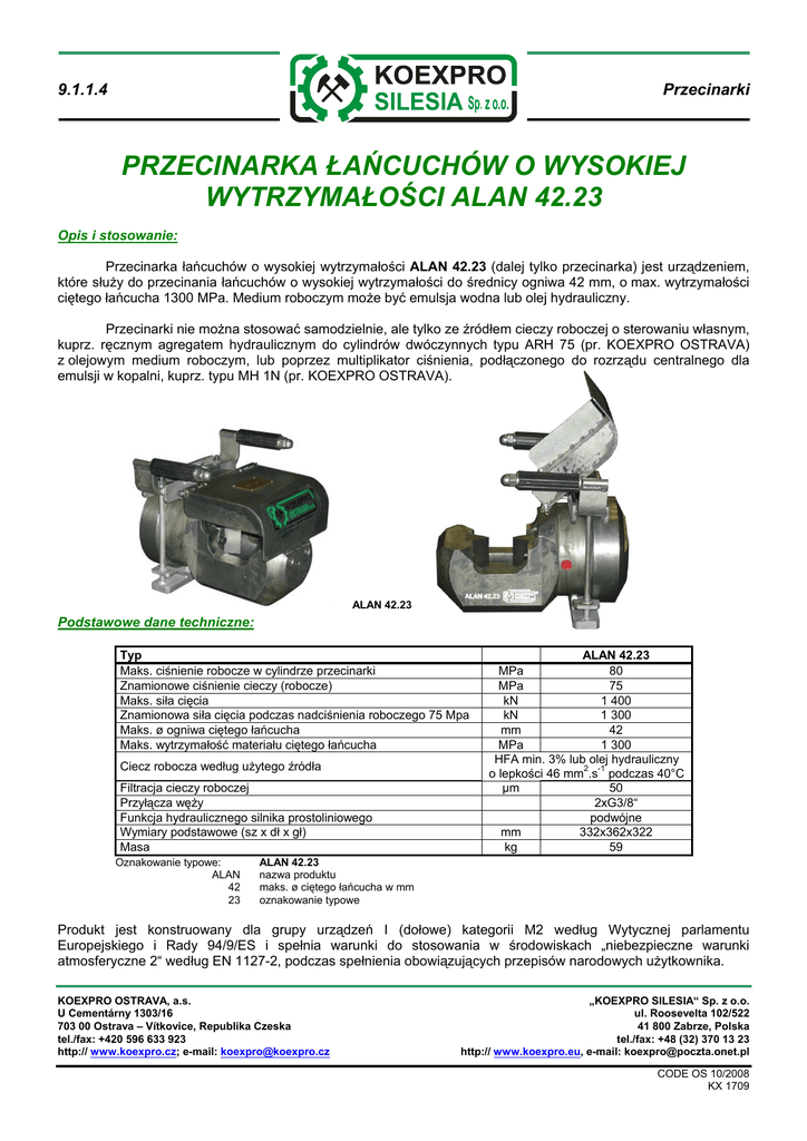 9.1.1.4 Przecinarki PRZECINARKA ŁAŃCUCHÓW O WYSOKIEJ WYTRZYMAŁOŚCI ALAN 42.23 Opis i stosowanie: Przecinarka łańcuchów o wysokiej wytrzymałości ALAN 42.23 (dalej tylko przecinarka) jest urządzeniem, które służy do przecinania łańcuchów o wysokiej wytrzymałości do średnicy ogniwa 42 mm, o max. wytrzymałości ciętego łańcucha 1300 MPa. Medium roboczym może być emulsja wodna lub olej hydrauliczny. Przecinarki nie można stosować samodzielnie, ale tylko ze źródłem cieczy roboczej o sterowaniu własnym, kuprz. ręcznym agregatem hydraulicznym do cylindrów dwóczynnych typu ARH 75 (pr. KOEXPRO OSTRAVA) z olejowym medium roboczym, lub poprzez multiplikator ciśnienia, podłączonego do rozrządu centralnego dla emulsji w kopalni, kuprz. typu MH 1N (pr. KOEXPRO OSTRAVA). ALAN 42.23 Podstawowe dane techniczne: Typ Maks. ciśnienie robocze w cylindrze przecinarki Znamionowe ciśnienie cieczy (robocze) Maks. siła cięcia Znamionowa siła cięcia podczas nadciśnienia roboczego 75 Mpa Maks. ø ogniwa ciętego łańcucha Maks. wytrzymałość materiału ciętego łańcucha Ciecz robocza według użytego źródła Filtracja cieczy roboczej Przyłącza węży Funkcja hydraulicznego silnika prostoliniowego Wymiary podstawowe (sz x dł x gł) Masa Oznakowanie typowe: ALAN 42 23 ALAN 42.23 MPa 80 MPa 75 kN 1 400 kN 1 300 mm 42 MPa 1 300 HFA min. 3% lub olej hydrauliczny 2 -1 o lepkości 46 mm .s podczas 40°C µm 50 2xG3/8“ podwójne mm 332x362x322 kg 59 ALAN 42.23 nazwa produktu maks. ø ciętego łańcucha w mm oznakowanie typowe Produkt jest konstruowany dla grupy urządzeń I (dołowe) kategorii M2 według Wytycznej parlamentu Europejskiego i Rady 94/9/ES i spełnia warunki do stosowania w środowiskach „niebezpieczne warunki atmosferyczne 2“ według EN 1127-2, podczas spełnienia obowiązujących przepisów narodowych użytkownika. KOEXPRO OSTRAVA, a.s. U Cementárny 1303/16 703 00 Ostrava – Vítkovice, Republika Czeska tel./fax: +420 596 633 923 http:// www.koexpro.cz; e-mail: [email protected] „KOEXPRO SILESIA“ Sp. z o.o. ul. Roosevelta 102/522 41 800 Zabrze, Polska tel./fax: +48 (32) 370 13 23 http:// www.koexpro.eu, e-mail: [email protected] CODE OS 10/2008 KX 1709