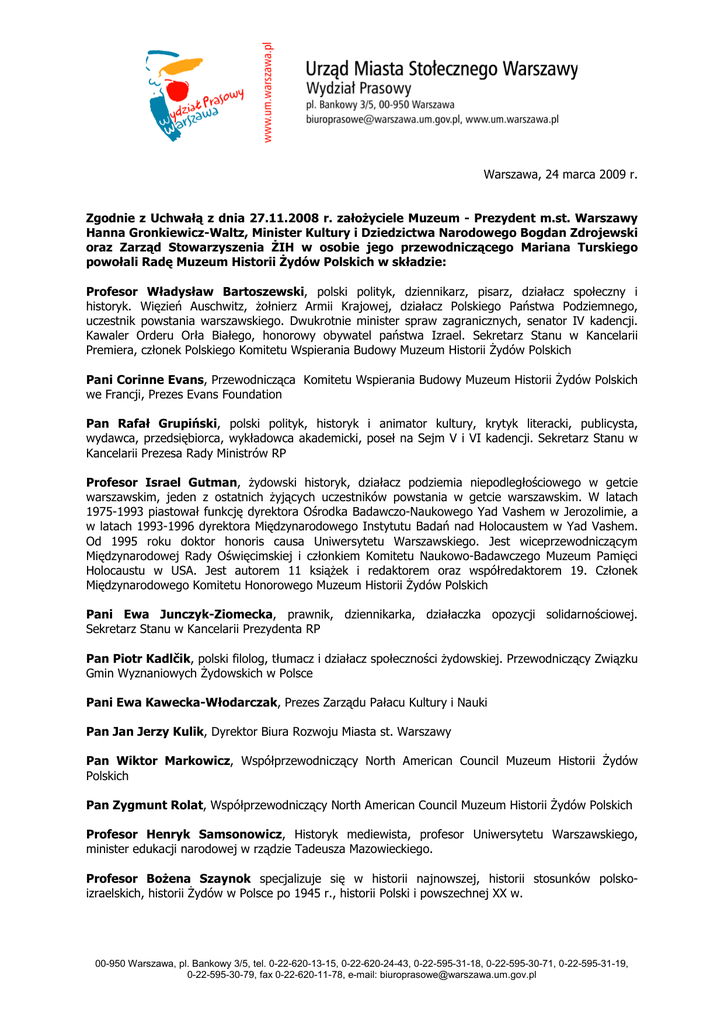 Warszawa, 24 marca 2009 r. Zgodnie z Uchwałą z dnia 27.11.2008 r. załoŜyciele Muzeum - Prezydent m.st. Warszawy Hanna Gronkiewicz-Waltz, Minister Kultury i Dziedzictwa Narodowego Bogdan Zdrojewski oraz Zarząd Stowarzyszenia śIH w osobie jego przewodniczącego Mariana Turskiego powołali Radę Muzeum Historii śydów Polskich w składzie: Profesor Władysław Bartoszewski, polski polityk, dziennikarz, pisarz, działacz społeczny i historyk. Więzień Auschwitz, Ŝołnierz Armii Krajowej, działacz Polskiego Państwa Podziemnego, uczestnik powstania warszawskiego. Dwukrotnie minister spraw zagranicznych, senator IV kadencji. Kawaler Orderu Orła Białego, honorowy obywatel państwa Izrael. Sekretarz Stanu w Kancelarii Premiera, członek Polskiego Komitetu Wspierania Budowy Muzeum Historii śydów Polskich Pani Corinne Evans, Przewodnicząca Komitetu Wspierania Budowy Muzeum Historii śydów Polskich we Francji, Prezes Evans Foundation Pan Rafał Grupiński, polski polityk, historyk i animator kultury, krytyk literacki, publicysta, wydawca, przedsiębiorca, wykładowca akademicki, poseł na Sejm V i VI kadencji. Sekretarz Stanu w Kancelarii Prezesa Rady Ministrów RP Profesor Israel Gutman, Ŝydowski historyk, działacz podziemia niepodległościowego w getcie warszawskim, jeden z ostatnich Ŝyjących uczestników powstania w getcie warszawskim. W latach 1975-1993 piastował funkcję dyrektora Ośrodka Badawczo-Naukowego Yad Vashem w Jerozolimie, a w latach 1993-1996 dyrektora Międzynarodowego Instytutu Badań nad Holocaustem w Yad Vashem. Od 1995 roku doktor honoris causa Uniwersytetu Warszawskiego. Jest wiceprzewodniczącym Międzynarodowej Rady Oświęcimskiej i członkiem Komitetu Naukowo-Badawczego Muzeum Pamięci Holocaustu w USA. Jest autorem 11 ksiąŜek i redaktorem oraz współredaktorem 19. Członek Międzynarodowego Komitetu Honorowego Muzeum Historii śydów Polskich Pani Ewa Junczyk-Ziomecka, prawnik, dziennikarka, działaczka opozycji solidarnościowej. Sekretarz Stanu w Kancelarii Prezydenta RP Pan Piotr Kadlčik, polski filolog, tłumacz i działacz społeczności Ŝydowskiej. Przewodniczący Związku Gmin Wyznaniowych śydowskich w Polsce Pani Ewa Kawecka-Włodarczak, Prezes Zarządu Pałacu Kultury i Nauki Pan Jan Jerzy Kulik, Dyrektor Biura Rozwoju Miasta st. Warszawy Pan Wiktor Markowicz, Współprzewodniczący North American Council Muzeum Historii śydów Polskich Pan Zygmunt Rolat, Współprzewodniczący North American Council Muzeum Historii śydów Polskich Profesor Henryk Samsonowicz, Historyk mediewista, profesor Uniwersytetu Warszawskiego, minister edukacji narodowej w rządzie Tadeusza Mazowieckiego. Profesor BoŜena Szaynok specjalizuje się w historii najnowszej, historii stosunków polskoizraelskich, historii śydów w Polsce po 1945 r., historii Polski i powszechnej XX w. 00-950 Warszawa, pl. Bankowy 3/5, tel. 0-22-620-13-15, 0-22-620-24-43, 0-22-595-31-18, 0-22-595-30-71, 0-22-595-31-19, 0-22-595-30-79, fax 0-22-620-11-78, e-mail: [email protected] Profesor Janusz Tazbir, historyk, profesor Instytutu Historii Polskiej Akademii Nauk (w latach 1983 -1990 - dyrektor instytutu). Badacz historii kultury i ruchów religijnych w Polsce XVI i XVII w. Jest członkiem Stowarzyszenia Pisarzy Polskich. Pan Marian Turski, polski historyk i dziennikarz, przewodniczący Stowarzyszenia śydowski Instytut Historyczny Profesor Feliks Tych, polski historyk i publicysta, w latach 1995-2006 dyrektor śydowskiego Instytutu Historycznego W ten sposób zakończy się proces organizacji Muzeum Historii śydów Polskich i dopełnienie prawnych wymogów jego funkcjonowania. Dzięki powstaniu Rady, Muzeum zyskało bardzo potrzebne „ciało kolektywne” łączące i skupiające wszystkie strony i środowiska zaangaŜowane w tworzenie Muzeum. Powstała w ten sposób wspólna przestrzeń dyskusji i wymiany ustaleń. Rada, składająca się w duŜej mierze z wybitnych naukowców i znawców historii śydów oraz historii jako takiej, posiada teŜ kompetencje intelektualnego angaŜowania się i oceniania tego, co robi Muzeum. Co waŜne Rada uzyskała juŜ specjalne uprawnienie – większością, co najmniej 10 głosów moŜe zaakceptować ostateczny kształt wystawy głównej. Na początku, zgodnie z porządkiem obrad, Prezydent Hanna Gronkiewicz-Waltz wręczy członkom Rady akty powołania. Spotkaniu przewodniczył będzie Profesor Władysław Bartoszewski – senior wśród członków Rady. W programie obrad znalazły się wystąpienia ZałoŜycieli Muzeum: Pani Prezydent m.st. Warszawy, Ministra Kultury i Dziedzictwa Narodowego - Pana Bogdana Zdrojewskiego i Pana Mariana Turskiego – prezesa Stowarzyszenia śydowski Instytut Historyczny. Po wyborze Przewodniczącego lub Przewodniczącej Rady Dyrektor Muzeum Historii śydów Polskich - Pan Jerzy Halbersztadt - przedstawi stan prac w Muzeum i współpracy międzynarodowej wokół Muzeum, a Wiceprezydent Warszawy, Pan Jacek Wojciechowicz - przebieg inwestycji. 00-950 Warszawa, pl. Bankowy 3/5, tel. 0-22-620-13-15, 0-22-620-24-43, 0-22-595-31-18, 0-22-595-30-71, 0-22-595-31-19, 0-22-595-30-79, fax 0-22-620-11-78, e-mail: [email protected]