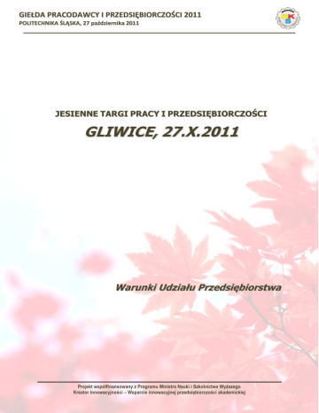 GIEŁDA PRACODAWCY I PRZEDSIĘBIORCZOŚCI 2011 POLITECHNIKA ŚLĄSKA, 27 października 2011 _____________________________________________________________________________________ JESIENNE TARGI PRACY I PRZEDSIĘBIORCZOŚCI GLIWICE, 27.X.2011 Warunki Udziału Przedsiębiorstwa Projekt współfinansowany z Programu Ministra Nauki i Szkolnictwa Wyższego Kreator Innowacyjności – Wsparcie innowacyjnej przedsiębiorczości akademickiej GIEŁDA PRACODAWCY I PRZEDSIĘBIORCZOŚCI 2011 POLITECHNIKA ŚLĄSKA, 27 października 2011 _____________________________________________________________________________________ Szanowni Państwo, Mamy zaszczyt przedstawić Państwu ofertę uczestnictwa w Giełdzie Pracodawcy i Przedsiębiorczości – Jesień 2011 organizowanej przez Politechnikę Śląską w dniu 27 października 2011 roku. Wydarzenie odbędzie się w budynku Centrum Edukacyjno - Kongresowego Politechniki Śląskiej w Gliwicach przy ulicy Konarskiego 18B. Przedsięwzięcie ma na celu nawiązanie bezpośredniego kontaktu Państwa firmy z potencjalnymi kandydatami do pracy – studentami, absolwentami i pracownikami naukowymi Politechniki Śląskiej. Organizacji wydarzenia towarzyszy idea zwiększania platformy w tym współpracy sektorem w zakresie małych i wymiany średnich wiedzy pomiędzy przedsiębiorstw, a biznesem, środowiskiem akademickim. Współpraca taka może dotyczyć zlecania opracowań nowych metod, udostępniania materiałów do pisania prac dyplomowych (w tym rozpraw doktorskich), jak również konsultowania pomysłów na zwiększenie efektywności podejmowanych działań. Jednocześnie wydarzenie to stanowi dobrą okazję do zaprezentowania Państwa oferty, jak również przybliżenia charakteru działalności przedsiębiorstwa. Bezpośrednia wymiana oczekiwań między pracodawcą, a przyszłym pracownikiem, służy wykreowaniu odpowiedniej sylwetki pracobiorcy, a tym samym spełnieniu wzajemnych oczekiwań. Giełda Pracodawcy jest niewątpliwie sposobnością do znalezienia nowych pracowników, stażystów i praktykantów oraz innowacyjnych rozwiązań biznesowych wywodzących się z Politechniki Śląskiej. Organizacja każdego z tych wydarzeń, dodatnio wpływa na kształtowanie się wizerunku Politechniki Śląskiej, jako uczelni zorientowanej na rozwój przedsiębiorczości jej adeptów oraz korzystną dla każdej ze stron, współpracę z przemysłem. Serdecznie zapraszamy do udziału! Z wyrazami szacunku, Organizatorzy Projekt współfinansowany z Programu Ministra Nauki i Szkolnictwa Wyższego Kreator Innowacyjności – Wsparcie innowacyjnej przedsiębiorczości akademickiej GIEŁDA PRACODAWCY I PRZEDSIĘBIORCZOŚCI 2011 POLITECHNIKA ŚLĄSKA, 27 października 2011 _____________________________________________________________________________________ Uczestnicy Do udziału w wydarzeniu zapraszamy przedsiębiorstwa małego, średniego i dużego sektora, działające na terenie kraju i zagranicy, reprezentujące branżę inżynieryjną oraz pokrewne, zorientowane na pozyskiwanie zasobów ludzkich, fachowej wiedzy, innowacji ze środowiska akademickiego. Na Giełdzie zaprezentują się również instytucje rynku pracy i instytucje wspierające przedsiębiorczość, prowadzące swoją działalność na terenie woj. śląskiego. Grupa docelowa Odbiorcami Giełdy Pracodawcy i Przedsiębiorczości są przede wszystkim studenci, absolwenci i pracownicy naukowi Politechniki Śląskiej, niemniej jednak o wydarzeniu zostaną poinformowane również wszystkie okoliczne szkoły techniczne oraz uczelnie wyższe województwa. Promocja wydarzenia Kampania reklamowa wydarzenia będzie odbywać się przy użyciu następujących narzędzi: Plakaty, ulotki informacyjne; Strona internetowa stworzona na potrzeby Giełdy Pracodawcy i Przedsiębiorczości – Jesień 2011 (zakładka do strony www.kariera.polsl.pl); Baner kierujący do strony internetowej Giełdy na stronie www.polsl.pl Newsletter do pracowników naukowych Politechniki Śląskiej i studentów/absolwentów zarejestrowanych w bazie internetowej Biura Karier Studenckich (ok. 8700 odbiorców) wysłany w przeddzień oraz na dwa tygodnie przed planowanym wydarzeniem; Informacje w mediach (radio, telewizja, portale pracy), w tym patronat wybranych stacji; Projekt współfinansowany z Programu Ministra Nauki i Szkolnictwa Wyższego Kreator Innowacyjności – Wsparcie innowacyjnej przedsiębiorczości akademickiej GIEŁDA PRACODAWCY I PRZEDSIĘBIORCZOŚCI 2011 POLITECHNIKA ŚLĄSKA, 27 października 2011 _____________________________________________________________________________________ Szczegóły oferty W ramach uczestnictwa w Giełdzie Pracodawcy i Przedsiębiorczości – Jesień 2011 jesteśmy w stanie zapewnić Państwa firmie Pakiet podstawowy (szczegóły w poniższej tabeli). Stanowisko w holu budynku Centrum Edukacyjno – Kongresowego Politechniki Śląskiej Logo i odnośnik do strony internetowej na portalu Giełdy (podstrona „Wystawcy”) Prezentacja multimedialna na portalu Giełdy (podstrona ,,Wystawcy”) Reklama w katalogu giełdowym o formacie A53 Logo na plakacie promującym Prezentacja firmy na Politechnice Śląskiej w terminie uzgodnionym z Organizatorem Liczba przedstawicieli firmy podczas Giełdy Catering Cena Małe przedsiębiorstwa1 Duże przedsiębiorstwa2 Tak (stolik + 2 krzesła) Tak (stoisko 6m2 wykonane przez profesjonalną firmę wraz z umeblowaniem, fryzem, podłączeniem elektrycznym i internetowym) Tak Tak Nie Tak Reklama w postaci krótkiej informacji o firmie (dane teleadresowe, krótki opis działalności firmy, ok. 500 znaków) Nie Reklama w postaci udostępnienia jednej strony kolorowej w katalogu Tak Nie Tak 2 osoby dowolna Tak Tak 700 zł + 23% VAT 2400zł + 23% VAT 1 Z pakietu przeznaczonego dla małych przedsiębiorstw mogą skorzystać firmy spełniające następujące wymagania: liczba pracowników w firmie nie przekracza 20 osób; działalność firmy oparta jest na nowoczesnych t