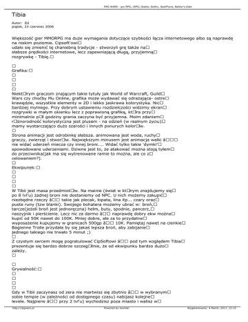 RPG WARS - gry RPG, cRPG, Diablo, Gothic, SpellForce, Baldur's Gate Tibia Autor: Ed piątek, 23 czerwiec 2006 Większość gier MMORPG ma duże wymagania dotyczące szybkości łącza internetowego albo są naprawdę na niskim poziomie. Cipsoft'owi udało się zmienić tę chaniebną tradycje - stworzyli grę także na słabsze prędkości internetowe, lecz zapewniającą długą, przyjemną rozgrywkę - Tibię. Grafika: NiektÃłrym graczom znającym takie tytuły jak World of Warcraft, Guild Wars czy choćby Mu Online, grafika może wydawać się odrażająca- ostre krawędzie, wszystkie elementy w 2D i lekko jaskrawa kolorystyka. Nic bardziej mylnego. Przy dobrym ustawieniu rozdzielczości widzimy ekran rozgrywki w małym okienku lecz z poprawioną grafiką, ktÃłra przy minimalnie pÃłl godziny grania zaczyna być przyjemna. Moim zdaniem rÃłżnorodność kolorystyczna jest plusem - na odzień (w realnym życiu) mamy wystarczająco dużo szarości i innych ponurych kolorÃłw. Strona animacji jest odrobinkę słabsza. animowana jest woda, ruchy graczy, zwierząt i stworÃłw. Największym minusem jest animacja walki – nie widać uderzeń miecza czy innej broni.... Widać tylko takie 'dymki' spowodowane uderzeniami. Dziwne jest to, że atakować można stoją tyłem do przeciwnika(jak ma się wytrenowane ramie to można, ale co z celowaniem?). Ekwipunek: W Tibii jest masa przedmiotÃłw. Na mainie (świat w ktÃłrym znajdujemy się po 8 lvl'u) żadnej broni nie dostaniemy od NPC. U nich możemy zakupić niezbędne rzeczy – takie jak plecak, łopata, lina itp... czary oraz puste runy (tzw blanki). Swojego bohatera możemy ubrać w: broń, tarcze(jeżeli broń jest jednoręczna) hełm, buty, spodnie, pancerz, naszyjnik i pierścienie. Lecz nic za darmo – naprawdę dobry ekw można kupić od 50K nawet do 100K. Mniej dobre, ale za to przydatne wyposażenie kupujemy w granicach 500gp – 10K. Pamiętaj nawet na cienkie Bagienne Trolle przydała by się jakaś lepsza broń, aby zabijanie jednego takiego nie trwało 5 minut ;) Z czystym sercem mogę pogratulować CipSoftowi – pod tym względem Tibia prezentuje się bardzo dobrze szczegÃłlnie, że od ekwipunku bardzo dużo zależy. Grywalność: Gdy w Tibii zaczynasz od zera nie martwisz się zbytnio – w wybranym sobie tempie (w zależności od dostępnego czasu) nabijasz kolejne levele. Najpierw – przy 2 lvl'u) wychodzisz poza miasto i walisz w http://rpgwars.pl Powered by Joomla! Wygenerowano: 4 March, 2017, 12:15 RPG WARS - gry RPG, cRPG, Diablo, Gothic, SpellForce, Baldur's Gate trolle, przy kolejnych wypełniasz coraz to trudniejsze questy, aż wkońcu dobijasz do 8 levela i przenosisz się na mainland – wybierasz profesje i miasto... twÃłj bohater stoi w jakiejś świątyni, a ty nie wiesz w ktÃłrą stronę go poprowadzić. Tak właśnie zaczynamy przygodę z tą grą. NiektÃłrzy pomagają sobie mapkami znajdującymi się na stronach poświęconych owej grze, a inni idą za śladem swoich doświadczonych kolegÃłw ktÃłrzy miasto mają w małym palcu. Tak czy inaczej początki są trudne... szczegÃłlnie przy pierwszej śmierci – downgrade level'a i strata części ekwipunku. Osoby o słabszych nerwach wogÃłle przestają grać, a inni biorą się w garść i starają się jak najszybciej nadrobić straty i dopaść kolesia, ktÃłry zapewnił mu dead'a. Ja dałem sobie spokÃłj przy 11 śmierci – z natury nie jestem człowiekiem cierpliwym (choć za czasÃłw modemu byłem dość wprawiony ;) ) i znalazłem sobie inną grę. Skoro już o cierpliwości mowa – w Tibii musisz mieć jej sporo. Tam wszystko dzieje się dość powoli – nowe levele, skille broni, poziomy magii oraz -to najbardziej denerwuje graczy – odzyskiwanie many, a przy początkowych poziomach nawet chodzimy powoli – nie wspominając już o lagach :D Podsumowując – Tibia to gra dla ludzi, ktÃłrzy pragną zabawy na długi czas. Świat Tibii potrafi wciągnąć na długie godziny, dzięki ktÃłrym zapominamy o codziennych problemach, a brak efektÃłw dźwiękowych wcale nie jest uciążliwy – dzięki niemu gra ma jeszcze niższe wymagania dot. Internetu. Ocena – 8/10 Zostało mi jedynie życzyć smacznego, cierpliwości oraz szybkich awansÃłw na kolejne levele. stworzył Ed All rights reserved by RPG WARS Company http://rpgwars.pl Powered by Joomla! Wygenerowano: 4 March, 2017, 12:15