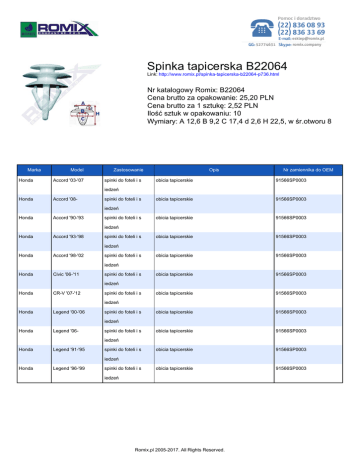 Spinka tapicerska B22064 Link: http://www.romix.pl/spinka-tapicerska-b22064-p736.html Nr katalogowy Romix: B22064 Cena brutto za opakowanie: 25,20 PLN Cena brutto za 1 sztukę: 2,52 PLN Ilość sztuk w opakowaniu: 10 Wymiary: A 12,6 B 9,2 C 17,4 d 2,6 H 22,5, w śr.otworu 8 Marka Honda Model Accord '03-'07 Zastosowanie spinki do foteli i s Opis Nr zamiennika do OEM obicia tapicerskie 91566SP0003 obicia tapicerskie 91566SP0003 obicia tapicerskie 91566SP0003 obicia tapicerskie 91566SP0003 obicia tapicerskie 91566SP0003 obicia tapicerskie 91566SP0003 obicia tapicerskie 91566SP0003 obicia tapicerskie 91566SP0003 obicia tapicerskie 91566SP0003 obicia tapicerskie 91566SP0003 obicia tapicerskie 91566SP0003 iedzeń Honda Accord '08- spinki do foteli i s iedzeń Honda Accord '90-'93 spinki do foteli i s iedzeń Honda Accord '93-'98 spinki do foteli i s iedzeń Honda Accord '98-'02 spinki do foteli i s iedzeń Honda Civic '06-'11 spinki do foteli i s iedzeń Honda CR-V '07-'12 spinki do foteli i s iedzeń Honda Legend '00-'06 spinki do foteli i s iedzeń Honda Legend '06- spinki do foteli i s iedzeń Honda Legend '91-'95 spinki do foteli i s iedzeń Honda Legend '96-'99 spinki do foteli i s iedzeń Romix.pl 2005-2017. All Rights Reserved.