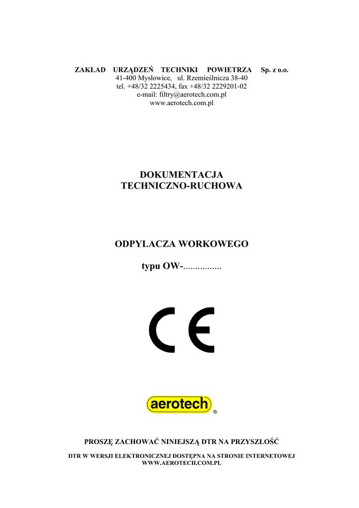 ZAKŁAD URZĄDZEŃ TECHNIKI POWIETRZA 41-400 Mysłowice, ul. Rzemieślnicza 38-40 tel. +48/32 2225434, fax +48/32 2229201-02 e-mail: [email protected] www.aerotech.com.pl Sp. z o.o. DOKUMENTACJA TECHNICZNO-RUCHOWA ODPYLACZA WORKOWEGO typu OW-................ PROSZĘ ZACHOWAĆ NINIEJSZĄ DTR NA PRZYSZŁOŚĆ DTR W WERSJI ELEKTRONICZNEJ DOSTĘPNA NA STRONIE INTERNETOWEJ WWW.AEROTECH.COM.PL Zakład Urządzeń Techniki Powietrza Sp. z o.o. SPIS TREŚCI: 1. Wiadomości ogólne 2. 2.1 2.2 2.3 2.4 2.4.1 2.4.2. 2.4.3. Wyrób Przeznaczenie wyrobu Opis wyrobu Opis działania wyrobu Charakterystyka techniczna Dane techniczne Zasady doboru odpylacza Widok i rysunek gabarytowo – zestawieniowy odpylacza OW 3. WyposaŜenie odpylacza OW 4. 4.1 4.2 Oznakowanie i transport odpylacza Oznakowanie Pakowanie i transport 5. 5.1 5.2 5.3 5.3.1 5.3.2 5.4 5.4.1 5.4.2 Instrukcja montaŜu, przygotowania do uruchomienia i konserwacji MontaŜ urządzenia DemontaŜ i utylizacja Uruchomienie Uruchomienie wstępne odpylacza współpracującego z wentylatorem Uruchomienie eksploatacyjne Konserwacja, kontrola i serwis Konserwacja Przeglądy okresowe 6. 6.1 6.2 6.3 Eksploatacja OpróŜnianie worków na odpady Eksploatacja filtrów Informacje dodatkowe 7. 7.1 7.2 7.2.1 7.2.2 7.2.3 Instrukcja bezpieczeństwa Niebezpieczeństwa podczas instalowania i eksploatacji Podstawowe wskazówki bezpieczeństwa Nieformalne środki bezpieczeństwa ZagroŜenia energią elektryczną Szczególne miejsca zagroŜeń 8. 8.1 Wykaz szybko zuŜywających się części Kryteria wymiany szybko zuŜywających się części 9. Wykaz podstawowych norm związanych 10. Karta Gwarancyjna (niedostępna w wersji elektronicznej) 11. Deklaracja Zgodności 12. Szczegółowy rysunek montaŜu zespołów OW DTR OW (niedostępna w wersji elektronicznej) 2 Zakład Urządzeń Techniki Powietrza Sp. z o.o. OSTRZEśENIE: Odpylacza OW nie wolno uruchamiać zanim dokładnie nie przeczytasz i nie zrozumiesz wszystkich instrukcji, przepisów bezpieczeństwa i innych informacji zawartych w niniejszej DTR. Niestosowanie się do tego zalecenia moŜe być przyczyną powaŜnych wypadków – poŜaru, poraŜenia elektrycznego lub cięŜkiego zranienia. NaleŜy zachować na przyszłość niniejszą DTR, a takŜe często ją przeglądać w celu stałego zapewnienia bezpiecznej eksploatacji oraz instruowania innych osób, które mogą w przyszłości uŜywać tego urządzenia. 1. Wiadomości ogólne Niniejsza Dokumentacja Techniczno – Ruchowa (DTR) zawiera instrukcje dotyczące bezpiecznego oddawania do eksploatacji odpylacza workowego typu OW, oraz wytyczne w zakresie bezpieczeństwa podczas uruchamiania, transportowania, montaŜu, demontaŜu i utylizacji, konserwacji, obsługi i napraw oraz serwisu. Niniejsza DTR jest zgodna z zasadniczymi wymaganiami w zakresie bezpieczeństwa i ochrony zdrowia podczas projektowania oraz wytwarzania maszyn i elementów bezpieczeństwa. 2. Wyrób 2.1. Przeznaczenie wyrobu Seria odpylaczy workowych, nadciśnieniowych typu OW słuŜy do miejscowego gromadzenia wiórów i pyłów powstających przy obróbce technologicznej, między innymi drewna, skóry, tkanin, tworzyw sztucznych, itp. materiałów, których temperatura nie przekracza +60oC. Do współpracy z odpylaczami naleŜy zastosować wentylatory transportowe. Odpylacze serii OW nie są wyposaŜone standardowo w wentylatory zewnętrzne. Odpylacz moŜe obsługiwać jedną lub kilka ssaw, o ile wymagana wydajność powietrza potrzebnego do odpylania nie przekroczy wydajności odpylacza. Do specjalnych zastosowań mogą być uŜyte filtry z róŜnych, odpowiednich do potrzeb materiałów. Zastosowanie odpylaczy podnosi bezpieczeństwo i higienę pracy, zmniejsza zagroŜenie poŜarowe. 2.2. Opis wyrobu Odpylacz składa się z obudowy, która stoi na przykręcanych nogach z łącznikami. W górnej i dolnej części obudowy znajdują się pierścienie. Do górnych pierścieni przymocowane są opaskami filtry (filtry workowe utrzymywane są w pozycji pionowej za pomocą prętów podtrzymujących – tylko dla standardowych długości filtrów równej 1200mm; dla filtrów wyŜszych - prętów podtrzymujących nie dostarcza się i w takim przypadku filtry naleŜy podwiesić do stropu pomieszczenia), a do dolnych worki foliowe na odpady. Wlot do odpylacza stanowi dyfuzor, do którego podłącza się rurociąg tłoczny wentylatora. W przypadku bezpośredniego podłączenia wentylatora do odpylacza, jest on przykręcony do odpylacza, bez zastosowania dyfuzora. 2.3. Opis działania wyrobu Wióry i pyły odciągnięte od obrabiarki przechodzą przez przestrzeń roboczą wentylatora i kanałem tłocznym, przez dyfuzor (bądź bezpośrednio), zostają wrzucone do odpylacza, gdzie następuje separacja pyłów i wiórów od powietrza. CięŜsze wióry bezpośrednio wpadają do foliowych worków na odpady, lekkie frakcje pyłów zostają zatrzymane na filtrach, skąd ręcznie są strzepywane do worków foliowych. DTR OW 3 Zakład Urządzeń Techniki Powietrza Sp. z o.o. 2.4. Charakterystyka techniczna 2.4.1. Dane techniczne ODPYLACZ TYPU: OW-......................... Liczba filtrów: .................szt. Wymiary filtra* Rodzaj filtra Średnica filtra Wysokość filtra Pow. Filtracji Filtr workowy ∅ 480mm ∅ 480mm ∅ 480mm ∅ 480mm 1200 mm 1800 mm 2500 mm 1000 mm 1,9m2 2,8m2 3,7m2 11m2 Filtr nabojowy * właściwe zaznaczyć .............................m2 Powierzchnia filtrów odpylacza: Wymiary worka na odpady: Średnica worka Wysokość worka Pojemność uŜytkowa ∅ 480 1400 mm 160 dm3 Łączna pojemność worków odpylacza: .............................dm3 Wymiary gabarytowe, masa i zalecana wydajność odpylacza - wg załączonego rysunku i tabeli 2.4.2. Zasady doboru odpylacza Odpylacze workowe serii OW dzięki swojej modułowej budowie umoŜliwiają samodzielne rozwijanie tworzonej instalacji odciągowej, począwszy od małych wydatków powietrza do coraz większych. Seria składa się z eleme