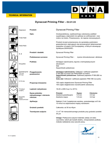 Dynacoat Priming Filler – D2.01.03 Degreaser Produkt: Dynacoat Priming Filler Opis: Grubopow okowy, szybkoschn cy celulozowy podk ad wype niaj cy odpowiedni do aplikacji ze szlifowaniem oraz mokro na mokro. Przeznaczony do napraw renowacyjnych. P180-P280 Produkt nie jest przeznaczony do sprzeda y podmiotom gospodarczym zajmuj cym si renowacyjnym lakierowaniem pojazdów w krajach Unii Europejskiej, w których obowi zuje dyrektywa 2004/42/EC. P400-P600 1:1 Produkt i dodatki: Dynacoat Priming Filler Podstawowe surowce: Dynacoat Priming Filler : Pod Istniej ce wyko czenia, cznie z termoplastycznymi akrylowymi Stal Szpachlówki poliestrowe a: Wszystkie (grawitacyjne) 1.6 mm 3-4 bar ywice nitrocelulozowe i alkidowe Przygotowanie powierzchni: Istniej ce wyko czenia: Odt ci i szlifowa papierem P180-280 na sucho lub P400-P600 na mokro. Szpachlówki poliestrowe: Szlifowa papierem P180-280 na sucho. Go a stal: Odt ci i szlifowa papierem P80-180 na sucho. Proporcja mieszania: 100 cz 100 cz Lepko 18-20 s (DIN Cup 4 w 20°C) 5-10 min. 15 minut w 60ºC Wszystkie lakiery nawierzchniowe natryskowa: ci obj to ciowo Dynacoat Priming Filler ci obj to ciowo rozcie czalnik celulozowy Dysza pistoletu natryskowego i ci nienie robocze: Pistolet: Zasilanie grawitacyjne: Zasilanie ss ce: Aplikacja: Na 2 lub 3 pojedyncze warstwy, pozostawiaj c od 5 do 10 minut na odparowanie mi dzy warstwami. Grubo Ca kowita: od 30 do 40µm pow oki: Teoretyczne zu ycie: Dysza: 1.6 mm 1.8 mm Ci nienie: 3-4 bar 3-4 bar 11 m2 / litr nierozcie czonego produktu przy grubo ci pow oki 30 µm Uwaga: Praktyczne zu ycie materia u zale y od wielu czynników, takich jak kszta t obiektu, chropowato pod metoda nak adania oraz warunki pracy. a, 11-11-2010 1/2 Mycie sprz tu: Rozcie czalnik celulozowy Czasy schni cia: Gotowy do szlifowania: 20ºC 30 min. Zalecana gradacja papieru ciernego: P360-P400 - do szlifowania na sucho P800-P1000 - do szlifowania na mokro Pokrywalny przez: Wszystkie lakiery nawierzchniowe Dynacoat Opakowanie: Priming Filler: 1 L Przechowywanie: 12 miesi cy w 20°C Kolor: 60ºC 15 min. Szary AkzoNobel Car Refinishes Polska Sp. z o.o. 02-677 Warszawa ul. Cybernetyki 7b Tel: +48 22 3210621 TYLKO DO U YTKU PROFESJONALNEGO WA NA UWAGA Informacje zawarte w niniejszej karcie charakterystyki nie s wyczerpuj ce na temat produktu, s za oparte na obecnym stanie naszej wiedzy oraz bie cych przepisach: ka da osoba stosuj ca produkt do innych celów ni zalecane w karcie informacji technicznej, bez uprzedniego uzyskania naszej pisemnej zgody na jego inne ni zalecane u ytkowanie stosuje go na w asn odpowiedzialno i ryzyko. ytkownik we wszystkich przypadkach jest odpowiedzialny za spe nienie wszystkich czynno ci, zwi zanych z przestrzeganiem obowi zuj cych przepisów i postanowie . Nale y zawsze przeczyta Kart Charakterystyki i Kart Informacji Technicznej dla danego produktu, je li taka jest dost pna. Niniejsze dane s zebrane i opracowane na podstawie stanu najlepszej naszej wiedzy (w tej Karcie lub innym dokumencie), ale nie stanowi one gwarancji w ciwo ci produktu, ani specyfikacji jako ciowej i nie mog by podstaw do reklamacji. A zatem wykorzystanie podanych informacji, jak i stosowanie produktu nie jest kontrolowane przez producenta chyba, e istniej pisemne umowy. W przeciwnym razie producent nie bierze na siebie jakiejkolwiek odpowiedzialno ci za stan produktu, jego strat lub zniszczenie podczas jego u ytkowania. Wszystkie produkty i specyfikacje techniczne s dostarczane zgodnie z zawartymi umowami i warunkami sprzeda y. Odbiorca zawsze powinien da kopii umowy i przejrze j bardzo dok adnie. Informacje zawarte w Karcie Charakterystyki mog podlega modyfikacji w wietle zmian w przepisach, stanie wiedzy, do wiadczeniu i ci ej polityki rozwoju. Osoba stosuj ca produkt jest zobowi zana do wcze niejszego zweryfikowania tej Karty przed jego stosowaniem. Wspomniane marki produktów w tej Karcie s znakami towarowymi zarejestrowanymi na rzecz AkzoNobel. Siedziba firmy AkzoNobel Car Refinishes B.V., PO Box 3 2170 BA Sassenheim, The Netherlands. www.dynacoat.com www.dynacoat.pl 11-11-2010 2/2