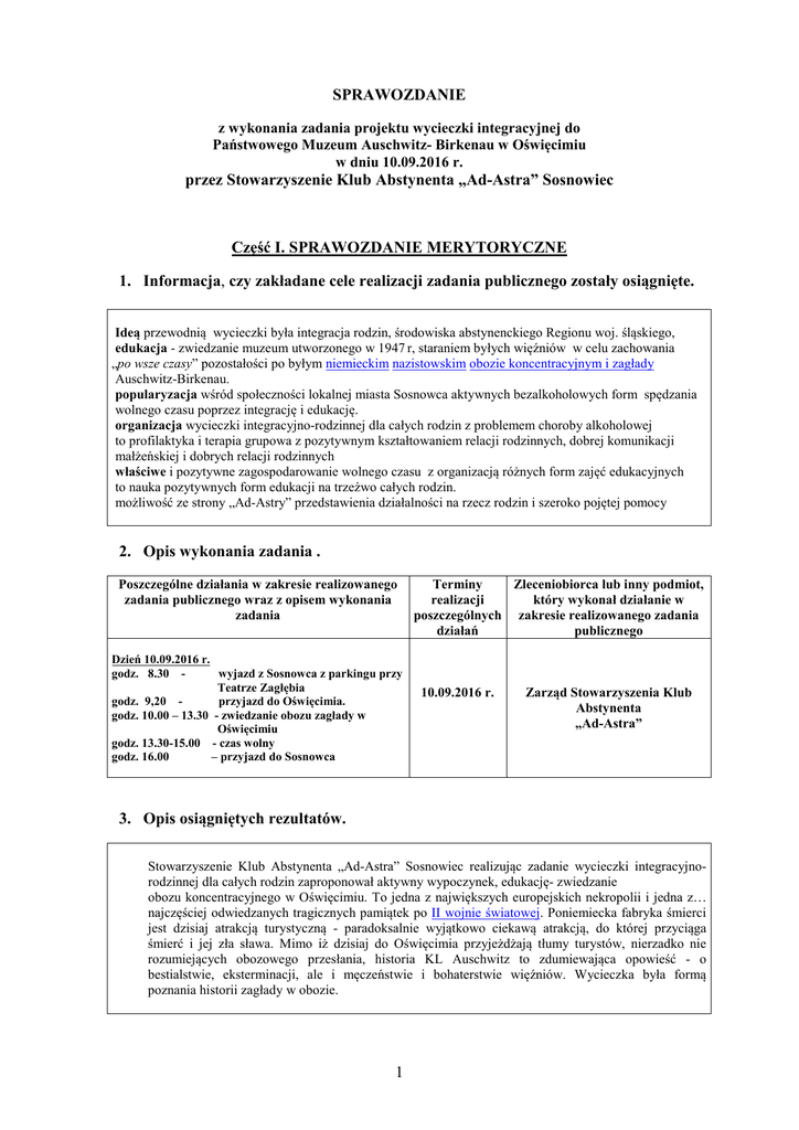 SPRAWOZDANIE z wykonania zadania projektu wycieczki integracyjnej do Państwowego Muzeum Auschwitz- Birkenau w Oświęcimiu w dniu 10.09.2016 r. przez Stowarzyszenie Klub Abstynenta „Ad-Astra” Sosnowiec Część I. SPRAWOZDANIE MERYTORYCZNE 1. Informacja, czy zakładane cele realizacji zadania publicznego zostały osiągnięte. Ideą przewodnią wycieczki była integracja rodzin, środowiska abstynenckiego Regionu woj. śląskiego, edukacja - zwiedzanie muzeum utworzonego w 1947 r, staraniem byłych więźniów w celu zachowania „po wsze czasy” pozostałości po byłym niemieckim nazistowskim obozie koncentracyjnym i zagłady Auschwitz-Birkenau. popularyzacja wśród społeczności lokalnej miasta Sosnowca aktywnych bezalkoholowych form spędzania wolnego czasu poprzez integrację i edukację. organizacja wycieczki integracyjno-rodzinnej dla całych rodzin z problemem choroby alkoholowej to profilaktyka i terapia grupowa z pozytywnym kształtowaniem relacji rodzinnych, dobrej komunikacji małżeńskiej i dobrych relacji rodzinnych właściwe i pozytywne zagospodarowanie wolnego czasu z organizacją różnych form zajęć edukacyjnych to nauka pozytywnych form edukacji na trzeźwo całych rodzin. możliwość ze strony „Ad-Astry” przedstawienia działalności na rzecz rodzin i szeroko pojętej pomocy 2. Opis wykonania zadania . Poszczególne działania w zakresie realizowanego zadania publicznego wraz z opisem wykonania zadania Dzień 10.09.2016 r. godz. 8.30 wyjazd z Sosnowca z parkingu przy Teatrze Zagłębia godz. 9,20 przyjazd do Oświęcimia. godz. 10.00 – 13.30 - zwiedzanie obozu zagłady w Oświęcimiu godz. 13.30-15.00 - czas wolny godz. 16.00 – przyjazd do Sosnowca Terminy Zleceniobiorca lub inny podmiot, który wykonał działanie w realizacji poszczególnych zakresie realizowanego zadania działań publicznego 10.09.2016 r. Zarząd Stowarzyszenia Klub Abstynenta „Ad-Astra” 3. Opis osiągniętych rezultatów. Stowarzyszenie Klub Abstynenta „Ad-Astra” Sosnowiec realizując zadanie wycieczki integracyjnorodzinnej dla całych rodzin zaproponował aktywny wypoczynek, edukację- zwiedzanie obozu koncentracyjnego w Oświęcimiu. To jedna z największych europejskich nekropolii i jedna z… najczęściej odwiedzanych tragicznych pamiątek po II wojnie światowej. Poniemiecka fabryka śmierci jest dzisiaj atrakcją turystyczną - paradoksalnie wyjątkowo ciekawą atrakcją, do której przyciąga śmierć i jej zła sława. Mimo iż dzisiaj do Oświęcimia przyjeżdżają tłumy turystów, nierzadko nie rozumiejących obozowego przesłania, historia KL Auschwitz to zdumiewająca opowieść - o bestialstwie, eksterminacji, ale i męczeństwie i bohaterstwie więźniów. Wycieczka była formą poznania historii zagłady w obozie. 1 4. Liczbowe określenie skali działań zrealizowanych w ramach zadania. W realizacji projektu i wykonanego zadania wycieczki integracyjnej w dniu 10.09.2016 r. udział łącznie wzięło 48 osób członków „Ad-Astry” wraz z rodzinami . Część II. Sprawozdanie z wykonania wydatków. 1. Rozliczenie ze względu na rodzaj kosztów ( w zł ). 1.Ubezpieczenie uczestników wycieczki do Oswięcimia w dniu 10.09.2016 r. II. Z tego pokryty z wkładu osobowego w tym pracy społecznej członków i świadczeń wolontariatu Z tego z finansowych środków własnychśrodków z innych źródeł,w tym wpłat i opłat adresatów zadania publicznego Koszt całkowity Z tego pokryty z dotacji Bieżący okres sprawozdawczy – za okres realizacji zadania projektu ( w zł). Z tego z finansowych środków własnych środków z innych źródeł w tym wpłat i opłat adresatów zadania publicznego Z tego pokryty z wkładu osobowego w tym pracy społecznej i świadczeń wolontariatu Z tego pokryty z dotacji Poprzedni okres sprawozdawczy (w zł) Z tego pokryty z wkładu osobowego w tym pracy społecznej członków klubu i świadczeń wolontariuszy Koszt całkowity Koszty merytoryczne z uwzględnieniem kosztów poniesionych przez Stowarzyszenie Klub Abstynenta „AdAstra” Z tego pokryty z finansowych środków własnych , środków z innych źródeł, w tym wpłat i opłat adresatów zadania publiczn. I. Całość zadania zgodnie z projektem Z tego pokryty z dotacji Rodzaj kosztów Koszt całkowity Lp . 97,00 0,00 97,00 0,00 0,00 0,00 0,00 0,00 97,00 0,00 97,00 0,00 2. Opłata za wynajem autokaru do przewozu uczestników wycieczki w dniu 10.09.2016 r na trasie Sosnowiec – Oświęcim - Sosnowiec. 650,00 0,00 650,00 0,00 0,00 0,00 0,00 0,00 650,00 0,00 650,00 0,00 3. Opłata za karty wstępu do Muzeum Auschwitz Birkenau w dniu 10.09.2016 r. 900,00 0,00 900,00 0,00 0,00 0,00 0,00 0,00 900,00 0,00 900,00 0,00 4. Opłata za parkingi w Oświęcimiu. 42,00 0,00 42,00 0,00 0,00 0,00 0,00 0,00 42,0 0,00 42,00 0,00 Ogółem 1.689,00 0,00 1.689,00 0,00 0,00 0,00 0,00 0,00 1.689,00 0,00 1.689,00 0,00 2 2. Rozliczenie ze względu na źródło finansowania. Źródło finansowania Całość zadania Bieżący okres sprawozdawczy za okres realizacji zadania zł % zł % Koszty pokryte z dotacji: 0,00 0,00 0,00 0,00 Z tego z odsetek bankowych od dotacji 0,00 0,00 0,00 0,00 596,00 35,29 596,00 35,29 1.093,00 64,71 1.093,00 64,71 0,00 0,00 0,00 0,00 1,689,00 100 1.689,00 100 Koszty pokryte ze środków finansowych własnych stowarzyszenia Koszty pokryte ze środków finansowych z innych źródeł (ogółem):z tego: z wpłat i opłat adresatów zadania projektu wycieczki integracyjnej do Oświęcimia. Koszty pokryte z wkładu osobowego (w tym świadczeń wolontariuszy , pracy społecznej członków) Ogółem: Uwagi, które mogące mieć znaczenie przy ocenie prawidłowości wykonania wydatków. Tego typu zadania są realizowane co roku. Realizacja projektów przez nasze Stowarzyszenie przyczynia się w znacznym stopniu do zmniejszenia skali problemu jakim jest alkoholizm, że można trzeźwo żyć , bawić się i wypoczywać. Poprzez naszą działalność każdego roku w szereg