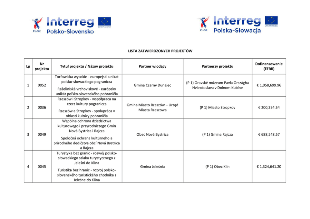 LISTA ZATWIERDZONYCH PROJEKTÓW Lp Nr projektu 1 0052 2 0036 3 0049 4 0045 Tytuł projektu / Názov projektu Torfowiska wysokie - europejski unikat polsko-słowackiego pogranicza Rašeliniská vrchoviskové - európsky unikát poľsko-slovenského pohraničia Rzeszów i Stropkov - współpraca na rzecz kultury pogranicza Rzeszów a Stropkov - spolupráca v oblasti kultúry pohraničia Wspólna ochrona dziedzictwa kulturowego i przyrodniczego Gmin Nová Bystrica i Rajcza Spoločná ochrana kultúrneho a prírodného dedičstva obcí Nová Bystrica a Rajcza Turystyka bez granic - rozwój polskosłowackiego szlaku turystycznego z Jeleśni do Klina Turistika bez hraníc - rozvoj poľskoslovenského turistického chodnika z Jeleśne do Klina Partner wiodący Partnerzy projektu Dofinansowanie (EFRR) Gmina Czarny Dunajec (P 1) Oravské múzeum Pavla Országha Hviezdoslava v Dolnom Kubíne € 1,058,699.96 Gmina Miasto Rzeszów – Urząd Miasta Rzeszowa (P 1) Miasto Stropkov € 200,254.54 Obec Nová Bystrica (P 1) Gmina Rajcza € 688,548.57 Gmina Jeleśnia (P 1) Obec Klin € 1,324,641.20 5 0047 6 0073 7 0051 8 9 0072 0038 Stworzenie warunków dla zachowania kulturowego i przyrodniczego dziedzictwa na polskiej i słowackiej Orawie Vytvorenie podmienok pre zachovanie kultúrneho a prírodného dedičstva na poľskej a slovenskej Orave Archeologia żywa jako unikatowy produkt turystyki kulturowej Karpat Živá archeológia ako jedinečný produkt kultúrneho turizmu Karpát Nowy produkt turystyczny – odcinek transeuropejskiej trasy rowerowej EuroVelo 11 – Preszów-MuszynaMniszek nad Popradem Nový turistický produkt - časť transeurópskej cyklotrasy EuroVelo11 Prešov-Muszyna-Mníšek nad Popradom Babia Góra Trails Babia hora Trails Razem wędrujemy już 500 lat Spoločne putujeme už 500 rokov Gmina Lipnica Wielka (P 1) Obec Bobrov € 586,731.83 Muzeum Podkarpackie w Krośnie (P 1) Vlastivedné múzeum v Hanušovciach nad Topľou € 1,067,417.20 Miasto i Gmina Uzdrowiskowa Muszyna (P 1) Ľubovnianske regionálne združenie miest a obcí Stará Ľubovňa (P 2) Severovýchod Slovenska € 2,768,349.05 Gmina Zawoja (P 1) Obec Oravska Polhora € 688,934.18 Cirkevný zbor Evanjelickej cirkvi augsburského vyznania na Slovensku Dolný Kubín Cirkevný zbor Evanjelickej cirkvi augsburského vyznania na Slovensku Dolný Kubín (P 1) Parafia Ewangelicko-Augsburska w Cieszynie € 736,130.92 10 11 0034 0026 12 0070 13 0061 14 0066 Wspólna digitalizacja 3D obiektów historycznych obszaru transgranicznego SK-PL Spoločná 3D digitalizácia historických objektov cezhraničného územia SK-PL Śladem zabytków techniki z Podhala na Liptów Po stopách technických pamiatok z Podhalia na Liptov „Przy wiejskiej drodze” - w rytmie pracy dawnych zakładów przemysłowych i pracowni rzemieślniczych „Pri ceste na dedine" - v rytme práce dávnych priemyselných závodov a remeselných dielni Eskapady na książęcym szlaku Eskapady na kniežacej ceste Muszyna, Kamenica, Lipany wzmocnienie transgranicznej współpracy w sferze dziedzictwa kulturowo - przyrodniczego Muszyna, Kamenica, Lipany - posilnenie cezhraničnej spolupráce v oblasti kultúrneho a prírodného dedičstva Europejskie Ugrupowanie Współpracy Terytorialnej TRITIA z ograniczoną odpowiedzialnością Žilinská univerzita v Žiline € 610,104.50 Gmina Miasto Nowy Targ (P 1) Obec Ludrová (P 2) Žilinský samosprávny kraj € 1,668,090.92 Muzeum - Orawski Park Etnograficzny w Zubrzycy Górnej (P 1) Slovenské národné múzeum (P 2) Múzeum oravskej dediny w Zuberecu (P 3) Oravské múzeum Pavla Országha Hviezdoslava v Dolnom Kubíne (P 4) Muzeum Okręgowe w Nowym Sączu € 1,296,622.16 Gmina Miejska Jarosław (P 1) Miasto Svidnik € 1,392,227.89 Miasto i Gmina Uzdrowiskowa Muszyna (P 1) Mesto Lipany (P 2) Obec Kamenica € 801,846.15 15 0056 16 0025 17 0044 Budowa transgranicznej słowackopolskiej trasy turystycznej Výstavba cezhraničnej slovenskopoľskej turistickej trasy Budatín-Strumień: współpraca na pograniczu - etap 2 Budatín-Strumień: spolupráca na pohraničí - II.etapa Wędrowanie bez plecaka – wykorzystanie i promocja zasobów dziedzictwa kulturowego i przyrodniczego pogranicza Vandrovanie bez plecniaka – využitie a propagácia bohatstva kultúrneho a prírodného dedičstva pohraničia Mesto Krásno nad Kysucou (P 1) Gmina Rajcza (P 2) Gmina Milówka (P 3) Obec Oščadnica (P 4) Obec Dunajov € 3,040,227.61 Žilinský samosprávny kraj (P 1) Gmina Strumień € 1,151,633.79 Stowarzyszenie Euroregion Karpacki Polska/Združenie Karpatský Euroregión Poľsko (P 1) Združenie Karpatský Euroregión Slovensko Sever/Stowarzyszenie Euroregion Karpacki Słowacja Północ € 558,511.20 Mesto Dolný Kubín (P 1) Mesto Trstená (P 2) Obec Liesek (P 3) Obec Hladovka (P 4) Obec Suchá Hora (P 5) Rímskokatolícka cirkev, farnosť Trstená (P 6) Gmina Czarny Dunajec (P 7) Gmina Mesto Zakopané (P 8) Gmina Poronin (P 9) Gmina Koscielisko € 1,857,898.80 Rowerem po kulturowym i przyrodniczym dziedzictwie pogranicza 18 0020 Na bicykli za kultúrnym a prírodným dedičstvom pohraničného regiónu 19 0068 Szlak Kultury Wołoskiej Trasa Valašskej Kultúry Stowarzyszenie na Rzecz Rozwoju i Promocji Podkarpacia „Pro Carpathia“ (P 1) Detská organizácia Fénix, o.z. Územná organizácia Snina (P 2) Województwo Podkarpackie (P 3) Regionálna rozvojová agentúra Svidník (P 4) Województwo Małopolskie (P 5) Związek Podhalan w Polsce (P 6) Stowarzyszenie Wspierania Inicjatyw Gospodarczych DELTA PARTNER (P 7) Obec Oravská Polhora (P 8) Obec Malatiná (P 9) Obec Zázrivá € 1,575,700.10