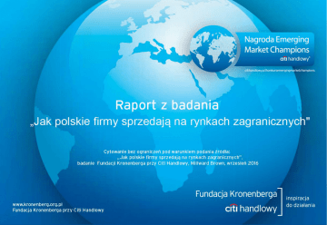 www.kronenberg.org.pl Fundacja Kronenberga przy Citi Handlowy www.kronenberg.org.pl Fundacja Kronenberga przy Citi Handlowy Informacja o badaniu CELE BADANIA PRÓBA TECHNIKA ZBIERANIA DANYCH TERMIN REALIZACJI Głównym celem badania jest zdiagnozowanie, w jaki sposób polskie firmy sprzedają na rynkach zagranicznych. Badanie zrealizowane na próbie losowo-kwotowej objęło n = 300 wywiadów – firmy o obrotach powyżej 8 mln zł, działające od przynajmniej 3 lat na rynku. Dodatkowym warunkiem rekrutacyjnym było pochodzenie minimum 10% obrotu firmy z działalności międzynarodowej. Badanie zostało zrealizowane techniką CATI (Computer Assisted Telephone Interviews). Wrzesień 2016 r. www.kronenberg.org.pl Fundacja Kronenberga przy Citi Handlowy Charakterystyka działalności na rynkach zagranicznych Czas prowadzenia działalności międzynarodowej Udział sprzedaży zagranicznej w obrocie firmy Ogół firm N=300 Ogół firm N=300 44% 46% 25% 25% 23% 6% Od 2 do 5 lat Od 6 do 10 lat Od 11 do 15 lat Dłużej niż 15 lat (przed 1990) www.kronenberg.org.pl Fundacja Kronenberga przy Citi Handlowy 31% Od 10% do 24% obrotu Od 25% do 49% obrotu Powyżej 50% obrotu Główne kierunki polskich eksporterów Główny rynek (największy udział w sprzedaży) Kraje, w których prowadzona jest sprzedaż 2016 Niemcy 74% Niemcy 48% 43% Francja Włochy 37% Rosja Czechy 37% Wielka. Brytania 37% Słowacja 35% Litwa 33% Rosja 32% Holandia 8% Holandia 7% Francja 30% Ogół firm N=300 www.kronenberg.org.pl Fundacja Kronenberga przy Citi Handlowy 6% Klienci polscy vs zagraniczni Czy w porównaniu do klientów z Polski klienci w tym kraju są: Ogół firm N=300 79% 21% Bardziej wymagający Okres prowadzenia działalności międzynarodowej Obroty firm w ostatnim roku powyżej 150 mln 150 15 - 150 mln PLN 8-15 mln PLN Mniej wymagający 14% 86% 21% 79% 25% www.kronenberg.org.pl Fundacja Kronenberga przy Citi Handlowy 75% dłużej niż 15 lat 11-15 lat 3-10 lat 14% 86% 29% 71% 24% 76% Rentowność Czy Państwa działalność na rynkach zagranicznych zapewnia większą rentowność niż działalność na rynku krajowym? Ogół firm N=300 73% 27% Tak Procent całkowitych obrotów generowanych z działalności zagranicznej Obroty firm w ostatnim roku 8 mln do 14,9 mln Nie 20% 80% powyżej 50%obrotu 18% 82% 15 mln do 150 mln 32% 68% 34% 10-49% obrotu Powyżej 150 mln 66% 30% www.kronenberg.org.pl Fundacja Kronenberga przy Citi Handlowy 70% Rentowność za granicą, bo... Z jakich powodów rentowność za granicą jest większa? Ogół firm N=300 (wskazania powyżej 10%) Korzystniejsze ceny/wyższe marże 48% Większy popyt/zapotrzebowanie na produkty i usługi System walutowy/korzystny system walutowy Organizacja rynku i lepsze środowisko biznesowe Niższe koszty działalności/produkcji www.kronenberg.org.pl Fundacja Kronenberga przy Citi Handlowy 46% 15% 12% 11% Większy popyt częściej podkreślają Ci, którzy generują ponad 50% obrotów za granicą (57% vs. 35%), w większej liczbie krajów (49% - ponad 6 krajach vs. 39%). Przeszkody w prowadzeniu działalności Główna przeszkoda w prowadzeniu działalności na rynkach zagranicznych Ogół firm N=300 (top 5 wskazań) Firmy o obrotach 8 – 15 mln PLN (top 5 wskazań) Firmy o obrotach 15 – 150 mln PLN (top 5 wskazań) Duża konkurencja na rynkach zagranicznych Duża konkurencja25% na rynkach zagranicznych 30% 24% Firmy o obrotach powyżej 150 mln PLN (top 5 wskazań) Bariery podatkowe/bariery polityki celnej 16% Biurokracja/bariery formalnoprawne Biurokracja/bariery formalnoprawne 17% 14% Różnice w kursach walut 14% 18% Biurokracja/bariery formalno-prawne 22% Różnice w kursach walut 10% 6% Bariera społeczno kulturowa/językowa Bariera 9% społeczno kulturowa/językowa Wysokie koszty związane głównie z transportem, serwisem Wysokie koszty związane głównie z transportem, serwisem 4% www.kronenberg.org.pl Fundacja Kronenberga przy Citi Handlowy 7% 5% 10% 2% Różnice w kursach walut Bariera społeczno kulturowa/językow a Brak kapitału 13% 9% 7% Plany Czy w ciągu najbliższych lat planują 84% Ogół firm N=300 16% Utrzymanie pozycji na rynku/rynkach Rozszerzenie obszaru działalności firmy zagranicznych o kolejny/e rynek/rynki zagraniczne Od jak dawna firma działa na polskim rynku? Liczba krajów, w których prowadzona jest działalność 80% powyżej 10 lat 88% 7 lub więcej krajów 20% 11% 7% 78% do 6 krajów 12% 93% Tak 88% poniżej 10 lat Firmy prowadzące sprzedaż w Wielkiej Brytanii 79% Nie 22% 20% Branże W jakich branżach lub grupach produktów polskie produkty/usługi cenione są na rynkach zagranicznych? Ogół firm N=300 (możliwa więcej niż jedna odpowiedź) Branża spożywcza: artykuły spożywcze, żwyność 38% Branża budowlana 21% Przemysł meblarski 18% Rolnictwo: produkty rolne, owoce, warzywa Branża motoryzacyjna: autobusy, tramwaje, pociągi, łodzie, jachty Transport, spedycja, logistyka Branża informatyczna www.kronenberg.org.pl Fundacja Kronenberga przy Citi Handlowy 14% 11% 9% 8% Szczególnym uznaniem branża spożywcza cieszy się wśród zachowawczych firm działających na dużą skalę (obecni w ponad 6 krajach) (44% vs. 29%), osiągających większą rentowność w Polsce (51% vs. 34%). Atuty polskich produktów Jakie cechy wyróżniają polskie produkty/usługi na rynkach zagranicznych? Ogół firm N=300 (możliwa więcej niż jedna odpowiedź) Wysoka jakość 59% 40% Konkurencyjna cena Wzornictwo Terminowość dostaw www.kronenberg.org.pl Fundacja Kronenberga przy Citi Handlowy 9% 6% Jakość polskich dóbr eksportowych ceni aż 78% tych, którzy jednocześnie uważają, że to polscy klienci są tymi bardziej wymagającymi. Co po Brexicie? Raczej bez obaw, jeżeli już to... Prowadzenie sprzedaży w Wielkiej Brytanii Ogół firm N=300 (najważniejsze wskazania) Tak Nie (najważniejsze wskazania) (najważniejsze wskazania) Ograniczenie przepływu towarów i usług* 12% 14% 10% Niekorzystne różnice kurso