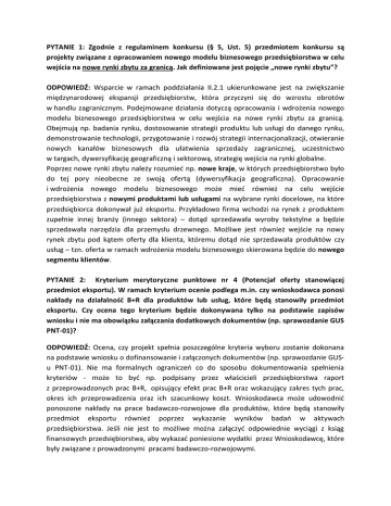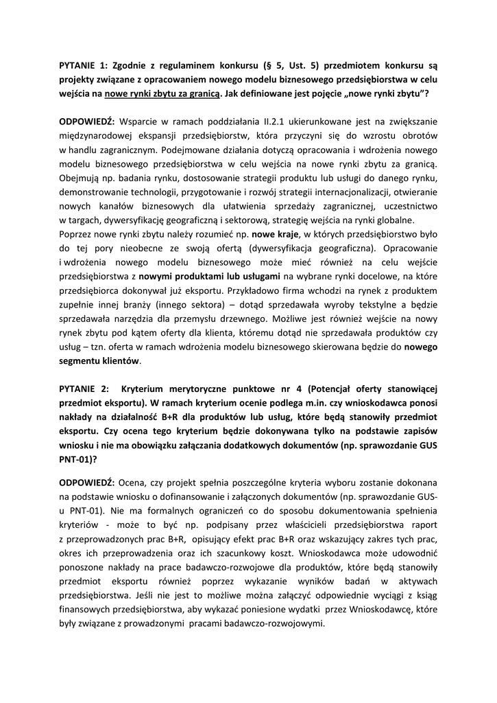 PYTANIE 1: Zgodnie z regulaminem konkursu (§ 5, Ust. 5) przedmiotem konkursu są projekty związane z opracowaniem nowego modelu biznesowego przedsiębiorstwa w celu wejścia na nowe rynki zbytu za granicą. Jak definiowane jest pojęcie „nowe rynki zbytu”? ODPOWIEDŹ: Wsparcie w ramach poddziałania II.2.1 ukierunkowane jest na zwiększanie międzynarodowej ekspansji przedsiębiorstw, która przyczyni się do wzrostu obrotów w handlu zagranicznym. Podejmowane działania dotyczą opracowania i wdrożenia nowego modelu biznesowego przedsiębiorstwa w celu wejścia na nowe rynki zbytu za granicą. Obejmują np. badania rynku, dostosowanie strategii produktu lub usługi do danego rynku, demonstrowanie technologii, przygotowanie i rozwój strategii internacjonalizacji, otwieranie nowych kanałów biznesowych dla ułatwienia sprzedaży zagranicznej, uczestnictwo w targach, dywersyfikację geograficzną i sektorową, strategię wejścia na rynki globalne. Poprzez nowe rynki zbytu należy rozumieć np. nowe kraje, w których przedsiębiorstwo było do tej pory nieobecne ze swoją ofertą (dywersyfikacja geograficzna). Opracowanie i wdrożenia nowego modelu biznesowego może mieć również na celu wejście przedsiębiorstwa z nowymi produktami lub usługami na wybrane rynki docelowe, na które przedsiębiorca dokonywał już eksportu. Przykładowo firma wchodzi na rynek z produktem zupełnie innej branży (innego sektora) – dotąd sprzedawała wyroby tekstylne a będzie sprzedawała narzędzia dla przemysłu drzewnego. Możliwe jest również wejście na nowy rynek zbytu pod kątem oferty dla klienta, któremu dotąd nie sprzedawała produktów czy usług – tzn. oferta w ramach wdrożenia modelu biznesowego skierowana będzie do nowego segmentu klientów. PYTANIE 2: Kryterium merytoryczne punktowe nr 4 (Potencjał oferty stanowiącej przedmiot eksportu). W ramach kryterium ocenie podlega m.in. czy wnioskodawca ponosi nakłady na działalność B+R dla produktów lub usług, które będą stanowiły przedmiot eksportu. Czy ocena tego kryterium będzie dokonywana tylko na podstawie zapisów wniosku i nie ma obowiązku załączania dodatkowych dokumentów (np. sprawozdanie GUS PNT-01)? ODPOWIEDŹ: Ocena, czy projekt spełnia poszczególne kryteria wyboru zostanie dokonana na podstawie wniosku o dofinansowanie i załączonych dokumentów (np. sprawozdanie GUSu PNT-01). Nie ma formalnych ograniczeń co do sposobu dokumentowania spełnienia kryteriów - może to być np. podpisany przez właścicieli przedsiębiorstwa raport z przeprowadzonych prac B+R, opisujący efekt prac B+R oraz wskazujący zakres tych prac, okres ich przeprowadzenia oraz ich szacunkowy koszt. Wnioskodawca może udowodnić ponoszone nakłady na prace badawczo-rozwojowe dla produktów, które będą stanowiły przedmiot eksportu również poprzez wykazanie wyników badań w aktywach przedsiębiorstwa. Jeśli nie jest to możliwe można załączyć odpowiednie wyciągi z ksiąg finansowych przedsiębiorstwa, aby wykazać poniesione wydatki przez Wnioskodawcę, które były związane z prowadzonymi pracami badawczo-rozwojowymi. PYTANIE 3: Czy warunkiem udziału w konkursie na wdrożenie nowego modelu biznesowego przedsiębiorstwa zmierzającego do jego internacjonalizacji jest wcześniejszy udział i otrzymanie dofinansowania w konkursie na opracowanie nowego modelu biznesowego przedsiębiorstwa zmierzającego do jego internacjonalizacji? ODPOWIEDŹ: Konkursy w ramach Poddziałania II.2.1 na dwa typy projektów: - opracowanie nowego modelu biznesowego, - wdrożenie nowego modelu biznesowego organizowane są niezależnie. Regulamin konkursu nr RPLD.02.02.01-IP.02-10-006/16 na opracowanie nowego modelu biznesowego przedsiębiorstwa zmierzającego do jego internacjonalizacji, nie zakłada konieczności ubiegania się o dofinansowanie projektu na wdrożenie modelu. Z dokumentów programowych RPO WŁ 2014-2020 nie wynika, że warunkiem udziału w konkursie na wdrożenie nowego modelu biznesowego przedsiębiorstwa zmierzającego do jego internacjonalizacji będzie wcześniejszy udział i otrzymanie dofinansowania w konkursie na opracowanie nowego modelu biznesowego. Należy mieć jednak świadomość, iż obligatoryjnym załącznikiem do konkursu na wdrożenie nowego modelu biznesowego przedsiębiorstwa zmierzającego do jego internacjonalizacji będzie strategia biznesowa w zakresie internacjonalizacji. PYTANIE 4: Wskaźnik rezultatu bezpośredniego: Liczba kontraktów handlowych zagranicznych podpisanych przez przedsiębiorstwa wsparte w zakresie internacjonalizacji, nie jest adekwatny do typu projektu będącego przedmiotem konkursu. Czy jest wskaźnikiem obligatoryjnym dla projektów będących przedmiotem konkursu opracowanie nowego modelu biznesowego przedsiębiorstwa zmierzającego do jego internacjonalizacji? ODPOWIEDŹ: Wskaźnik odnosi się do całego poddziałania II.2.1 Internacjonalizacja przedsiębiorstw tj. do obu typów projektów - opracowanie i wdrożenie nowego modelu biznesowego przedsiębiorstwa zmierzającego do jego internacjonalizacji. Dla projektów będących przedmiotem dofinansowania w bieżącym konkursie nie musi być określony, ale nie można wykluczyć, że może być w niektórych przypadkach osiągnięty.