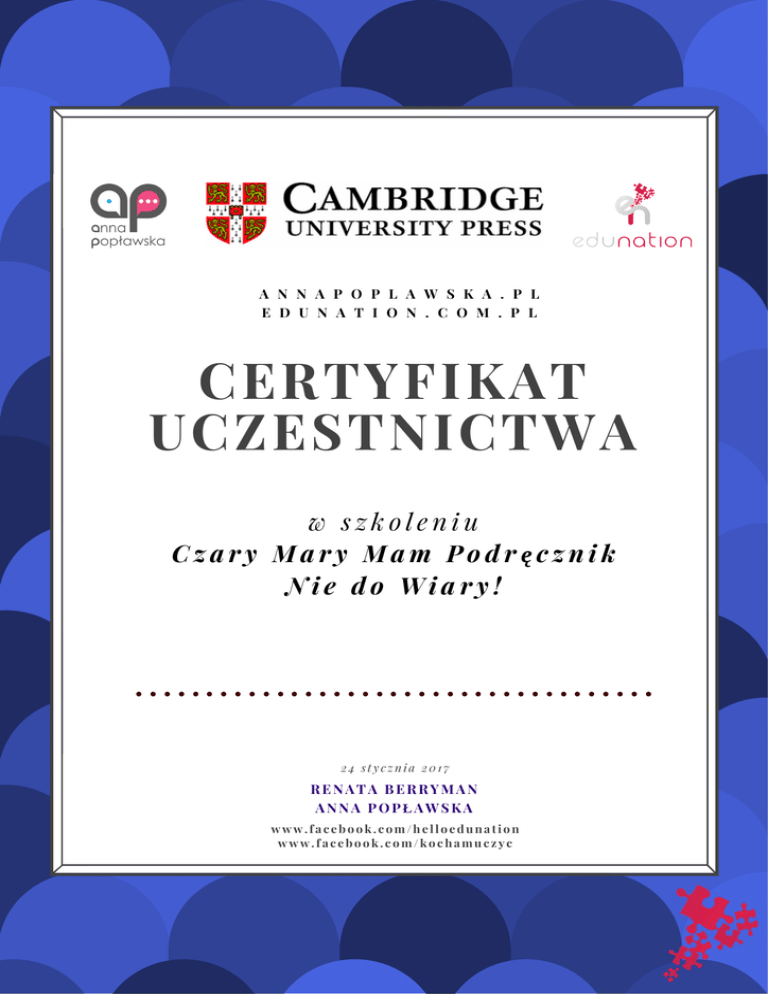 Certyfikat webinarium Czary Mary Mam Podręcznik Nie do Wiary!