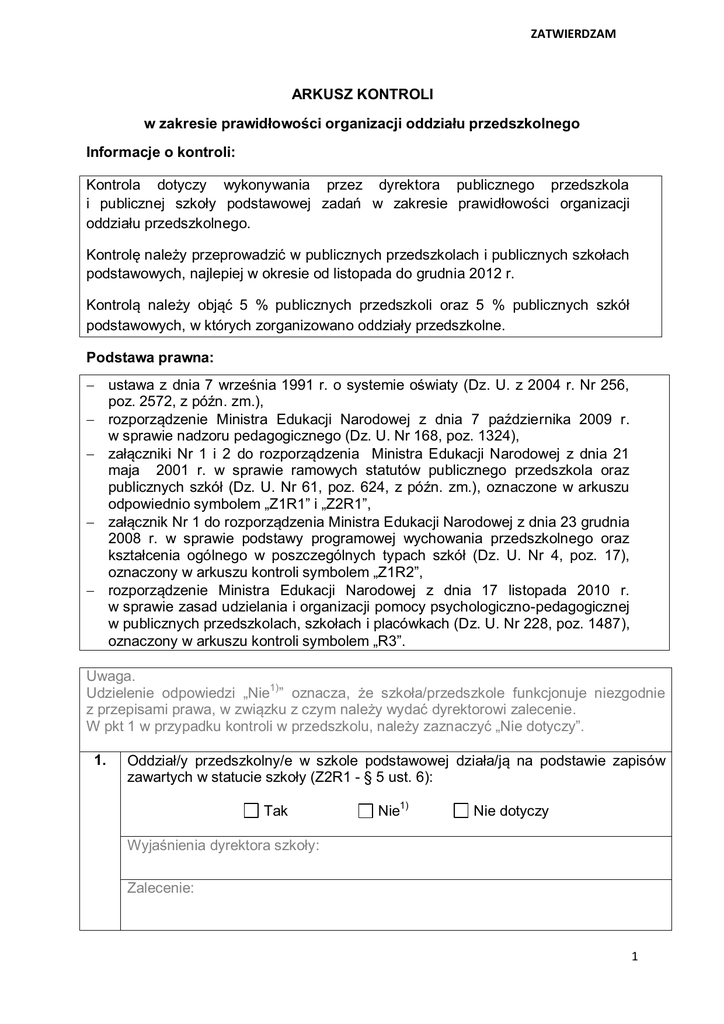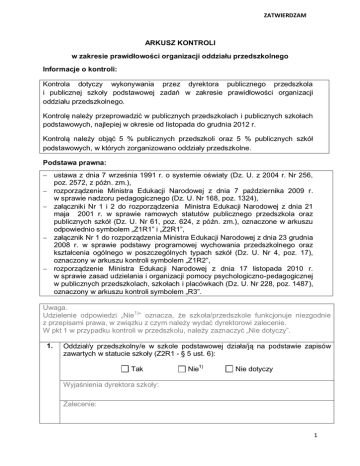 ZATWIERDZAM ARKUSZ KONTROLI w zakresie prawidłowości organizacji oddziału przedszkolnego Informacje o kontroli: Kontrola dotyczy wykonywania przez dyrektora publicznego przedszkola i publicznej szkoły podstawowej zadań w zakresie prawidłowości organizacji oddziału przedszkolnego. Kontrolę należy przeprowadzić w publicznych przedszkolach i publicznych szkołach podstawowych, najlepiej w okresie od listopada do grudnia 2012 r. Kontrolą należy objąć 5 % publicznych przedszkoli oraz 5 % publicznych szkół podstawowych, w których zorganizowano oddziały przedszkolne. Podstawa prawna: ustawa z dnia 7 września 1991 r. o systemie oświaty (Dz. U. z 2004 r. Nr 256, poz. 2572, z późn. zm.), rozporządzenie Ministra Edukacji Narodowej z dnia 7 października 2009 r. w sprawie nadzoru pedagogicznego (Dz. U. Nr 168, poz. 1324), załączniki Nr 1 i 2 do rozporządzenia Ministra Edukacji Narodowej z dnia 21 maja 2001 r. w sprawie ramowych statutów publicznego przedszkola oraz publicznych szkół (Dz. U. Nr 61, poz. 624, z późn. zm.), oznaczone w arkuszu odpowiednio symbolem „Z1R1” i „Z2R1”, załącznik Nr 1 do rozporządzenia Ministra Edukacji Narodowej z dnia 23 grudnia 2008 r. w sprawie podstawy programowej wychowania przedszkolnego oraz kształcenia ogólnego w poszczególnych typach szkół (Dz. U. Nr 4, poz. 17), oznaczony w arkuszu kontroli symbolem „Z1R2”, rozporządzenie Ministra Edukacji Narodowej z dnia 17 listopada 2010 r. w sprawie zasad udzielania i organizacji pomocy psychologiczno-pedagogicznej w publicznych przedszkolach, szkołach i placówkach (Dz. U. Nr 228, poz. 1487), oznaczony w arkuszu kontroli symbolem „R3”. Uwaga. Udzielenie odpowiedzi „Nie1)” oznacza, że szkoła/przedszkole funkcjonuje niezgodnie z przepisami prawa, w związku z czym należy wydać dyrektorowi zalecenie. W pkt 1 w przypadku kontroli w przedszkolu, należy zaznaczyć „Nie dotyczy”. 1. Oddział/y przedszkolny/e w szkole podstawowej działa/ją na podstawie zapisów zawartych w statucie szkoły (Z2R1 - § 5 ust. 6): Tak Nie1) Nie dotyczy Wyjaśnienia dyrektora szkoły: Zalecenie: 1 2. 1) Statut określa w zakresie: cele a) udzielania dzieciom § 2 ust. 1 pkt 1 lit. a): i zadania pomocy wynikające Tak przepisów psychologiczno-pedagogicznej prawa, (Z1R1 - Nie1) Tak b) organizowania opieki § 2 ust. 1 pkt 1 lit. b): z nad dziećmi niepełnosprawnymi (Z1R1 - Nie1) c) umożliwiania dzieciom podtrzymywania poczucia tożsamości narodowej, etnicznej, językowej i religijnej (Z1R1 - § 2 ust. 1 pkt 1 lit. c): Tak Nie1) 2) Statut określa: a) sposób realizacji zadań, z uwzględnieniem wspomagania indywidualnego rozwoju dziecka oraz wspomagania rodziny w wychowaniu dziecka i przygotowaniu go do nauki w szkole, a w przypadku dzieci niepełnosprawnych – ze szczególnym uwzględnieniem rodzaju i stopnia niepełnosprawności (Z1R1 - § 2 ust. 1 pkt 2): Tak Nie1) b) sposób sprawowania opieki nad dziećmi w czasie zajęć oraz zajęć realizowanych poza placówką (Z1R1 - § 2 ust. 1 pkt 3): Tak Nie1) c) szczegółowe zasady przyprowadzania i odbierania dzieci przez rodziców (prawnych opiekunów) lub upoważnioną przez nich osobę zapewniającą dziecku pełne bezpieczeństwo (Z1R1 - § 2 ust. 1 pkt 4): Tak Nie1) 3) Statut określa szczegółowo zakres zadań nauczycieli prowadzących zajęcia w oddziale przedszkolnym związanych z: a) współdziałaniem z rodzicami (prawnymi opiekunami) w sprawach wychowania i nauczania dzieci, z uwzględnieniem prawa rodziców (prawnych opiekunów) do znajomości zadań wynikających w szczególności z programu wychowania przedszkolnego realizowanego w danym oddziale i uzyskiwania informacji dotyczących dziecka, jego zachowania i rozwoju (Z1R1 - § 15 ust. 1 pkt 1): 2 Nie1) Tak b) planowaniem i prowadzeniem pracy wychowawczo-dydaktycznej oraz odpowiedzialnością za jej jakość (Z1R1 - § 15 ust. 1 pkt 2): Nie1) Tak c) prowadzeniem obserwacji pedagogicznych mających na celu poznanie i zabezpieczenie potrzeb rozwojowych dzieci oraz dokumentowaniem tych obserwacji (Z1R1 - § 15 ust. 1 pkt 3): Nie1) Tak d) współpracą ze specjalistami świadczącymi pomoc psychologicznopedagogiczną, opiekę zdrowotną i inną (Z1R1 - § 15 ust. 1 pkt 4): Nie1) Tak Wyjaśnienia dyrektora szkoły/przedszkola: Zalecenie: 3. 1) Liczba oddziałów …….. 2) Liczba dzieci w oddziale przedszkolnym: Liczba dzieci w oddziałach Przedszkole Szkoła podstawowa Ogółem w grupach G1 G2 G3 G4 w tym liczba dzieci 5letnich w tym liczba dzieci 6letnich w tym liczba dzieci niepełnosprawnych Ogółem w grupach w tym liczba dzieci 5letnich w tym liczba dzieci 6letnich w tym liczba dzieci niepełnosprawnych G1 G2 G3 G4 Razem 3 3) Liczba dzieci w oddziale przedszkolnym jest zgodna z obowiązującymi przepisami prawa (Z1R1 - § 5 ust. 2 - 5): G1 Tak Nie1) G2 Tak Nie1) G3 Tak Nie1) G4 Tak Nie1) 4) Praca wychowawczo-dydaktyczna i opiekuńcza prowadzona jest na podstawie programu wychowania przedszkolnego (Z1R1 - § 6 ust. 1): G1 Tak Nie1) G2 Tak Nie1) G3 Tak Nie1) G4 Tak Nie1) 5) Czas trwania zajęć prowadzonych dodatkowo jest dostosowany do możliwości rozwojowych dzieci (Z1R1 - § 6 ust. 3): Nie dotyczy G1 Tak Nie1) G2 Tak Nie1) G3 Tak Nie1) G4 Tak Nie1) Wyjaśnienia dyrektora szkoły/przedszkola: Zalecenia: 4 4. 1) Nauczyciele prowadzą obserwacje pedagogiczne mające na celu poznanie i zabezpieczenie potrzeb rozwojowych dzieci (Z1R1 - § 15 ust. 1 pkt 3): G1 Tak Nie1) G2 Tak Nie1) G3 Tak Nie1) G4 Tak Nie1) 2) Nauczyciele dokumentują obserwacje pedagogiczne (Z1R1 - § 15 ust. 1 pkt 3): G1 Tak Nie1) G2 Tak Nie1) G3 Tak Nie1) G4 Tak Nie1) 3) Z początkiem roku poprzedzającego rozpoczęcie przez dziecko nauki w klasie I szkoły podstawowej nauczyciele przeprowadzają analizę gotowości wszystkich dzieci 5 i 6-letnich w oddziałach do podjęcia nauki w szkole/ diagnoza przedszkolna (Z1R2 Zalecane warunki i sposób realizacji, R3 - § 18 ust. 1 pkt 1 lit.a): Tak Nie1) 