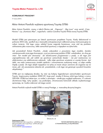 Toyota Motor Poland Co. LTD KOMUNIKAT PRASOWY 17 marca 2014 r. Aktor Antoni Pawlicki wybiera sportową Toyotę GT86 Aktor Antoni Pawlicki, znany z takich filmów jak „Papusza”, „Big Love” oraz seriali „Czas Honoru” czy „Komisarz Alex”, wyjechał z salonu Carolina Toyota Wola nową Toyotą GT86. Model GT86 jest pierwszym po latach sportowym projektem Toyoty. Kiedy debiutował w połowie 2012 roku, spotkał się z niezwykle entuzjastycznym odbiorem prasy motoryzacyjnej na całym świecie. Od tego czasu zdobył liczne nagrody branżowe, oraz stał się punktem odniesienia jako wzorcowy, lekki samochód sportowy z napędem na tylne koła. Jak powiedział Antoni Pawlicki, „kiedy usłyszałem o powstaniu tego modelu, bardzo zainteresowała mnie jego koncepcja, a już po pierwszej jeździe GT86 wiedziałem, że chcę go mieć. Ten model jest stworzony do dostarczania przyjemności z jazdy, a do tego jest zaprojektowany tak, jak robiło się sportowe samochody kiedyś - nie jest nastawiony na efekciarstwo czy elektroniczne zabawki, tylko daje sportowe wrażenia w czystej formie. Jest lekki, ma nisko umieszczony środek ciężkości i równomiernie rozłożoną masę, co daje wielką frajdę z jazdy. Do tego dzięki napędowi na tylną oś może służyć zarówno do ścigania się na torze, jak i do zawiezienia dziecka do przedszkola, a do tego nie generuje wysokich kosztów eksploatacji.” GT86 jest na najlepszej drodze, by stać się kolejny legendarnym samochodem sportowym Toyoty. Inspirowany modelem 2000 GT, kryje pod maską 2-litrowy silnik typu bokser o mocy 200 KM. GT86 kusi także tym, co widać z zewnątrz – atrakcyjny wygląd nadwozia, 17-calowe aluminiowe felgi, tylny spojler, czy podwójne, chromowane końcówki układu wydechowego sprawiają, że trudno oderwać od niego wzrok. Antoni Pawlicki wybrał model GT86 w wersji Prestige, z manualną skrzynią biegów. Fot. Paweł Peczyński Strona 1 z 1 Dział prasowy TMPL Robert Mularczyk (+48 22 549 06 75 ; +48 668 831 513) Maciej Gorzelak (+48 22 549 06 39 ; +48 660 480 334) E-mail: [email protected] Strona prasowa: www.toyotapr.pl TOYOTA MOTOR POLAND Co. LTD ul. Konstruktorska 5, 02-673 Warszawa