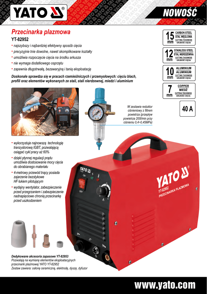 NOWOŚĆ Przecinarka plazmowa YT-82952 •najszybszy i najbardziej efektywny sposób cięcia •precyzyjnie tnie dowolne, nawet skomplikowane kształty •umożliwia rozpoczęcie cięcia na środku arkusza •nie wymaga dodatkowego osprzętu •zapewnia długotrwałą, bezawaryjną i tanią eksploatację Doskonale sprawdza się w pracach rzemieślniczych i przemysłowych: cięciu blach, profili oraz elementów wykonanych ze stali, stali nierdzewnej, miedzi i aluminium W zestawie reduktor ciśnieniowy z filtrem powietrza (przepływ powietrza 200l/min przy ciśnieniu 0,4~0,45MPa) •wykorzystuje najnowszą technologię tranzystorową IGBT, pozwalającą osiągać cykl pracy aż 60% •dzięki płynnej regulacji prądu umożliwia dostosowanie mocy cięcia do obrabianego materiału •4-metrowy przewód tnący posiada zajarzenie bezstykowe HF łukiem pilotującym •wydajny wentylator, zabezpieczenie przed przegrzaniem i zabezpieczenie nadnapięciowe chronią przecinarkę przed uszkodzeniem Dedykowane akcesoria zapasowe YT-82953 Pozwalają na wymianę elementów eksploatacyjnych przecinarki plazmowej YATO YT-82952 Zestaw zawiera: osłonę ceramiczną, elektrodę, dyszę, dyfuzor www.yato.com