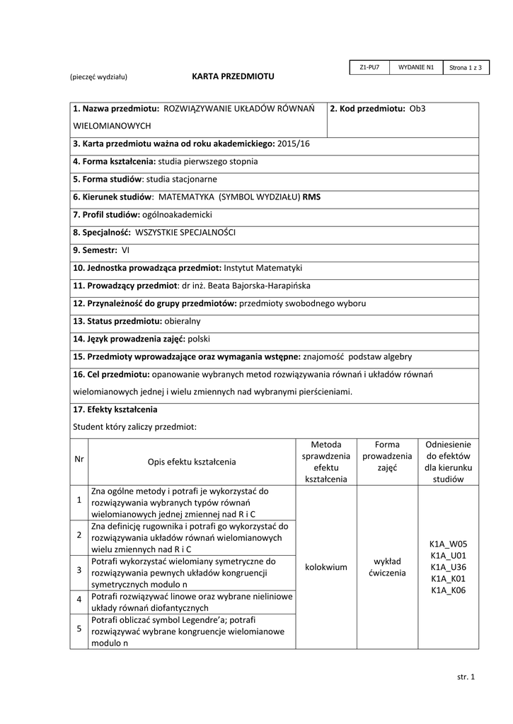 Z1-PU7 WYDANIE N1 Strona 1 z 3 KARTA PRZEDMIOTU (pieczęć wydziału) 1. Nazwa przedmiotu: ROZWIĄZYWANIE UKŁADÓW RÓWNAŃ 2. Kod przedmiotu: Ob3 WIELOMIANOWYCH 3. Karta przedmiotu ważna od roku akademickiego: 2015/16 4. Forma kształcenia: studia pierwszego stopnia 5. Forma studiów: studia stacjonarne 6. Kierunek studiów: MATEMATYKA (SYMBOL WYDZIAŁU) RMS 7. Profil studiów: ogólnoakademicki 8. Specjalność: WSZYSTKIE SPECJALNOŚCI 9. Semestr: VI 10. Jednostka prowadząca przedmiot: Instytut Matematyki 11. Prowadzący przedmiot: dr inż. Beata Bajorska-Harapińska 12. Przynależność do grupy przedmiotów: przedmioty swobodnego wyboru 13. Status przedmiotu: obieralny 14. Język prowadzenia zajęć: polski 15. Przedmioty wprowadzające oraz wymagania wstępne: znajomość podstaw algebry 16. Cel przedmiotu: opanowanie wybranych metod rozwiązywania równań i układów równań wielomianowych jednej i wielu zmiennych nad wybranymi pierścieniami. 17. Efekty kształcenia Student który zaliczy przedmiot: Nr 1 2 3 4 5 Opis efektu kształcenia Zna ogólne metody i potrafi je wykorzystać do rozwiązywania wybranych typów równań wielomianowych jednej zmiennej nad R i C Zna definicję rugownika i potrafi go wykorzystać do rozwiązywania układów równań wielomianowych wielu zmiennych nad R i C Potrafi wykorzystać wielomiany symetryczne do rozwiązywania pewnych układów kongruencji symetrycznych modulo n Potrafi rozwiązywać linowe oraz wybrane nieliniowe układy równań diofantycznych Potrafi obliczać symbol Legendre’a; potrafi rozwiązywać wybrane kongruencje wielomianowe modulo n Metoda sprawdzenia efektu kształcenia kolokwium Forma prowadzenia zajęć wykład ćwiczenia Odniesienie do efektów dla kierunku studiów K1A_W05 K1A_U01 K1A_U36 K1A_K01 K1A_K06 str. 1 18. Formy zajęć dydaktycznych i ich wymiar (liczba godzin) Wykład Ćwiczenia 30 30 Laboratorium Projekt Seminarium 19. Treści kształcenia: Wykład: Pierścienie wielomianów – podstawowe definicje i własności. Rugowniki i wyróżniki. Wielomiany symetryczne. Symbol Legendre’a. Wybrane metody rozwiązywania równań i układów równań wielomianowych jednej i wielu zmiennych nad R, C, Z i Zn. Ćwiczenia: praktyczna realizacja treści przedstawionych na wykładzie. 20. Egzamin: nie 21. Literatura podstawowa: (dowolne wydanie każdej pozycji) 1. J. Rutkowski, Algebra abstrakcyjna w zadaniach, PWN 2. A. Mostowski, M. Stark, Elementy algebry wyższej, PWN 3. W. Sierpiński, Teoria liczb (dostępna przez pldml.icm.edu.pl) 22. Literatura uzupełniająca: (dowolne wydanie każdej pozycji) 1. W. Narkiewicz, Teoria liczb, PWN 2. W. Sierpiński, Teoria liczb, część II, PWN 3. Z. Opial, Algebra wyższa, PWN 4. K. H. Rosen, Elementary number theory and its applications, Addison-Wesley (do dyspozycji prowadzącego) 23. Nakład pracy studenta potrzebny do osiągnięcia efektów kształcenia Lp. Forma zajęć Liczba godzin kontaktowych / pracy studenta 30/20 1 Wykład 2 Ćwiczenia 3 Laboratorium / 4 Projekt / 5 Seminarium / 6 Inne: / Suma godzin 30/40 60/60 24. Suma wszystkich godzin 120 25. Liczba punktów ECTS 4 26. Liczba punktów ECTS uzyskanych na zajęciach z bezpośrednim udziałem nauczyciela akademickiego 4 str. 2 27. Liczba punktów ECTS uzyskanych na zajęciach o charakterze 0 praktycznym (laboratoria, projekty) 28. Uwagi: Zasady oceniania: Kolokwium – 90 pkt Ogólna ocena z zajęć – 10 pkt Możliwe są również do zdobycia dodatkowe punkty za aktywność na wykładzie. Do uzyskania zaliczenia niezbędne jest zdobycie minimum 41 pkt, w tym co najmniej 30% punktów z każdej grupy zadań sprawdzających założone efekty kształcenia. Zatwierdzono: ……………………………. ………………………………………………… (data i podpis prowadzącego) (data i podpis dyrektora instytutu/kierownika katedry/ Dyrektora Kolegium Języków Obcych/kierownika lub dyrektora jednostki międzywydziałowej) str. 3