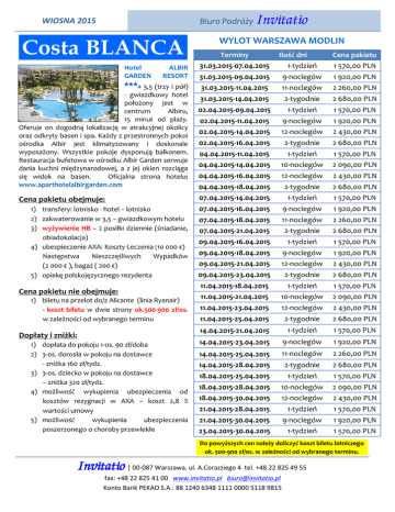 WIOSNA 2015 Biuro Podróży Costa BLANCA. Hotel GARDEN ALBIR RESORT ***+ 3,5 (trzy i pół) - gwiazdkowy hotel położony jest w centrum Albiru, 15 minut od plaży. Oferuje on dogodną lokalizację w atrakcyjnej okolicy oraz odkryty basen i spa. Każdy z przestronnych pokoi ośrodka Albir jest klimatyzowany i doskonale wyposażony. Wszystkie pokoje dysponują balkonem. Restauracja bufetowa w ośrodku Albir Garden serwuje dania kuchni międzynarodowej, a z jej okien rozciąga się widok na basen. Oficjalna strona hotelu: www.aparthotelalbirgarden.com Cena pakietu obejmuje: 1) transfery: lotnisko - hotel – lotnisko 2) zakwaterowanie w 3,5 – gwiazdkowym hotelu 3) wyżywienie HB – 2 posiłki dziennie (śniadanie, obiadokolacja) 4) ubezpieczenie AXA: Koszty Leczenia (10 000 €) Następstwa Nieszczęśliwych Wypadków (2 000 € ), bagaż ( 200 €) 5) opiekę polskojęzycznego rezydenta Cena pakietu nie obejmuje: 1) biletu na przelot do/z Alicante (linia Ryanair) - koszt biletu w dwie strony ok.500-900 zł/os. w zależności od wybranego terminu Dopłaty i zniżki: 1) dopłata do pokoju 1-os. 90 zł/doba 2) 3-os. dorosła w pokoju na dostawce - zniżka 160 zł/tydz. 3) 3-os. dziecko w pokoju na dostawce – zniżka 320 zł/tydz. 4) możliwość wykupienia ubezpieczenia od kosztów rezygnacji w AXA – koszt 2,8 % wartości umowy 5) możliwość wykupienia ubezpieczenia poszerzonego o choroby przewlekłe Invitatio WYLOT WARSZAWA MODLIN Terminy Ilość dni Cena pakietu 31.03.2015-07.04.2015 1-tydzień 1 570,00 PLN 31.03.2015-09.04.2015 31.03.2015-11.04.2015 9-noclegów 11-noclegów 1 920,00 PLN 2 260,00 PLN 31.03.2015-14.04.2015 2-tygodnie 2 680,00 PLN 02.04.2015-09.04.2015 1-tydzień 1 570,00 PLN 02.04.2015-11.04.2015 02.04.2015-14.04.2015 9-noclegów 12-noclegów 1 920,00 PLN 2 430,00 PLN 02.04.2015-16.04.2015 2-tygodnie 2 680,00 PLN 04.04.2015-11.04.2015 1-tydzień 1 570,00 PLN 04.04.2015-14.04.2015 10-noclegów 2 090,00 PLN 04.04.2015-16.04.2015 12-noclegów 2 430,00 PLN 04.04.2015-18.04.2015 2-tygodnie 2 680,00 PLN 07.04.2015-14.04.2015 1-tydzień 1 570,00 PLN 07.04.2015-16.04.2015 07.04.2015-18.04.2015 9-noclegów 11-noclegów 1 920,00 PLN 2 260,00 PLN 07.04.2015-21.04.2015 2-tygodnie 2 680,00 PLN 09.04.2015-16.04.2015 1-tydzień 1 570,00 PLN 09.04.2015-18.04.2015 09.04.2015-21.04.2015 9-noclegów 12-noclegów 1 920,00 PLN 2 430,00 PLN 09.04.2015-23.04.2015 2-tygodnie 2 680,00 PLN 11.04.2015-18.04.2015 11.04.2015-21.04.2015 1-tydzień 10-noclegów 1 570,00 PLN 2 090,00 PLN 11.04.2015-23.04.2015 12-noclegów 2 430,00 PLN 11.04.2015-25.04.2015 2-tygodnie 2 680,00 PLN 14.04.2015-21.04.2015 1-tydzień 1 570,00 PLN 14.04.2015-23.04.2015 9-noclegów 1 920,00 PLN 14.04.2015-25.04.2015 11-noclegów 2 260,00 PLN 14.04.2015-28.04.2015 18.04.2015-25.04.2015 2-tygodnie 1-tydzień 2 680,00 PLN 1 570,00 PLN 18.04.2015-28.04.2015 10-noclegów 2 090,00 PLN 18.04.2015-30.04.2015 12-noclegów 2 430,00 PLN 21.04.2015-28.04.2015 21.04.2015-30.04.2015 1-tydzień 9-noclegów 1 570,00 PLN 1 920,00 PLN 23.04.2015-30.04.2015 1-tydzień 1 570,00 PLN Do powyższych cen należy doliczyć koszt biletu lotniczego ok. 500-900 zł/os. w zależności od wybranego terminu. Invitatio | 00-087 Warszawa, ul. A.Corazziego 4 tel. +48 22 825 49 55 fax: +48 22 825 41 00 www.invitatio.pl [email protected] Konto Bank PEKAO S.A.: 88 1240 6348 1111 0000 5118 9815 WIOSNA 2015 Biuro Podróży Costa BLANCA. Hotel GRAN BALI **** 4-gwiazdkowy hotel położony w zatoczce Benidormu, bardzo blisko morza, z imponującymi widokami i niedaleko parku rozrywki Terra Mítica, jest najbardziej wyjątkowym na Costa Blanca. Zajmuje dwa budynki, z których jeden, liczący 186 metrów wysokości, jest jednym z najwyższych w Hiszpanii. Hotel posiada basen i duże jezioro o oryginalnym projekcie; dodatkowo jacuzzi pod gołym niebem, otoczone rozległą strefą solarium z hamakami i parasolami. Oficjalna strona hotelu: www.granhotelbali.com Cena pakietu obejmuje: 1) transfery: lotnisko - hotel – lotnisko 2) zakwaterowanie w 4–gwiazdkowym hotelu 3) pełne wyżywienie (śniadanie, obiad i kolacja) + ¼ l. wina i ¼ l. wody do obiadu i kolacji 4) ubezpieczenie AXA: Koszty Leczenia (10 000 €) Następstwa Nieszczęśliwych Wypadków (2 000 € ), bagaż ( 200 €) 5) opiekę polskojęzycznego rezydenta Cena pakietu nie obejmuje: 1) biletu na przelot do/z Alicante (linia Ryanair) - koszt biletu w dwie strony ok.500-900 zł/os. w zależności od wybranego terminu Dopłaty i zniżki: 1) dopłata do pokoju 1-os. 68 zł/doba 2) 3-os. dorosła w pokoju na dostawce - zniżka 120 zł/tydz. 3) 3-os. dziecko 2-12 lat w pokoju na dostawce – zniżka 480 zł/tydz. 4) możliwość wykupienia ubezpieczenia od kosztów rezygnacji w AXA – koszt 2,8 % wartości umowy 5) możliwość wykupienia ubezpieczenia poszerzonego o choroby przewlekłe Invitatio WYLOT WARSZAWA MODLIN Terminy 31.03.2015-07.04.2015 31.03.2015-09.04.2015 31.03.2015-11.04.2015 31.03.2015-14.04.2015 02.04.2015-09.04.2015 02.04.2015-11.04.2015 02.04.2015-14.04.2015 02.04.2015-16.04.2015 04.04.2015-11.04.2015 04.04.2015-14.04.2015 04.04.2015-16.04.2015 04.04.2015-18.04.2015 07.04.2015-14.04.2015 07.04.2015-16.04.2015 07.04.2015-18.04.2015 07.04.2015-21.04.2015 09.04.2015-16.04.2015 09.04.2015-18.04.2015 09.04.2015-21.04.2015 09.04.2015-23.04.2015 11.04.2015-18.04.2015 11.04.2015-21.04.2015 11.04.2015-23.04.2015 11.04.2015-25.04.2015 14.04.2015-21.04.2015 14.04.2015-23.04.2015 14.04.2015-25.04.2015 14.04.2015-28.04.2015 18.04.2015-25.04.2015 18.04.2015-28.04.2015 18.04.2015-30.04.2015 18.04.2015-02.05.2015 21.04.2015-28.04.2015 21.04.2015-30.04.2015 21.04.2015-02.05.2015 21.04.2015-05.05.2015 Ilość dni 1-tydzień 9-noclegów 11-noclegów 2-tygodnie 1-tydzień 9-noclegów 12-noclegów 2-tygodnie 1-tydzień 10-noclegów 12-noclegów 2-tygodnie 1-tydzień 9-noclegów 11-noclegów 2-tygodnie 1-tydzień 9-noclegów 12-noclegów 2-tygodnie 1-tydzień 10-noclegów 12-noclegów 2-tygodnie 1-tydzień 