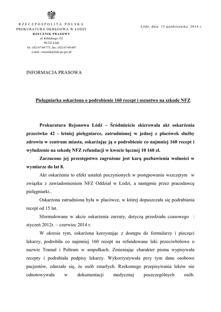 RZECZPOSPOLITA POLSKA PROKURATURA OKRĘGOWA W ŁODZI Łódź, dnia 15 października 2014 r. RZE CZNIK P RASOWY ul. Kilińskiego 152 90-322 Łódź tel.: (42) 67-68-771, fax.: (42) 67-68-607 e-mail : [email protected] INFORMACJA PRASOWA Pielęgniarka oskarżona o podrobienie 160 recept i oszustwo na szkodę NFZ Prokuratura Rejonowa Łódź – Śródmieście skierowała akt oskarżenia przeciwko 42 - letniej pielęgniarce, zatrudnionej w jednej z placówek służby zdrowia w centrum miasta, oskarżając ją o podrobienie co najmniej 160 recept i wyłudzenie na szkodę NFZ refundacji w kwocie łącznej 10 160 zł. Zarzucone jej przestępstwo zagrożone jest karą pozbawienia wolności w wymiarze do lat 8. Akt oskarżenia to efekt ustaleń poczynionych w postępowaniu wszczętym w związku z zawiadomieniem NFZ Oddział w Łodzi, a następnie przez pracodawcę pielęgniarki.. Oskarżona zatrudniona była w placówce, w której dopuszczała się podrabiania recept od 15 lat. Sformułowane w akcie oskarżenia zarzuty, dotyczą przedziału czasowego : styczeń 2012r. – czerwiec 2014 r. W okresie tym, oskarżona korzystając z dostępu do formularzy i pieczęci lekarzy, podrobiła co najmniej 160 recept na refundowane leki przeciwbólowe o nazwie Tramal i Poltram w ampułkach. Zmieniając charakter pisma wypisywała recepty i podrabiała podpisy lekarzy. Wykorzystywała przy tym dane osobowe pacjentów, zdarzało się, że osób zmarłych. Rzekomego przepisywania leków nie odnotowywała w dokumentacji medycznej poszczególnych osób. 2 Recepty realizowała następnie w czterech łódzkich aptekach. W śledztwie kobieta przyznała się do popełnienia zarzuconego czynu, wyjaśniając, że wykupione ampułki wykorzystywała na własne potrzeby, w związku z odczuwanymi dolegliwościami. Badający ją biegli, nie dopatrzyli się podstaw do kwestionowania jej poczytalności. Zadeklarowała chęć dobrowolnego poddania się karze. Uwzględniając jej stanowisko, prokurator wraz z aktem oskarżenia wniósł o wydanie wyroku skazującego bez przeprowadzenia rozprawy i orzeczenie kary 2 lat pozbawienia wolności z warunkowym zawieszeniem wykonania na 5 lat próby, grzywny oraz obowiązku naprawienia szkody w pełnej wysokości. Rzecznik Prasowy Prokuratury Okręgowej w Łodzi Krzysztof Kopania