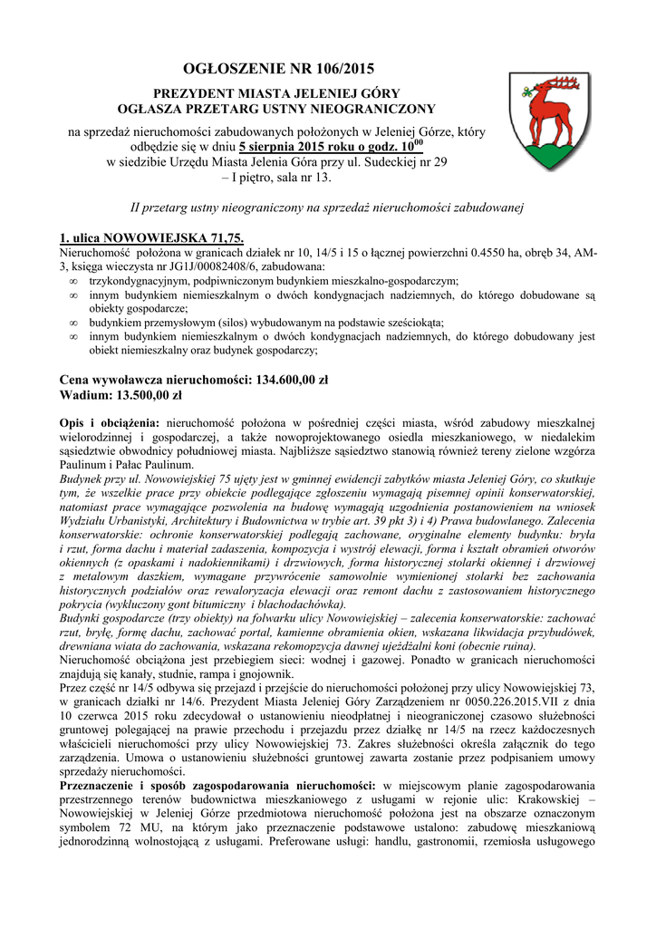 OGŁOSZENIE NR 106/2015 PREZYDENT MIASTA JELENIEJ GÓRY OGŁASZA PRZETARG USTNY NIEOGRANICZONY na sprzedaŜ nieruchomości zabudowanych połoŜonych w Jeleniej Górze, który odbędzie się w dniu 5 sierpnia 2015 roku o godz. 1000 w siedzibie Urzędu Miasta Jelenia Góra przy ul. Sudeckiej nr 29 – I piętro, sala nr 13. II przetarg ustny nieograniczony na sprzedaŜ nieruchomości zabudowanej 1. ulica NOWOWIEJSKA 71,75. Nieruchomość połoŜona w granicach działek nr 10, 14/5 i 15 o łącznej powierzchni 0.4550 ha, obręb 34, AM3, księga wieczysta nr JG1J/00082408/6, zabudowana: • trzykondygnacyjnym, podpiwniczonym budynkiem mieszkalno-gospodarczym; • innym budynkiem niemieszkalnym o dwóch kondygnacjach nadziemnych, do którego dobudowane są obiekty gospodarcze; • budynkiem przemysłowym (silos) wybudowanym na podstawie sześciokąta; • innym budynkiem niemieszkalnym o dwóch kondygnacjach nadziemnych, do którego dobudowany jest obiekt niemieszkalny oraz budynek gospodarczy; Cena wywoławcza nieruchomości: 134.600,00 zł Wadium: 13.500,00 zł Opis i obciąŜenia: nieruchomość połoŜona w pośredniej części miasta, wśród zabudowy mieszkalnej wielorodzinnej i gospodarczej, a takŜe nowoprojektowanego osiedla mieszkaniowego, w niedalekim sąsiedztwie obwodnicy południowej miasta. NajbliŜsze sąsiedztwo stanowią równieŜ tereny zielone wzgórza Paulinum i Pałac Paulinum. Budynek przy ul. Nowowiejskiej 75 ujęty jest w gminnej ewidencji zabytków miasta Jeleniej Góry, co skutkuje tym, Ŝe wszelkie prace przy obiekcie podlegające zgłoszeniu wymagają pisemnej opinii konserwatorskiej, natomiast prace wymagające pozwolenia na budowę wymagają uzgodnienia postanowieniem na wniosek Wydziału Urbanistyki, Architektury i Budownictwa w trybie art. 39 pkt 3) i 4) Prawa budowlanego. Zalecenia konserwatorskie: ochronie konserwatorskiej podlegają zachowane, oryginalne elementy budynku: bryła i rzut, forma dachu i materiał zadaszenia, kompozycja i wystrój elewacji, forma i kształt obramień otworów okiennych (z opaskami i nadokiennikami) i drzwiowych, forma historycznej stolarki okiennej i drzwiowej z metalowym daszkiem, wymagane przywrócenie samowolnie wymienionej stolarki bez zachowania historycznych podziałów oraz rewaloryzacja elewacji oraz remont dachu z zastosowaniem historycznego pokrycia (wykluczony gont bitumiczny i blachodachówka). Budynki gospodarcze (trzy obiekty) na folwarku ulicy Nowowiejskiej – zalecenia konserwatorskie: zachować rzut, bryłę, formę dachu, zachować portal, kamienne obramienia okien, wskazana likwidacja przybudówek, drewniana wiata do zachowania, wskazana rekomopzycja dawnej ujeŜdŜalni koni (obecnie ruina). Nieruchomość obciąŜona jest przebiegiem sieci: wodnej i gazowej. Ponadto w granicach nieruchomości znajdują się kanały, studnie, rampa i gnojownik. Przez część nr 14/5 odbywa się przejazd i przejście do nieruchomości połoŜonej przy ulicy Nowowiejskiej 73, w granicach działki nr 14/6. Prezydent Miasta Jeleniej Góry Zarządzeniem nr 0050.226.2015.VII z dnia 10 czerwca 2015 roku zdecydował o ustanowieniu nieodpłatnej i nieograniczonej czasowo słuŜebności gruntowej polegającej na prawie przechodu i przejazdu przez działkę nr 14/5 na rzecz kaŜdoczesnych właścicieli nieruchomości przy ulicy Nowowiejskiej 73. Zakres słuŜebności określa załącznik do tego zarządzenia. Umowa o ustanowieniu słuŜebności gruntowej zawarta zostanie przez podpisaniem umowy sprzedaŜy nieruchomości. Przeznaczenie i sposób zagospodarowania nieruchomości: w miejscowym planie zagospodarowania przestrzennego terenów budownictwa mieszkaniowego z usługami w rejonie ulic: Krakowskiej – Nowowiejskiej w Jeleniej Górze przedmiotowa nieruchomość połoŜona jest na obszarze oznaczonym symbolem 72 MU, na którym jako przeznaczenie podstawowe ustalono: zabudowę mieszkaniową jednorodzinną wolnostojącą z usługami. Preferowane usługi: handlu, gastronomii, rzemiosła usługowego nieuciąŜliwego. Termin zagospodarowania nieruchomości: 5 lat. Pierwszy przetarg ustny nieograniczony na zbycie ww. nieruchomości przeprowadzony został w dniu 10.06.2015 r. III przetarg ustny nieograniczony na sprzedaŜ nieruchomości zabudowanych. 2. ul. OSKARA LANGEGO 14. Nieruchomość zabudowana wykwaterowanym, wolnostojącym budynkiem mieszkalnym o dwóch kondygnacjach nadziemnych oraz jednokondygnacyjnym budynkiem niemieszkalnym wykorzystywanym wcześniej na cele gospodarcze, połoŜona w granicach działki nr 22/3 o powierzchni 0.2838 ha, obręb Cieplice V, AM 1, KW nr JG1J/00093811/4. Cena wywoławcza nieruchomości: 151.000,00 zł Wadium: 15.100,00 zł Opis i obciąŜenia: Nieruchomość połoŜona jest w Cieplicach, wśród zabudowy mieszkalnej wielorodzinnej i mieszkalno-usługowej. W dalszym sąsiedztwie zlokalizowany jest nowo wybudowany parking dla samochodów osobowych i autobusów wraz z węzłem sanitarnym. Budynek stanowił pierwotnie oranŜerię w zespole ogrodów uŜytkowych Schaffgotschów. Budynek przy ul. Oskara Langego 14 ujęty jest w gminnej ewidencji zabytków miasta Jeleniej Góry, co skutkuje tym, Ŝe wszelkie prace przy obiekcie podlegające zgłoszeniu wymagają pisemnej opinii konserwatorskiej, natomiast prace wymagające pozwolenia na budowę wymagają uzgodnienia postanowieniem na wniosek Wydziału Urbanistyki, Architektury i Budownictwa w trybie art. 39 pkt 3) i 4) Prawa budowlanego. Zalecenia konserwatorskie: opracować program uŜytkowy, częściowo nawiązujący do historycznej funkcji (obowiązkowe utrzymanie pomieszczenia dawnego salonu w środkowej części obiektu oraz przeszklonej, północnej części budynku o funkcji np. oranŜerii). Proponowane wpisanie obiektu do rejestru zabytków architektury oraz przeprowadzenia badań architektonicznych obiektu. Do zachowania: zwarta, dwukondygnacyjna, wydłuŜona bryła budynku, czterospadowy dach o ceramicznym pokryciu, symetryczny układ i prostoką