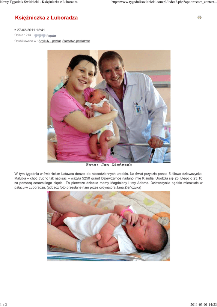 Nowy Tygodnik Świdnicki - KsięŜniczka z Luboradza 1z3 http://www.tygodnikswidnicki.com.pl/index2.php?option=com_content... KsięŜniczka z Luboradza z 27-02-2011 12:41 Opinie : 213 Opublikowane w : Artykuły - powiat, Starostwo powiatowe Foto: Jan Zieńczuk W tym tygodniu w świdnickim Latawcu doszło do niecodziennych urodzin. Na świat przyszła ponad 5-kilowa dziewczynka. Malutka – choć trudno tak napisać – waŜyła 5250 gram! Dziewczynce nadano imię Klaudia. Urodziła się 23 lutego o 23.10 za pomocą cesarskiego cięcia. To pierwsze dziecko mamy Magdaleny i taty Adama. Dziewczynka będzie mieszkała w pałacu w Luboradzu. (zobacz foto przesłane nam przez ordynatora Jana Zieńczuka) 2011-03-01 14:23 Nowy Tygodnik Świdnicki - KsięŜniczka z Luboradza 2z3 http://www.tygodnikswidnicki.com.pl/index2.php?option=com_content... Komentarze uŜytkowników Średnia ocena uŜytkownika (0 głos) PokaŜ 4 z 4 komentarzy 1. 27-02-2011 15:10 gratulacje dla rodziców i wiele radości dla córeczki !! Gość » Odpowiedz na komentarz... 2. 27-02-2011 15:14 Piękna mama - piękna princessa. Nie ma to jak Polki. 2011-03-01 14:23 Nowy Tygodnik Świdnicki - KsięŜniczka z Luboradza 3z3 http://www.tygodnikswidnicki.com.pl/index2.php?option=com_content... Gość » Odpowiedz na komentarz... » Zobacz wszystkie 1 odpowiedzi 3. 28-02-2011 16:12 zapomnieli dodać Ŝe ma 62cm długości duŜa po tacie:D Jestem dumny z córeczki i Ŝony Gość » Odpowiedz na komentarz... 4. 28-02-2011 17:13 Nasza Kasia jako noworodek mierzyła teŜ 62 cm, teraz ma 184 . Klaudia ma tak znakomite warunki, Ŝe kiedyś moŜe sięgnie po olimpijskie złoto i naleŜałoby wcześnie o tym pomyśleć. Gratulacje!!! Gość » Odpowiedz na komentarz... PokaŜ 4 z 4 komentarzy Dodaj swój komentarz mXcomment 1.0.7.::.Polish Version - JoomlaPL.com Team © 2007-2011 - visualclinic.fr License Creative Commons - Some rights reserved Zamknij okno 2011-03-01 14:23