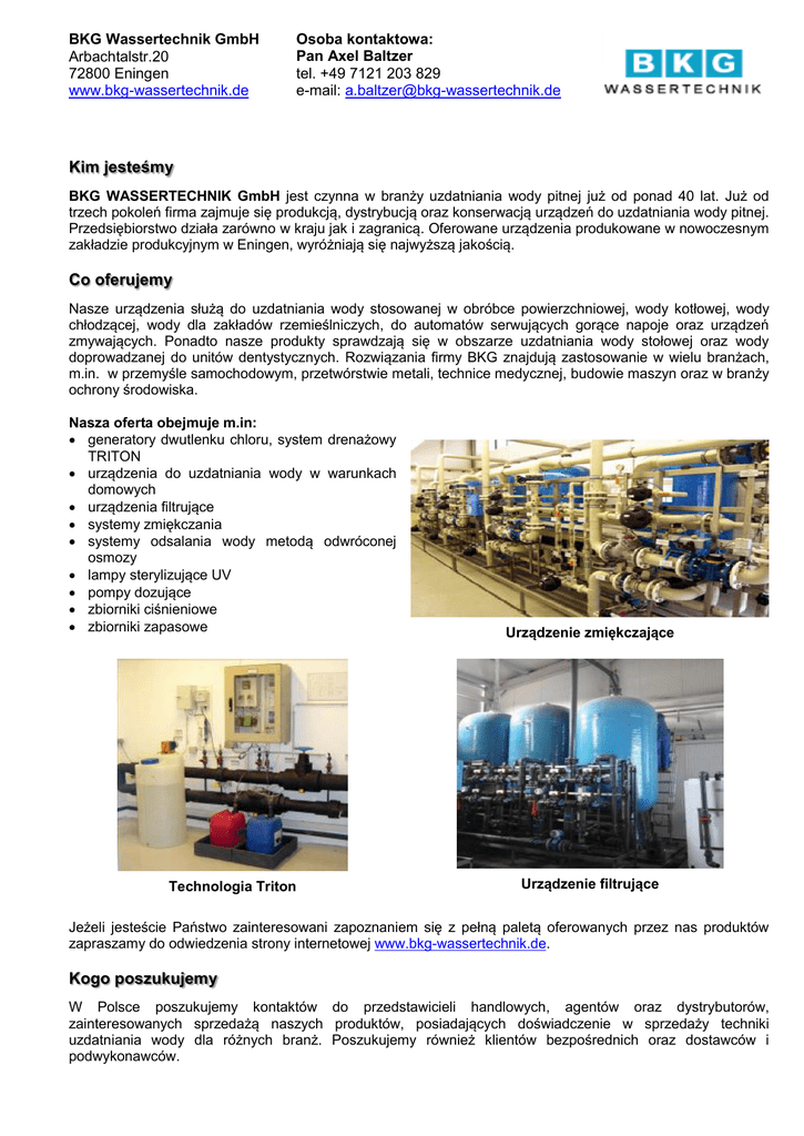 BKG Wassertechnik GmbH Arbachtalstr.20 72800 Eningen www.bkg-wassertechnik.de Osoba kontaktowa: Pan Axel Baltzer tel. +49 7121 203 829 e-mail: [email protected] Kim jesteśmy BKG WASSERTECHNIK GmbH jest czynna w branży uzdatniania wody pitnej już od ponad 40 lat. Już od trzech pokoleń firma zajmuje się produkcją, dystrybucją oraz konserwacją urządzeń do uzdatniania wody pitnej. Przedsiębiorstwo działa zarówno w kraju jak i zagranicą. Oferowane urządzenia produkowane w nowoczesnym zakładzie produkcyjnym w Eningen, wyróżniają się najwyższą jakością. Co oferujemy Nasze urządzenia służą do uzdatniania wody stosowanej w obróbce powierzchniowej, wody kotłowej, wody chłodzącej, wody dla zakładów rzemieślniczych, do automatów serwujących gorące napoje oraz urządzeń zmywających. Ponadto nasze produkty sprawdzają się w obszarze uzdatniania wody stołowej oraz wody doprowadzanej do unitów dentystycznych. Rozwiązania firmy BKG znajdują zastosowanie w wielu branżach, m.in. w przemyśle samochodowym, przetwórstwie metali, technice medycznej, budowie maszyn oraz w branży ochrony środowiska. Nasza oferta obejmuje m.in: generatory dwutlenku chloru, system drenażowy TRITON urządzenia do uzdatniania wody w warunkach domowych urządzenia filtrujące systemy zmiękczania systemy odsalania wody metodą odwróconej osmozy lampy sterylizujące UV pompy dozujące zbiorniki ciśnieniowe zbiorniki zapasowe Urządzenie zmiękczające Technologia Triton Urządzenie filtrujące Jeżeli jesteście Państwo zainteresowani zapoznaniem się z pełną paletą oferowanych przez nas produktów zapraszamy do odwiedzenia strony internetowej www.bkg-wassertechnik.de. Kogo poszukujemy W Polsce poszukujemy kontaktów do przedstawicieli handlowych, agentów oraz dystrybutorów, zainteresowanych sprzedażą naszych produktów, posiadających doświadczenie w sprzedaży techniki uzdatniania wody dla różnych branż. Poszukujemy również klientów bezpośrednich oraz dostawców i podwykonawców.