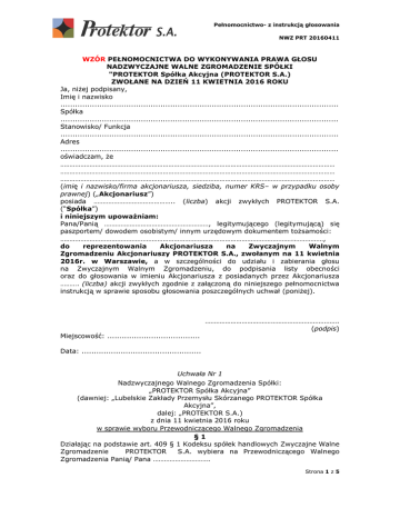 Pełnomocnictwo- z instrukcją głosowania NWZ PRT 20160411 WZÓR PEŁNOMOCNICTWA DO WYKONYWANIA PRAWA GŁOSU NADZWYCZAJNE WALNE ZGROMADZENIE SPÓŁKI "PROTEKTOR Spółka Akcyjna (PROTEKTOR S.A.) ZWOŁANE NA DZIEŃ 11 KWIETNIA 2016 ROKU Ja, niżej podpisany, Imię i nazwisko .................................................................................................................. Spółka .................................................................................................................. Stanowisko/ Funkcja .................................................................................................................. Adres .................................................................................................................. oświadczam, że …………………………………………………………………………………………………………………………………… …………………………………………………………………………………………………………………………………… …………………………………………………………………………………………………………………………………… (imię i nazwisko/firma akcjonariusza, siedziba, numer KRS– w przypadku osoby prawnej) („Akcjonariusz”) posiada …………………………………….. (liczba) akcji zwykłych PROTEKTOR S.A. (“Spółka”) i niniejszym upoważniam: Pana/Panią …………………………………………………, legitymującego (legitymującą) się paszportem/ dowodem osobistym/ innym urzędowym dokumentem tożsamości: ………………………………………………………………………………………………………………..……………, do reprezentowania Akcjonariusza na Zwyczajnym Walnym Zgromadzeniu Akcjonariuszy PROTEKTOR S.A., zwołanym na 11 kwietnia 2016r. w Warszawie, a w szczególności do udziału i zabierania głosu na Zwyczajnym Walnym Zgromadzeniu, do podpisania listy obecności oraz do głosowania w imieniu Akcjonariusza z posiadanych przez Akcjonariusza ………. (liczba) akcji zwykłych zgodnie z załączoną do niniejszego pełnomocnictwa instrukcją w sprawie sposobu głosowania poszczególnych uchwał (poniżej). ………………………………………………………………. (podpis) Miejscowość: ...................................... Data: ................................................. Uchwała Nr 1 Nadzwyczajnego Walnego Zgromadzenia Spółki: „PROTEKTOR Spółka Akcyjna” (dawniej: „Lubelskie Zakłady Przemysłu Skórzanego PROTEKTOR Spółka Akcyjna”, dalej: „PROTEKTOR S.A.) z dnia 11 kwietnia 2016 roku w sprawie wyboru Przewodniczącego Walnego Zgromadzenia §1 Działając na podstawie art. 409 § 1 Kodeksu spółek handlowych Zwyczajne Walne Zgromadzenie PROTEKTOR S.A. wybiera na Przewodniczącego Walnego Zgromadzenia Panią/ Pana …………………………. Strona 1 z 5 Pełnomocnictwo- z instrukcją głosowania NWZ PRT 20160411 §2 Uchwała wchodzi w życie z dniem podjęcia. Głos „za” ……………………….. (ilość głosów) Głos „przeciw” ……………………….. (ilość głosów) Głos „wstrzymujący się” ……………………….. (ilość głosów) Głosowanie poprzez zaznaczenie odpowiedniej rubryki krzyżykiem („X”) Zgłoszenie sprzeciwu do uchwały: TAK/NIE *) Treść sprzeciwu i jego uzasadnienie*) …………………………………………………………………………………………………………………………………… …………………………………………………………………………………………………………………………………… …………………………………………………………………………………………………………………………………… …………………………………………………………………………………………………………………………………… Instrukcja dotycząca sposobu głosowania przez Pełnomocnika w sprawie podjęcia przedmiotowej uchwały: Treść instrukcji *) …………………………………………………………………………………………………………………………………… …………………………………………………………………………………………………………………………………… …………………………………………………………………………………………………………………………………… …………………………………………………………………………………………………………………………………… *)niepotrzebne skreślić Uchwała Nr 2 Nadzwyczajnego Walnego Zgromadzenia Spółki: „PROTEKTOR Spółka Akcyjna” (dawniej: „Lubelskie Zakłady Przemysłu Skórzanego PROTEKTOR Spółka Akcyjna”, dalej: „PROTEKTOR S.A.) z dnia 11 kwietnia 2016 roku w sprawie porządku obrad Walnego Zgromadzenia §1 Walne Zgromadzenie PROTEKTOR S.A. przyjmuje porządek obrad w brzmieniu zgodnym z porządkiem ogłoszonym przez PROTEKTOR S.A. raportem bieżącym w dniu 11 marca 2016 roku. §2 Uchwała wchodzi w życie z dniem podjęcia. Głos „za” ……………………….. (ilość głosów) Głos „przeciw” ……………………….. (ilość głosów) Głos „wstrzymujący się” ……………………….. (ilość głosów) Głosowanie poprzez zaznaczenie odpowiedniej rubryki krzyżykiem („X”) Strona 2 z 5 Pełnomocnictwo- z instrukcją głosowania NWZ PRT 20160411 Zgłoszenie sprzeciwu do uchwały: TAK/NIE *) Treść sprzeciwu i jego uzasadnienie*) …………………………………………………………………………………………………………………………………… …………………