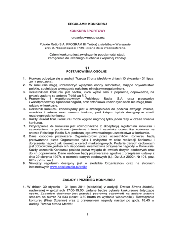 REGULAMIN KONKURSU KONKURS SPORTOWY organizowanego przez: Polskie Radio S.A. PROGRAM III (Trójka) z siedzibą w Warszawie przy al. Niepodległości 77/85 (zwaną dalej Organizatorem). Celem konkursu jest zwiększenie popularności stacji, zachęcenie do uważnego słuchania i wspólnej zabawy. §1 POSTANOWIENIA OGÓLNE 1. 2. 3. 4. 5. 6. 7. 8. 9. Konkurs odbędzie się w audycji Trzecia Strona Medalu w dniach 30 stycznia – 31 lipca 2011 (niedziela). W konkursie mogą uczestniczyć wyłącznie osoby pełnoletnie, mające obywatelstwo polskie, spełniające wymagania nałożone niniejszym regulaminem. Uczestnikiem konkursu jest osoba, która wyśle sms z poprawną odpowiedzią na pytanie zadane na antenie Trójki wg § 2. Pracownicy i współpracownicy Polskiego Radia S.A. oraz pracownicy i współpracownicy Sponsora nagród, oraz członkowie rodzin tych osób nie mogą brać udziału w konkursie. Uczestnik konkursu zobowiązany jest w szczególności do podania swojego imienia, nazwiska i adresu oraz numeru telefonu, pod którym będzie dostępny w chwili rozstrzygnięcia konkursu. Każdy laureat finału konkursu może wygrać nagrodę tylko jeden razy w czasie trwania konkursu. Przystąpienie do konkursu jest równoznaczne z akceptacją regulaminu konkursu i zezwoleniem na publiczne ujawnienie imienia i nazwiska uczestnika konkursu na antenie Polskiego Radia S.A. podczas jego ewentualnego uczestnictwa w konkursie. Dane osobowe przekazane Organizatorowi przez uczestników Konkursu będą przetwarzane przez Organizatora tylko i wyłącznie w celu: realizacji Konkursu i doręczenia nagród, jak również w celach marketingowych. Podanie danych osobowych jest dobrowolne, jednak ich niepodanie uniemożliwia otrzymanie nagrody w Konkursie. Każdy uczestnik Konkursu posiada prawo wglądu do swoich danych osobowych oraz do ich poprawiania. Dane osobowe będą przetwarzane zgodnie z przepisami ustawy z dnia 29 sierpnia 1997r. o ochronie danych osobowych (t.j.: Dz.U. z 2002r. Nr 101, poz. 926 z późn. zm.) Niniejszy regulamin dostępny jest w siedzibie Organizatora oraz na stronach internetowych www.polskieradio.pl/trojka §2 ZASADY I PRZEBIEG KONKURSU 1. W dniach 30 stycznia – 31 lipca 2011 (niedziela) w audycji Trzecia Strona Medalu, nadawanej w godzinach 17.00-19.00, zadane będzie pytanie konkursowe dotyczące sportu. Zadaniem słuchaczy jest przesłać poprawną odpowiedź na zadane pytanie sms-em na numer 73 533 (koszt: 3,69 brutto za wysłanie wiadomości). Rozwiązanie konkursu (Finał Dzienny) wraz z przyznaniem nagrody nastąpi po godz. 18.45 w audycji Trzecia Strona Medalu 1 2. Nagroda zostanie przyznana Finaliście wyłonionemu spośród wszystkich uczestników konkursu danego dnia (wg § 2 Etap II). 3. Wysłanie sms-a jest równoznaczne ze zgłoszeniem przez Uczestnika chęci wzięcia udziału w konkursie oraz akceptacji postanowień niniejszego Regulaminu. 4. W konkursie nie są brane pod uwagę sms-y wysyłane przez Internet. 5. Każdy Uczestnik konkursu może wziąć udział w konkursie dowolną liczbę razy. 6. Konkurs składa się z dwóch etapów: I Etap a) polega na wysłaniu przez Słuchacza odpowiedzi SMSem pod numer 73 533 (koszt: 3,69 brutto za wysłanie wiadomości) na zadane w audycji Trzecia Strona Medalu pytanie. b) Zgłoszenia sms-owe przyjmowane są od momentu zadania pytania na antenie w audycji Trzecia Strona Medalu. II Etap a) W dniach 30 stycznia – 31 lipca 2011 (niedziela) ok. godz. 18.45, w audycji Trzecia Strona Medalu rozgrywane są Finały Konkursu. b) Uczestnicy którzy wysłali prawidłowo sms z poprawną odpowiedzią na zadane pytanie konkursowe biorą udział w Finale konkursu. c) Finał konkursu przeprowadzi Redaktor Prowadzący audycję Trzecia Strona Medalu, zwany dalej Prowadzącym. d) W Finale Konkursu bierze udział 1 osoba (Finalista) wyłoniona przez Prowadzącego spośród wszystkich Uczestników konkursu danego dnia. Finalistą jest osoba, która nadesłała SMS-a o godzinie 18:17:00 lub najbliżej tej godziny. Czas nadesłania SMSow mierzony jest przez komputerowy system zegarowy integratora. W przypadku gdy treść wybranego do finału dnia sms-a jest niepoprawna, Finalistą jest nadawca kolejnego sms-a. e) Prowadzący podejmuje próby połączenia telefonicznego z Finalistą zgodnie z pkt f) f) Próba uzyskania połączenia z Finalistą podejmowana jest nie więcej niŻ dwukrotnie przy czym za każdym razem oczekiwanie na połączenie nie może przekroczyć sześciu sygnałów przy sygnale braku odpowiedzi ze strony uczestnika połączenia i czterech sekund przy sygnale zajętości. W przypadku braku Żadnego z wyżej wymienionych sygnałów w ciągu pięciu sekund od chwili gdy zakończono wybieranie numeru, próbę tę ponawia się, nie więcej jednak niż dwukrotnie. W przypadku rozłączenia w trakcie rozmowy próba ponownego połączenia podejmowana jest według wyżej opisanej procedury. g) W chwili uzyskania połączenia z Finalistą podaje on Prowadzącemu swoje imię i nazwisko. Weryfikacja prawa udziału Finalisty w konkursie odbywa się poprzez sprawdzenie zgodności danych tej osoby przez Prowadzącego. h) O zwycięstwie i przyznaniu nagrody decyduje udzielenie prawidłowej odpowiedzi na zadane pytanie. i) Jeżeli pomimo prawidłowego wykonania próby zrealizowania połączenia telefonicznego, połączenia z daną osobą nie uda się uzyskać, osoba ta nie bierze dalszego udziału w Finale dnia konkursu. j) W przypadku określonym w pkt h wybrany zostaje, kolejny Finalista dnia, który spełnił warunki Regulaminu i procedura określona w pkt c)-h) jest powtarzana aż do wyłonienia zwycięzcy Finału dziennego §3 NAGRODY 2 1. Nagrodą w konkursie jest jedna para butów do biegania marki Asics. Cena jednostkowa 1 pary butów wynosi 365 zł netto (słownie: trzysta sześćdziesiąt pięć złotych netto) + obowiązująca stawka VAT. Buty będą dostępne w rozmiarach: modele damskie od 6 (37) do 10 (42,5), modele męskie od