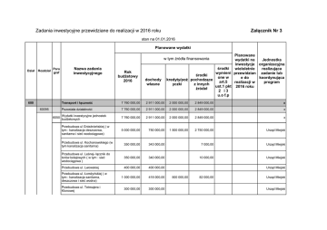Zadania inwestycyjne przewidziane do realizacji w 2016 roku Załącznik Nr 3 stan na 01.01.2016 Planowane wydatki Planowane wydatki na Jednostka inwestycje organizacyjna środki wieloletnie realizująca wymieni przewidzian zadanie lub środki one w e do koordynująca kredyty/poż pochodzące art.5 realizacji w program yczki z innych ust.1 pkt 2016 roku źródeł 2 i3 u.o f.p w tym źródła finansowania Dział Rozdział Para graf 600 60095 6050 Nazwa zadania inwestycyjnego Rok budżetowy 2016 dochody własne Transport i łączność 7 760 000,00 2 911 000,00 2 000 000,00 2 849 000,00 x Pozostała działalność 7 760 000,00 2 911 000,00 2 000 000,00 2 849 000,00 x Wydatki inwestycyjne jednostek budżetowych 7 760 000,00 2 911 000,00 2 000 000,00 2 849 000,00 x Przebudowa ul Gnieźnieńskiej ( w tym : kanalizacja deszczowa, sanitarna i sieć wodociągowa) 5 000 000,00 750 000,00 1 500 000,00 2 750 000,00 Urząd Miejski Przebudowa ul. Kochanowskiego (w tym kanalizacja sanitarna) 350 000,00 343 000,00 7 000,00 Urząd Miejski Przebudowa ul. Leśnej- łącznik do torów kolejowych ( w tym : sieć wodociągowa ) 350 000,00 340 000,00 10 000,00 Urząd Miejski Przebudowa ul. Lwowskiej 400 000,00 400 000,00 1 000 000,00 418 000,00 300 000,00 300 000,00 Przebudowa ul. Łomżyńskiej ( w tym : kanalizacja sanitarna, deszczowa i sieć wodna) Przebudowa ul. Tetmajera i Klonowej Urząd Miejski 500 000,00 82 000,00 Urząd Miejski Urząd Miejski Przebudowa ul. Wasińskiego – dokumentacja 30 000,00 30 000,00 Urząd Miejski Przebudowa ul. Lanca – dokumentacja 50 000,00 50 000,00 Urząd Miejski Przebudowa ul. Korczaka – dokumentacja 30 000,00 30 000,00 Urząd Miejski 250 000,00 250 000,00 Administracja publiczna 13 000,00 13 000,00 Urzędy Miast, Gmin 13 000,00 13 000,00 Wydatki inwestycyjne jednostek budżetowych 13 000,00 13 000,00 Zakup licencji WinSer CAL 2012 13 000,00 13 000,00 Ochrona zdrowia 50 000,00 50 000,00 x Przeciwdziałanie alkoholizmowi 50 000,00 50 000,00 x Wydatki inwestycyjne jednostek budżetowych 50 000,00 50 000,00 x Monitoring 50 000,00 50 000,00 Urząd Miejski 1 680 500,00 1 567 440,00 Oświetlenie ulic, placów i dróg 350 000,00 350 000,00 Wydatki inwestycyjne jednostek budżetowych 350 000,00 350 000,00 Przebudowa systemu oświetlenia 350 000,00 350 000,00 Pozostała działalność 1 330 500,00 1 217 440,00 113 060,00 x Wydatki inwestycyjne jednostek budżetowych 1 330 500,00 1 217 440,00 113 060,00 x Przebudowa ul. Żeromskiego 750 75023 6060 851 85154 6050 Gospodarka komunalna i ochrona środowiska 900 90015 6050 90095 6050 113 060,00 x 300 000,00 Urząd Miejski 921 92114 6050 Budowa placu zabaw przy ul. Leśnej i na Małej Bieli 200 000,00 200 000,00 Urząd Miejski Budownictwo mieszkaniowe przy ul. Sobieszczańskiego 120 000,00 120 000,00 Urząd Miejski Termomodernizacja obiektów użyteczności publicznej 130 000,00 130 000,00 Urząd Miejski Kanalizacja deszczowa w ulicy Chrobrego do ul. Skłodowskiej 400 000,00 329 440,00 70 560,00 Urząd Miejski Kanalizacja sanitarna i sieć wodociągowa osiedle Kochanowskiego I etap 430 500,00 388 000,00 42 500,00 Urząd Miejski Zagospodarowanie turystyczne jezior w szczytnie 50 000,00 50 000,00 Urząd Miejski Kultura i ochrona dziedzictwa narodowego 150 000,00 150 000,00 x Pozostałe instytucje kultury 150 000,00 150 000,00 Wydatki inwestycyjne jednostek budżetowych 150 000,00 150 000,00 Budowa i wyposażenie Centrum Nauki Innopolice w Szczytnie 150 000,00 150 000,00 9 653 500,00 4.691 440,00 Razem Urząd Miejski 2 000 000,00 2 962 060,00 0,00 300 000,00 x