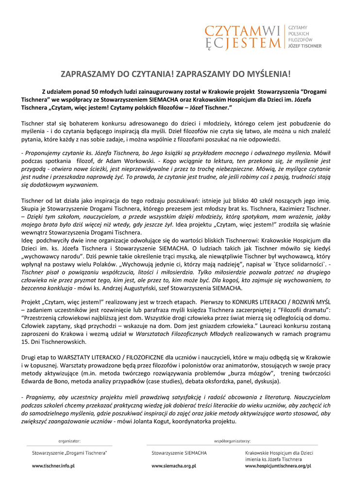 ZAPRASZAMY DO CZYTANIA! ZAPRASZAMY DO MYŚLENIA! Z udziałem ponad 50 młodych ludzi zainaugurowany został w Krakowie projekt Stowarzyszenia “Drogami Tischnera” we współpracy ze Stowarzyszeniem SIEMACHA oraz Krakowskim Hospicjum dla Dzieci im. Józefa Tischnera „Czytam, więc jestem! Czytamy polskich filozofów – Józef Tischner.” Tischner stał się bohaterem konkursu adresowanego do dzieci i młodzieży, którego celem jest pobudzenie do myślenia - i do czytania będącego inspiracją dla myśli. Dzieł filozofów nie czyta się łatwo, ale można u nich znaleźć pytania, które każdy z nas sobie zadaje, i można wspólnie z filozofami poszukać na nie odpowiedzi. - Proponujemy czytanie ks. Józefa Tischnera, bo Jego książki są przykładem mocnego i odważnego myślenia. Mówił podczas spotkania filozof, dr Adam Workowski. - Kogo wciągnie ta lektura, ten przekona się, że myślenie jest przygodą - otwiera nowe ścieżki, jest nieprzewidywalne i przez to trochę niebezpieczne. Mówią, że myślące czytanie jest nudne i przeszkadza naprawdę żyć. To prawda, że czytanie jest trudne, ale jeśli robimy coś z pasją, trudności stają się dodatkowym wyzwaniem. Tischner od lat działa jako inspiracja do tego rodzaju poszukiwań: istnieje już blisko 40 szkół noszących jego imię. Skupia je Stowarzyszenie Drogami Tischnera, którego prezesem jest młodszy brat ks. Tischnera, Kazimierz Tischner. – Dzięki tym szkołom, nauczycielom, a przede wszystkim dzięki młodzieży, którą spotykam, mam wrażenie, jakby mojego brata było dziś więcej niż wtedy, gdy jeszcze żył. Idea projektu „Czytam, więc jestem!” zrodziła się właśnie wewnątrz Stowarzyszenia Drogami Tischnera. Ideę podchwyciły dwie inne organizacje odwołujące się do wartości bliskich Tischnerowi: Krakowskie Hospicjum dla Dzieci im. ks. Józefa Tischnera i Stowarzyszenie SIEMACHA. O ludziach takich jak Tischner mówiło się kiedyś „wychowawcy narodu”. Dziś pewnie takie określenie trąci myszką, ale niewątpliwie Tischner był wychowawcą, który wpłynął na postawy wielu Polaków. „Wychowują jedynie ci, którzy mają nadzieję”, napisał w `Etyce solidarności`. Tischner pisał o powiązaniu współczucia, litości i miłosierdzia. Tylko miłosierdzie pozwala patrzeć na drugiego człowieka nie przez pryzmat tego, kim jest, ale przez to, kim może być. Dla kogoś, kto zajmuje się wychowaniem, to bezcenna konkluzja - mówi ks. Andrzej Augustyński, szef Stowarzyszenia SIEMACHA. Projekt „Czytam, więc jestem!” realizowany jest w trzech etapach. Pierwszy to KONKURS LITERACKI / ROZWIŃ MYŚL – zadaniem uczestników jest rozwinięcie lub parafraza myśli księdza Tischnera zaczerpniętej z “Filozofii dramatu”: “Przestrzenią człowiekowi najbliższą jest dom. Wszystkie drogi człowieka przez świat mierzą się odległością od domu. Człowiek zapytany, skąd przychodzi – wskazuje na dom. Dom jest gniazdem człowieka.” Laureaci konkursu zostaną zaproszeni do Krakowa i wezmą udział w Warsztatach Filozoficznych Młodych realizowanych w ramach programu 15. Dni Tischnerowskich. Drugi etap to WARSZTATY LITERACKO / FILOZOFICZNE dla uczniów i nauczycieli, które w maju odbędą się w Krakowie i w Łopusznej. Warsztaty prowadzone będą przez filozofów i polonistów oraz animatorów, stosujących w swoje pracy metody aktywizujące (m.in. metoda twórczego rozwiązywania problemów „burza mózgów”, trening twórczości Edwarda de Bono, metoda analizy przypadków (case studies), debata oksfordzka, panel, dyskusja). - Pragniemy, aby uczestnicy projektu mieli prawdziwą satysfakcję i radość obcowania z literaturą. Nauczycielom podczas szkoleń chcemy przekazać praktyczną wiedzę jak dobierać treści literackie do wieku uczniów, aby zachęcić ich do samodzielnego myślenia, gdzie poszukiwać inspiracji do zajęć oraz jakie metody aktywizujące warto stosować, aby zwiększyć zaangażowanie uczniów - mówi Jolanta Kogut, koordynatorka projektu. Trzeci etap projektu otwarty jest dla publiczności. Organizatorzy zapraszają na prawdziwe święto literatury FESTIWAL LITERACKI / „CZYTAM, WIĘC JESTEM!”, który odbędzie się w Krakowie w dniach 20-21 czerwca. W programie przewidziano m.in. grę miejską, prezentacje filmowe, spotkania z pisarzami, debaty oksfordzkie, warsztaty filozoficzne dla przedszkolaków, koncerty. UCZESTNICY SPOTKANIA: Jolanta Kogut kulturoznawca, pedagog, animator kultury, współpracownik Wydawnictwa Znak oraz Uniwersytetu Papieskiego Jana Pawła II w Krakowie – współautorka i manager projektu. Wojciech Bonowicz pisarz, poeta, biograf ks. profesora Józefa Tischnera, członek Rady Programowej Instytutu Myśli Józefa Tischnera – współautor projektu. Podczas briefingu reprezentuje również Stowarzyszenie “Drogami Tischnera”, głównego organizatora projektu. Adam Maciej Cieśla prezes Zarządu Krakowskiego Hospicjum dla Dzieci im. ks. Józefa Tischnera, obejmującego kompleksową opieką lekarską, pielęgniarską, rehabilitacyjną, socjalną i psychologiczną dzieci do lat 18 oraz ich rodziny. Hospicjum jest partnerem projektu. Dominik Rogóż Członek Zarządu Stowarzyszenia SIEMACHA, które od ponad 20 lat w całej Polsce prowadzi nowatorskie placówki wychowawcze, terapeutyczne i sportowe. dr Adam Workowski filozof, współzałożyciel i członek Rady Programowej Instytutu Myśli Józefa Tischnera, adiunkt na Uniwersytecie Papieskim Jana Pana II - współautor projektu. Kontakt dla mediów: Stowarzyszenie Drogami Tischnera Jolanta Kogut e-mail: [email protected] PROJEKT „CZYTAM, WIĘC JESTEM”. CZYTAMY POLSKICH FILOZOFÓW – JÓZEF TISCHNER” REALIZOWANY JEST PRZY FINANSOWYM WSPARCIU MINISTERSTWA KULTURY I DZIEDZICTWA NARODOWEGO.
